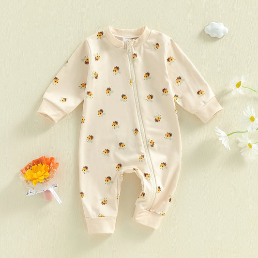 Baby Boy Girl Zipper Romper Crew Neck Long Sleeve Cute Bee Print Zip Up Jumpsuit