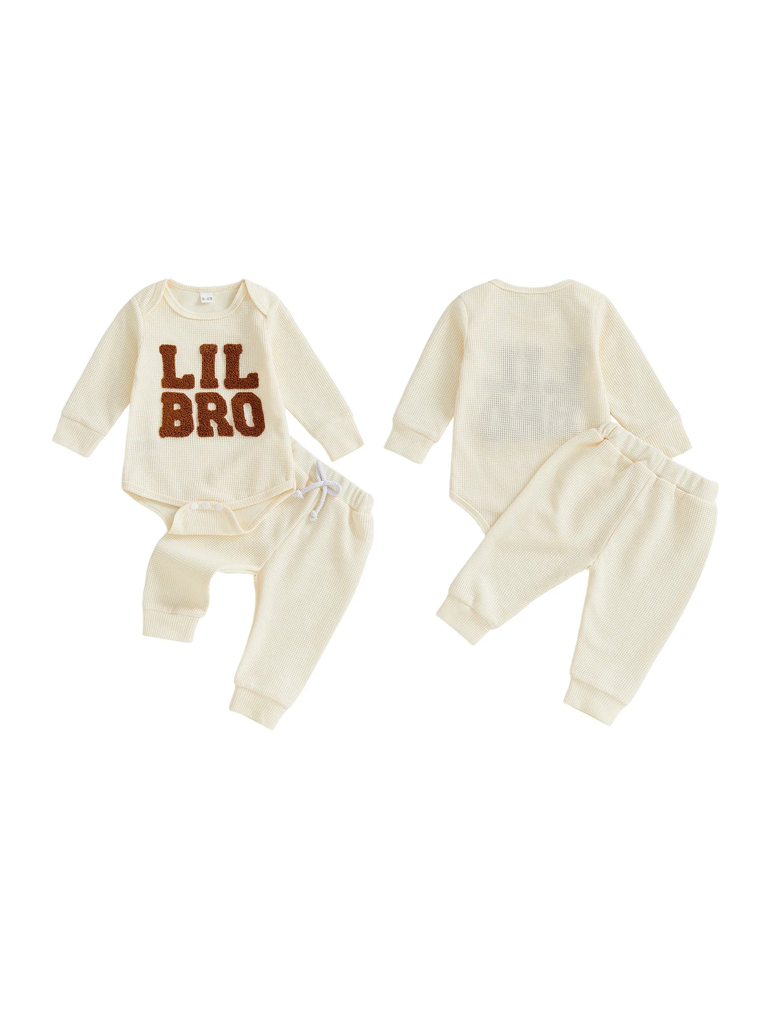 Baby Boy 2Pcs Lil Bro Outfit Waffle Letter Embroidered Ribbed Crew Neck Long Sleeve Romper and Jogger Pants 2 Pcs Set