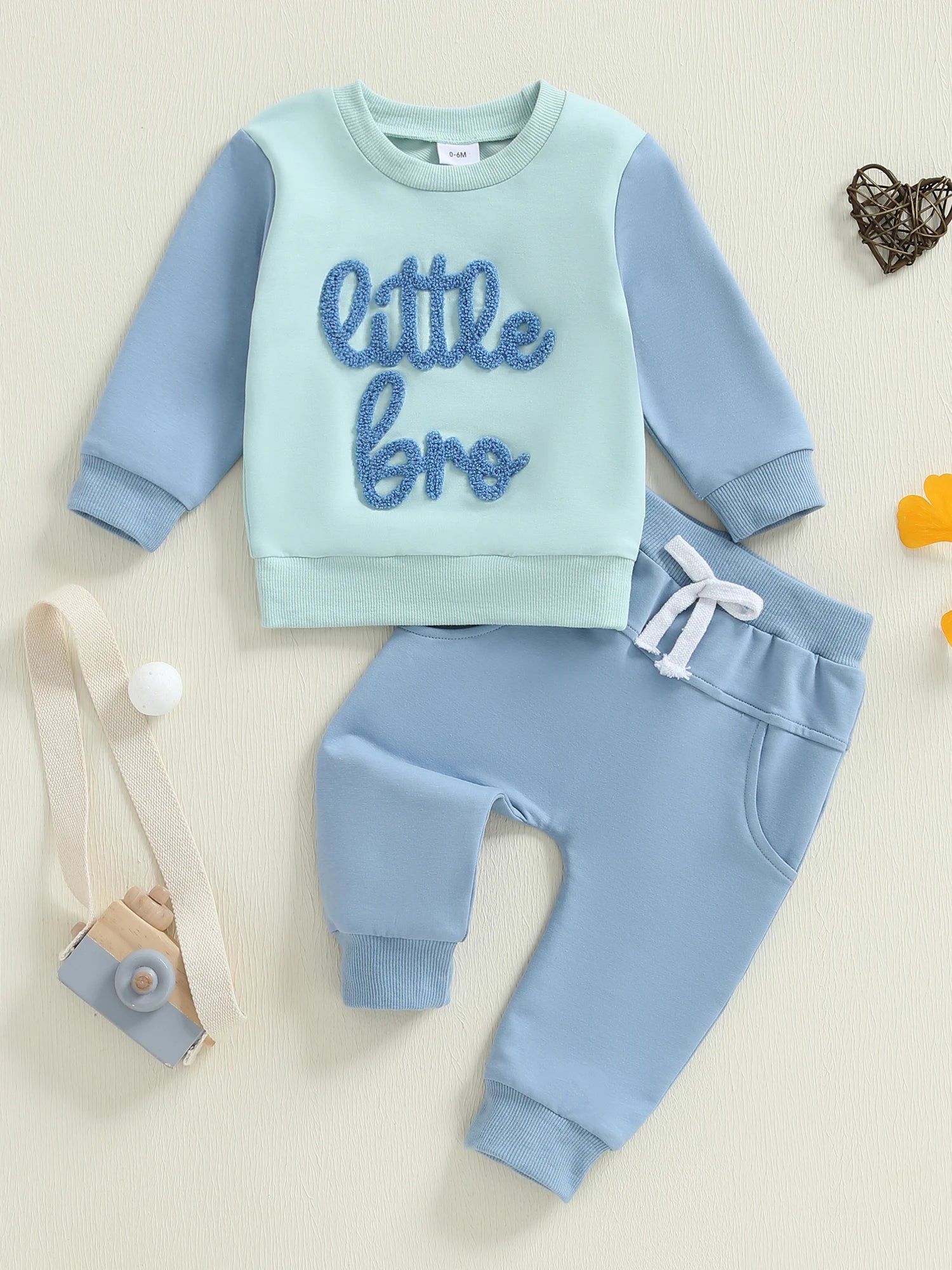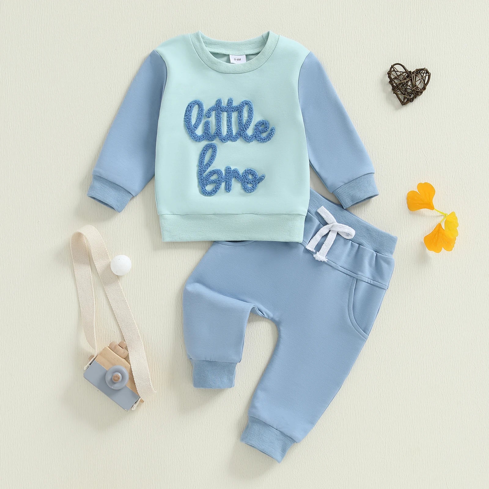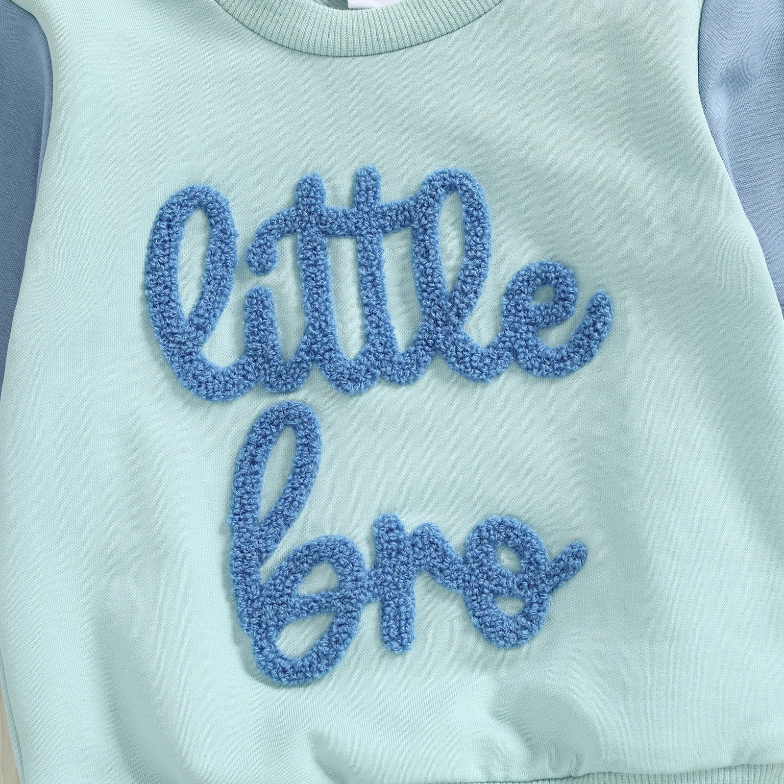 Baby Boy 2Pcs Little Bro Fall Outfits Letter Embroidery Long Sleeve Round Neck Pullover Elastic Waist Solid Pants Jogger Set