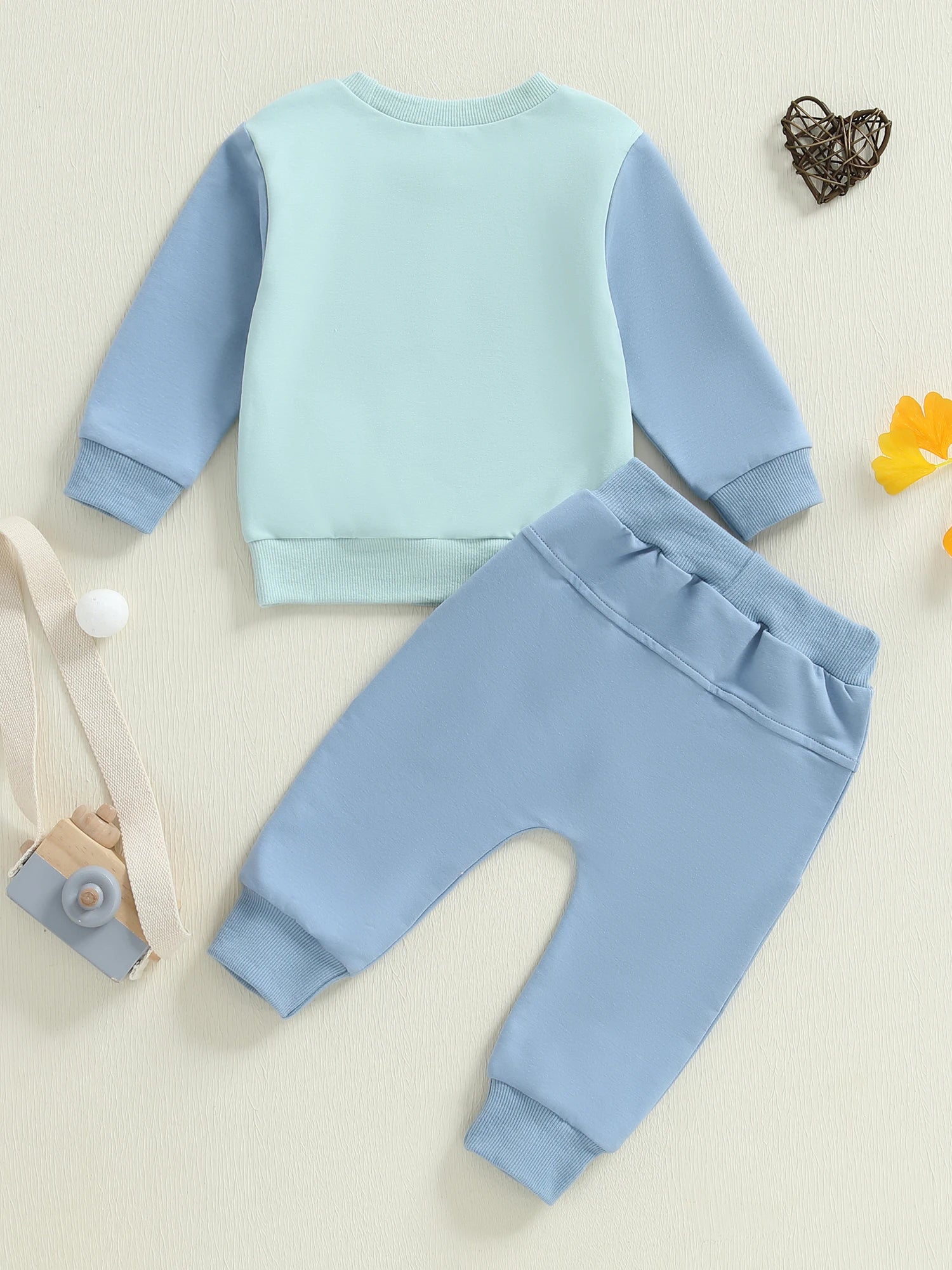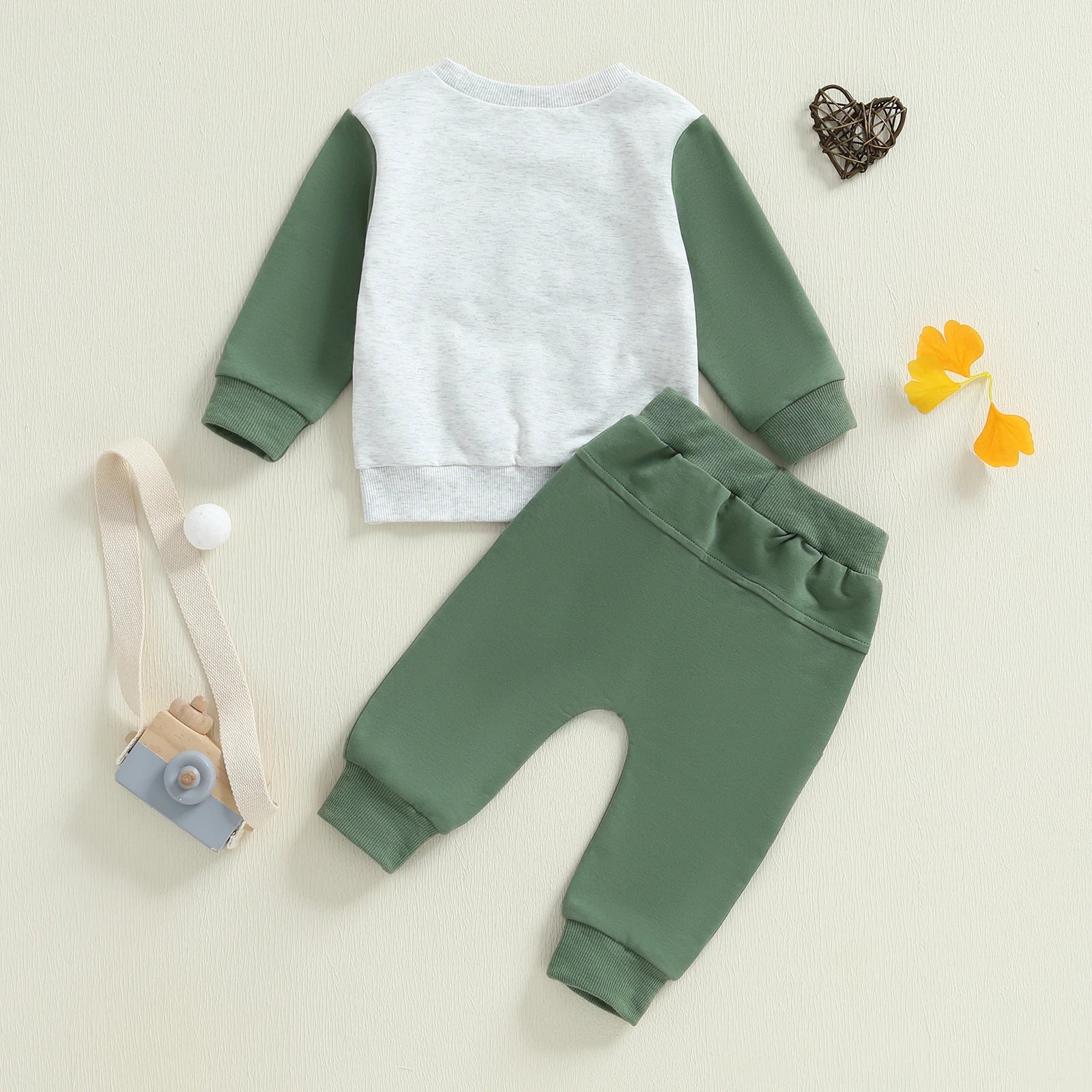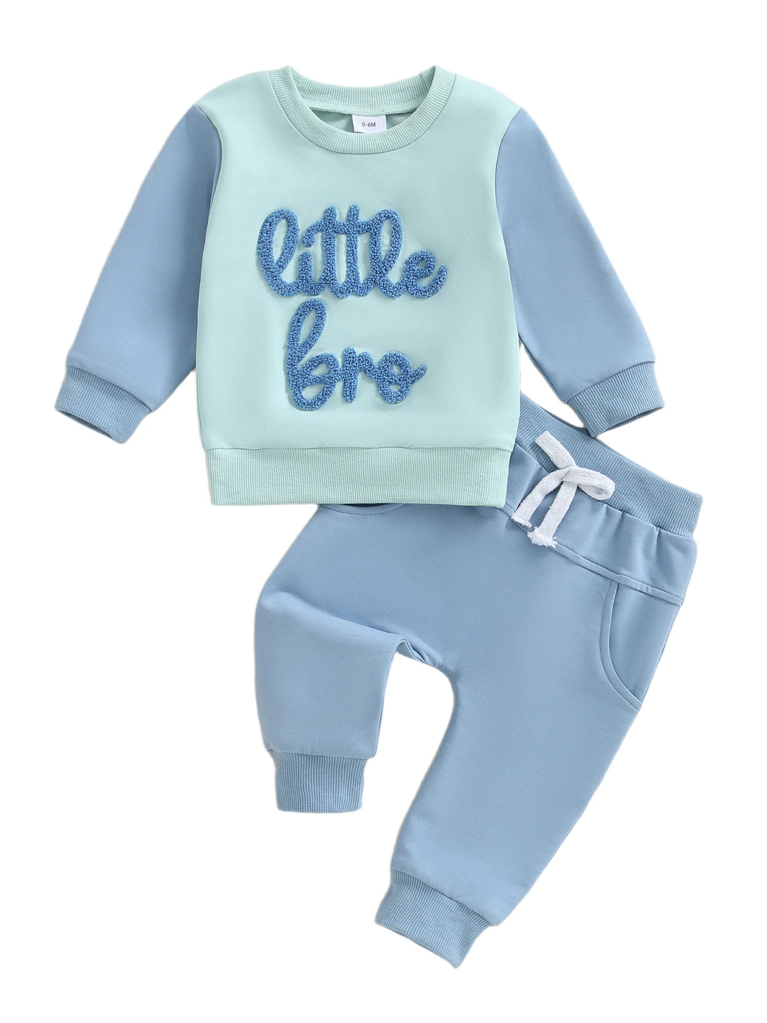 Baby Boy 2Pcs Little Bro Fall Outfits Letter Embroidery Long Sleeve Round Neck Pullover Elastic Waist Solid Pants Jogger Set