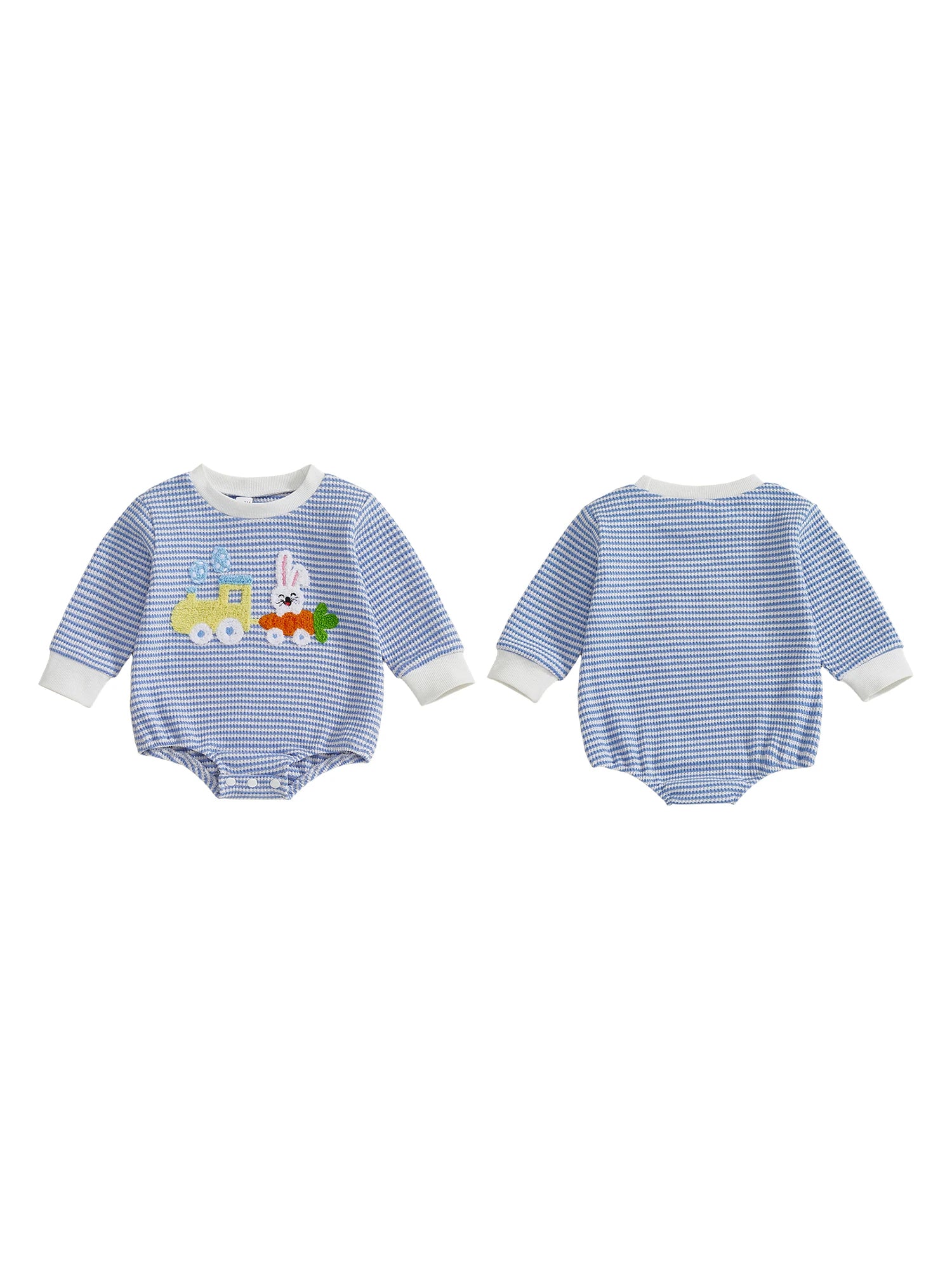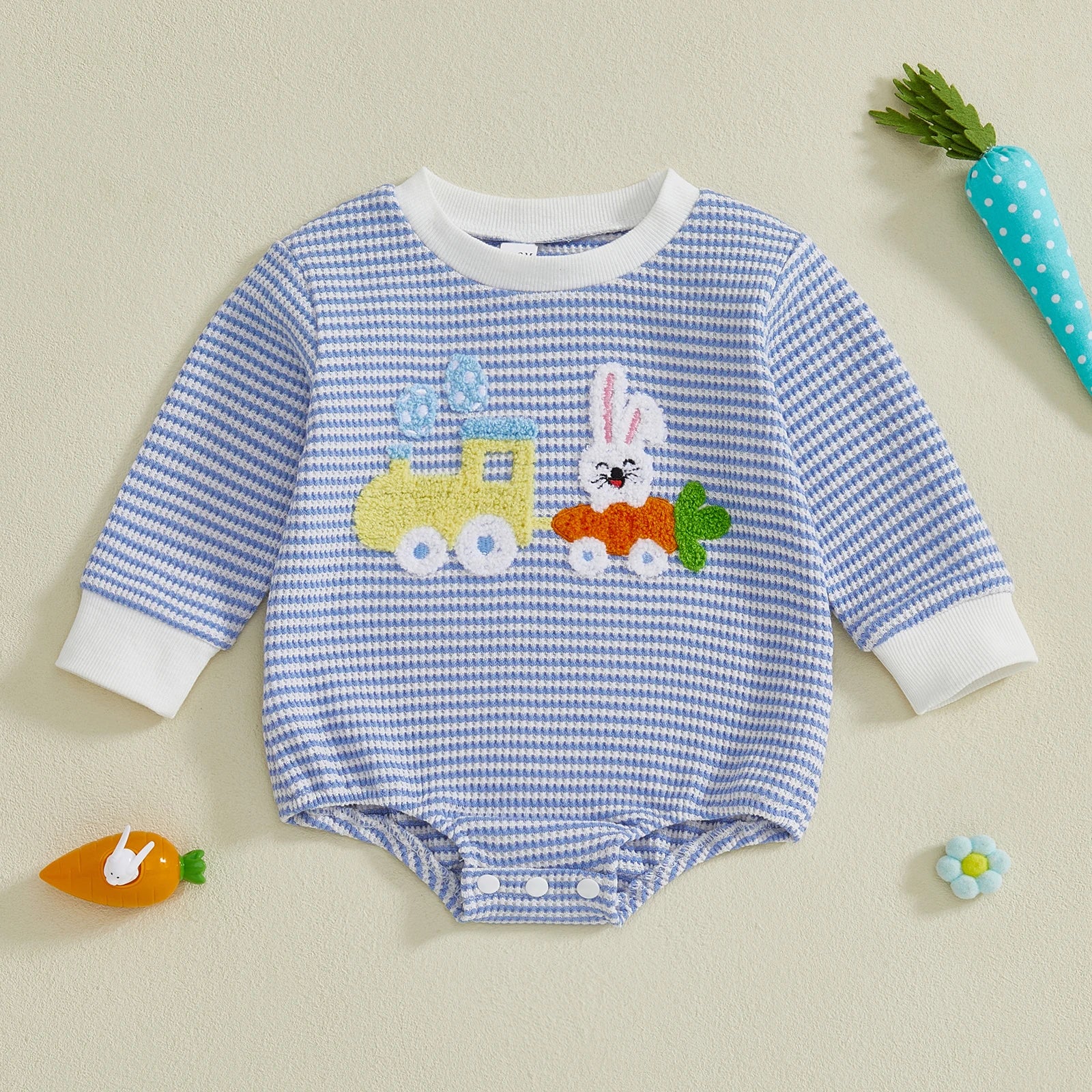 Baby Boy Easter Romper Striped Train Carrot Bunny Embroidered Long Sleeve Jumpsuit Casual Spring Clothes