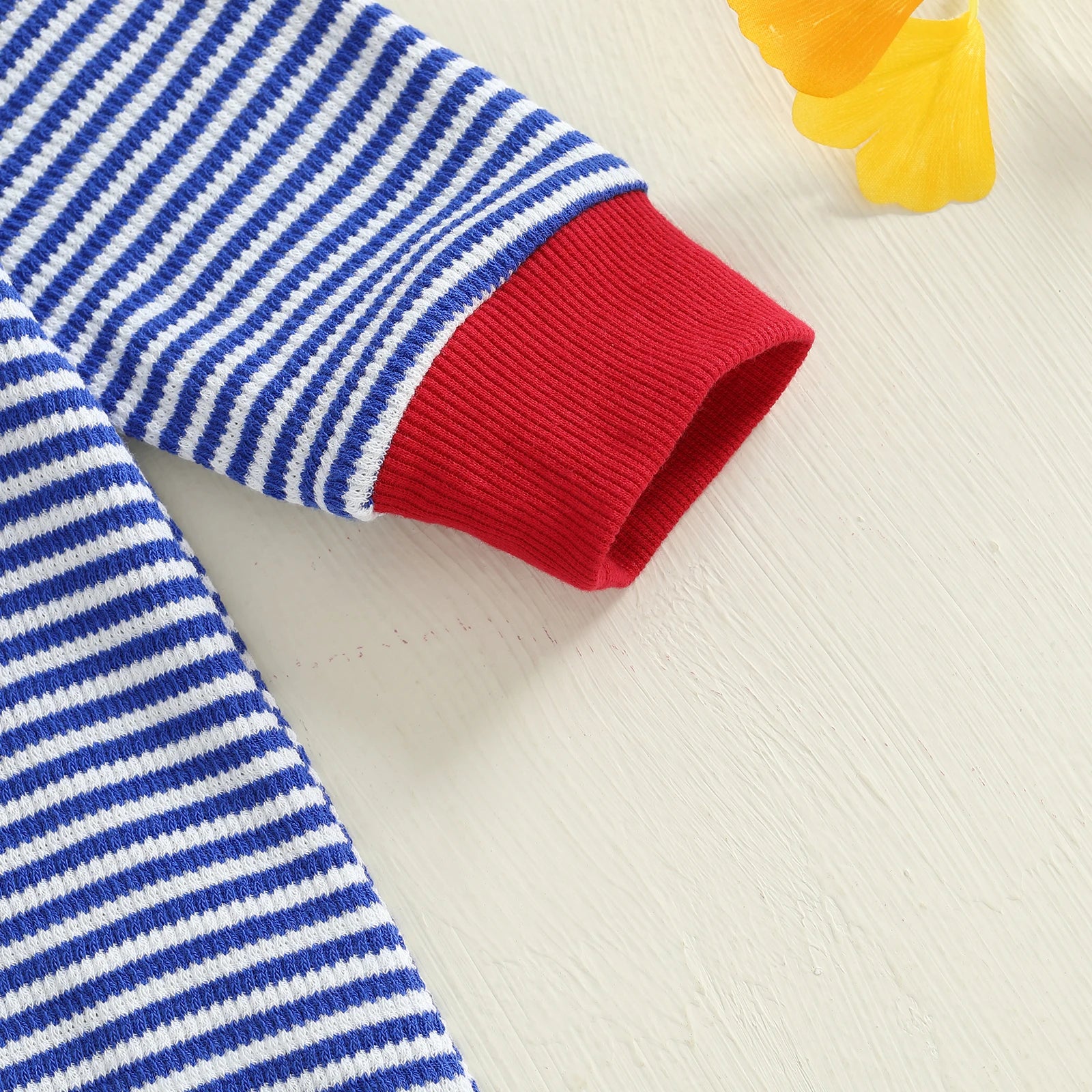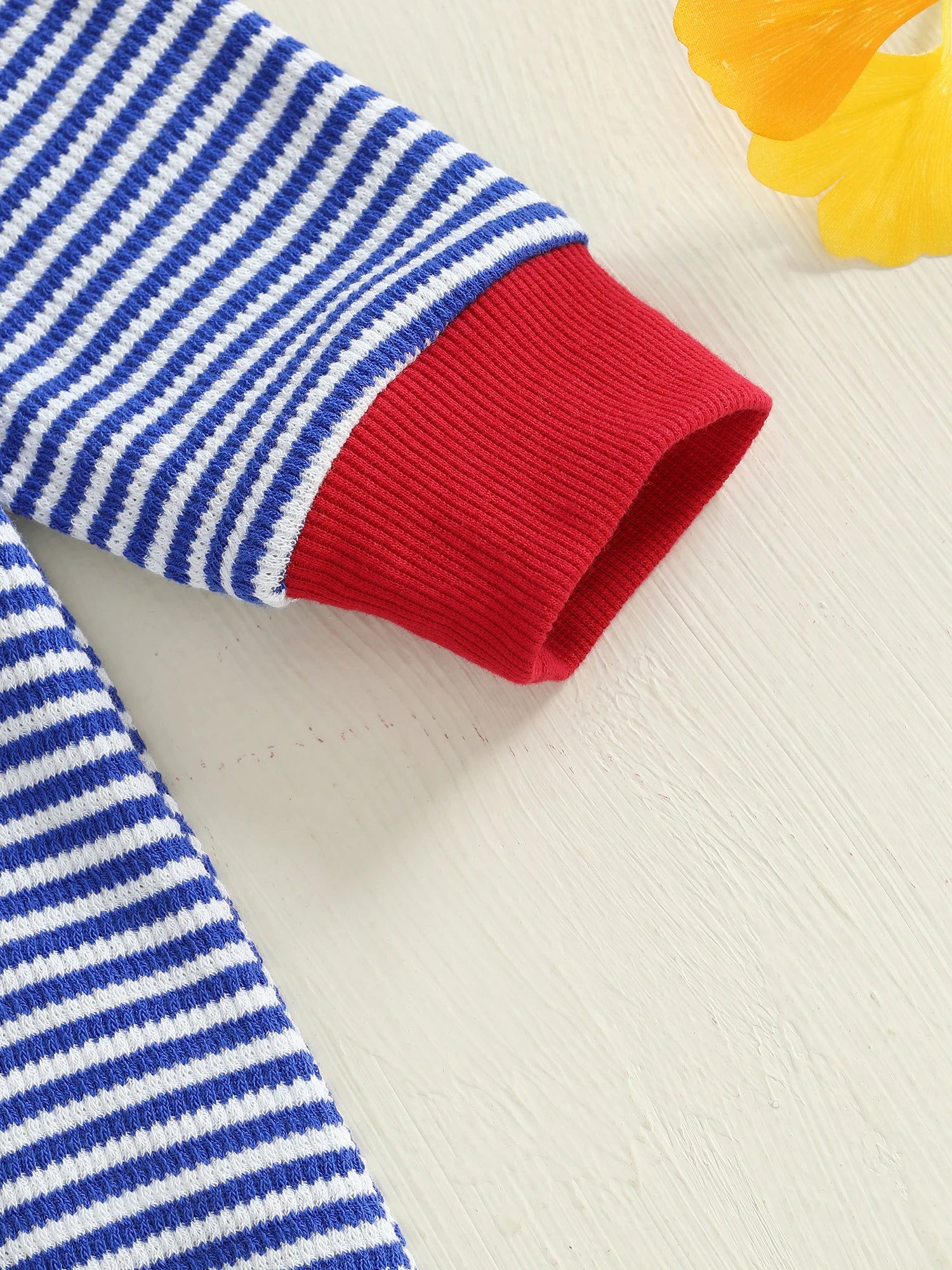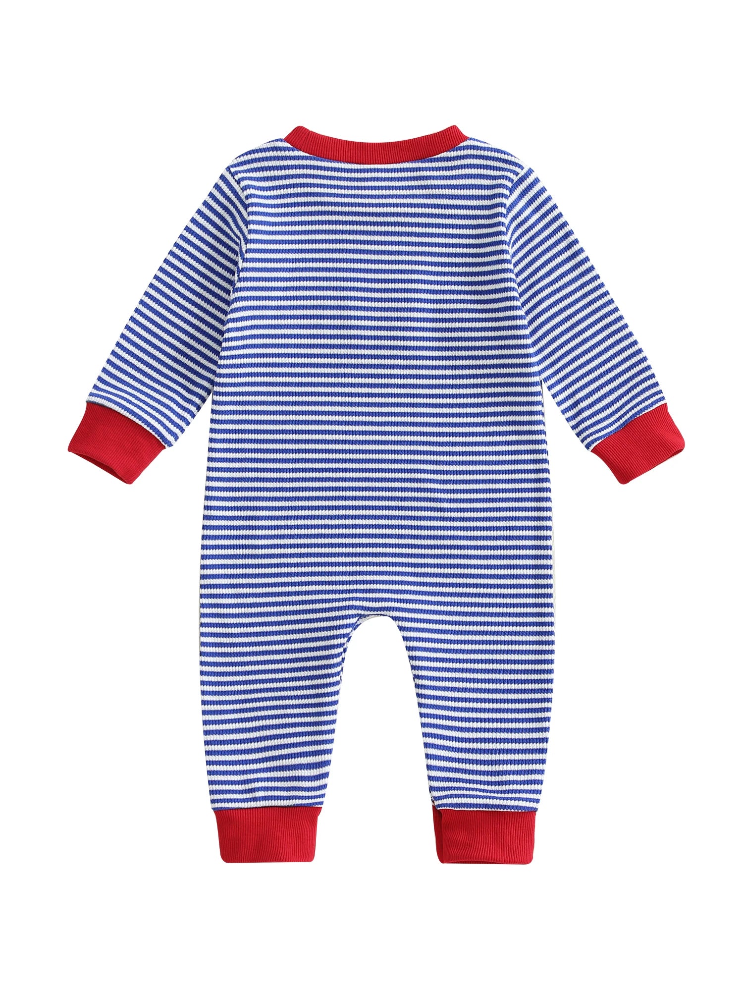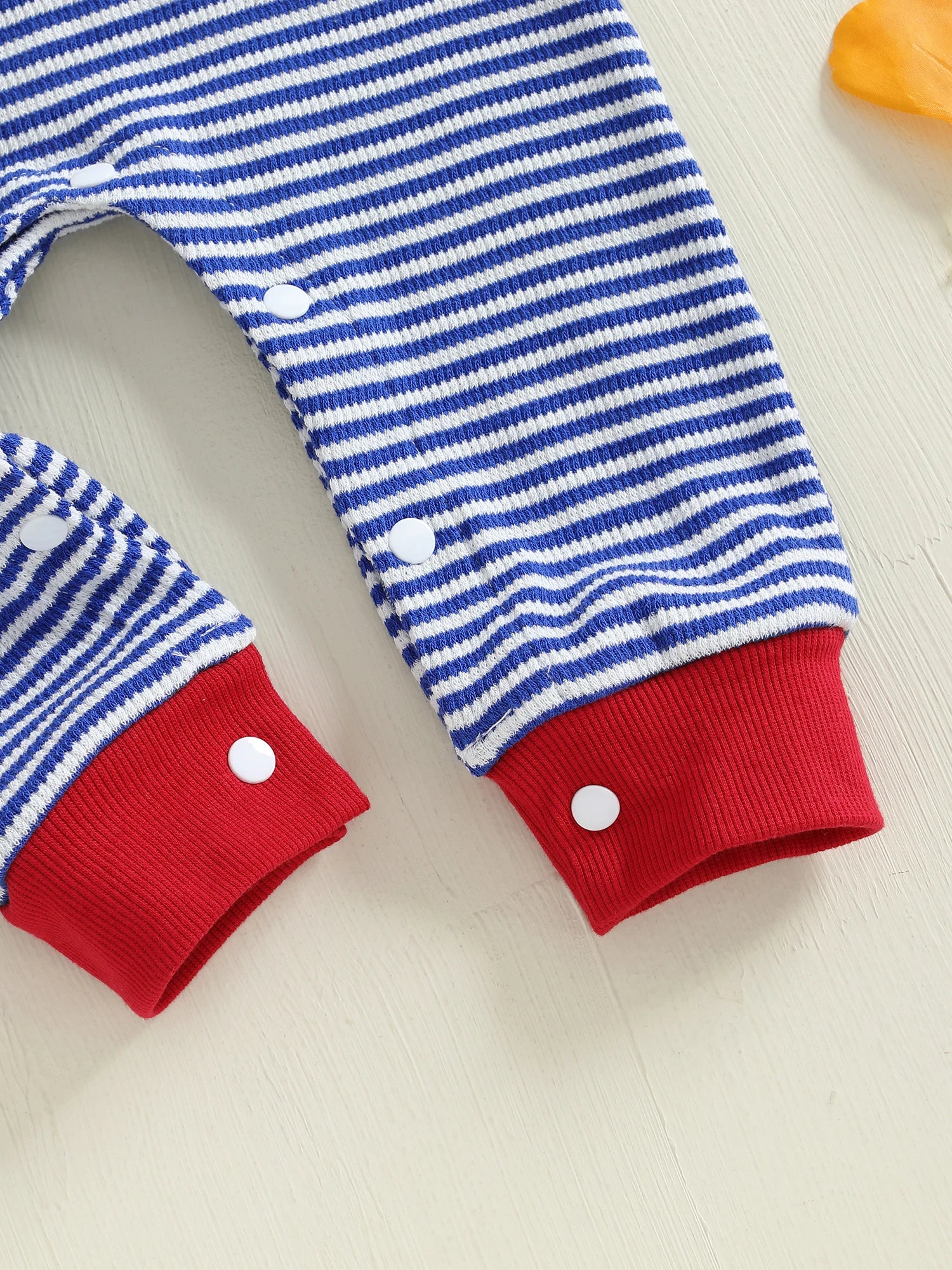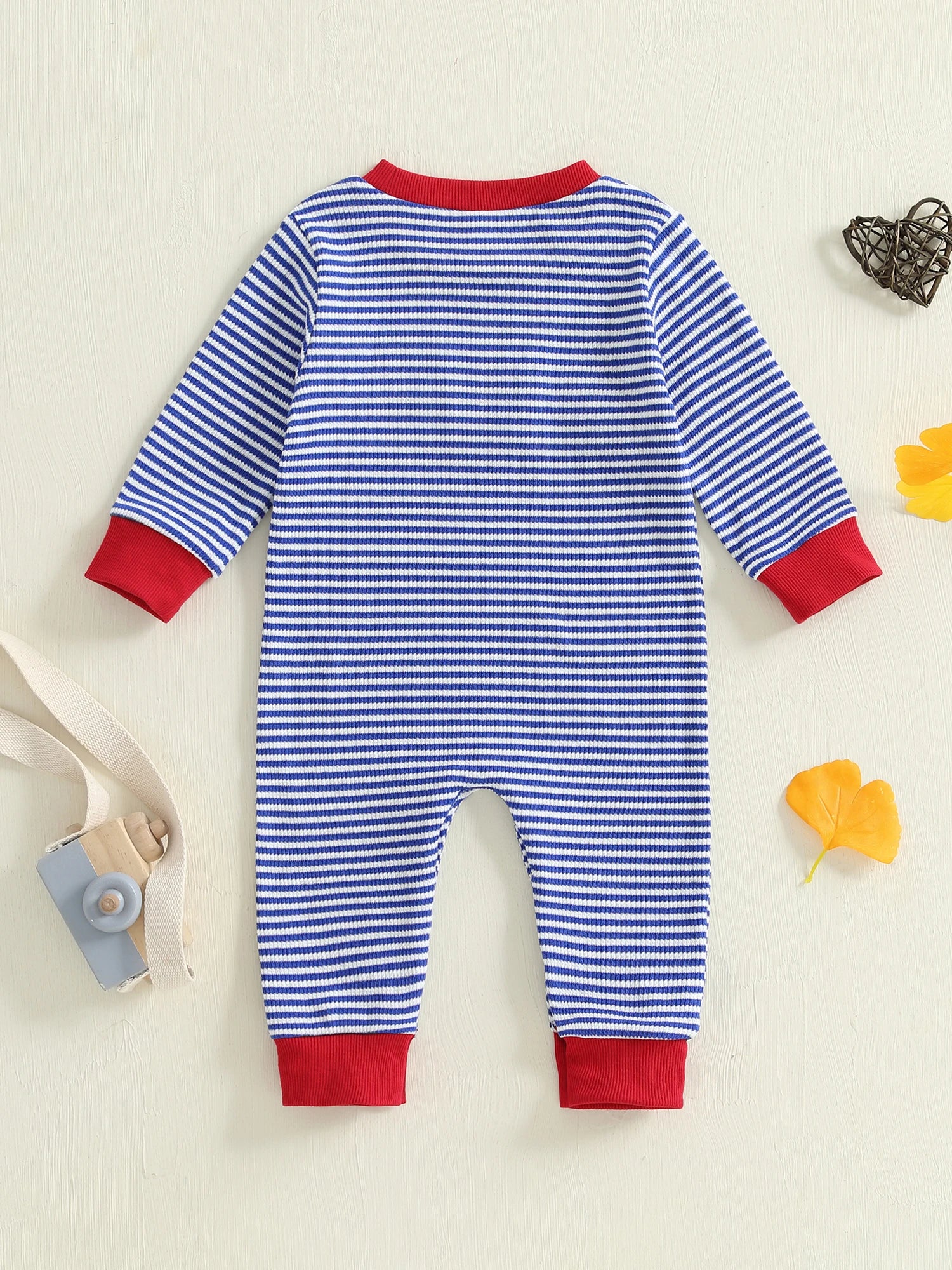 Baby Boy Fall Romper Striped Fire Truck Embroidered Crewneck Long Sleeve Full Length Jumpsuit