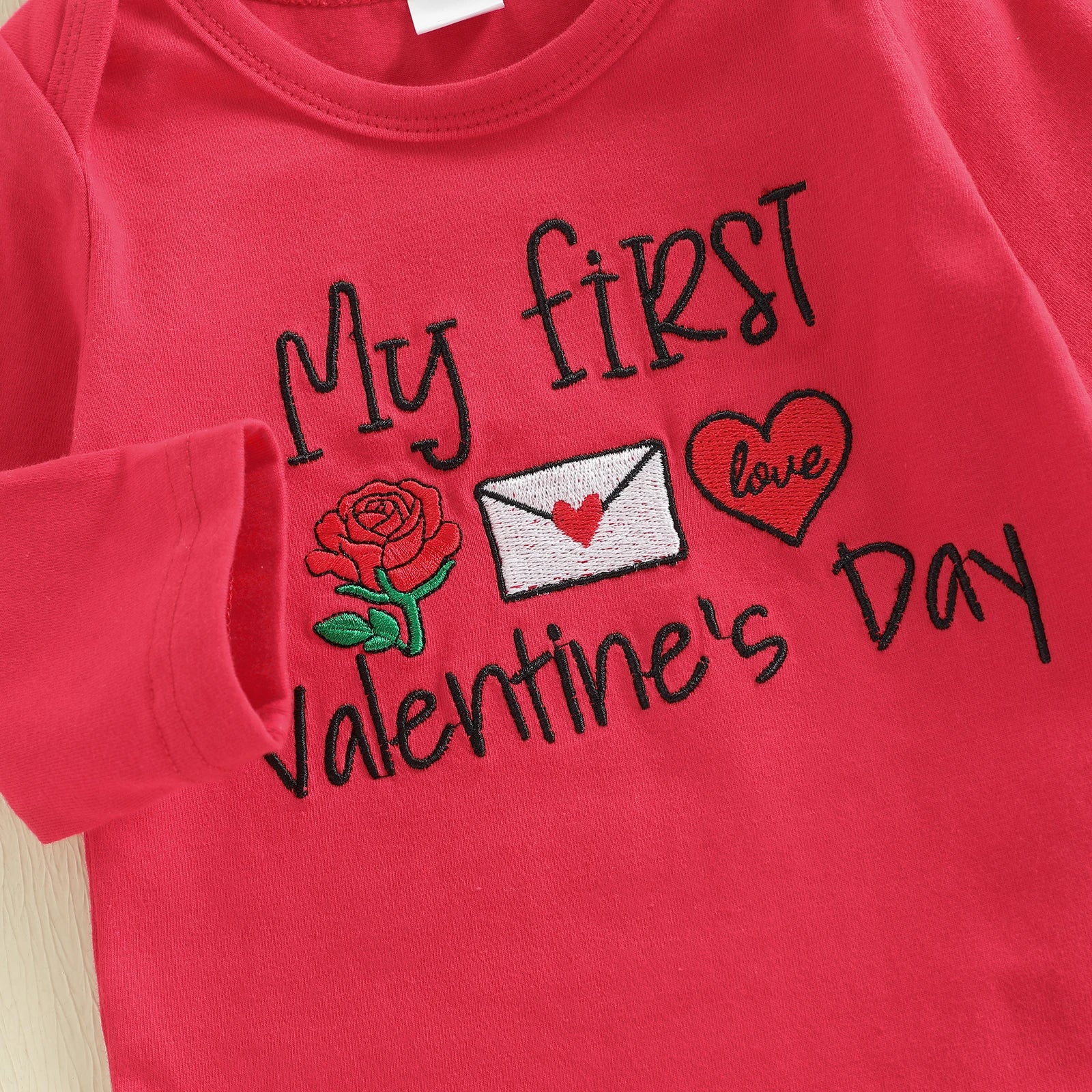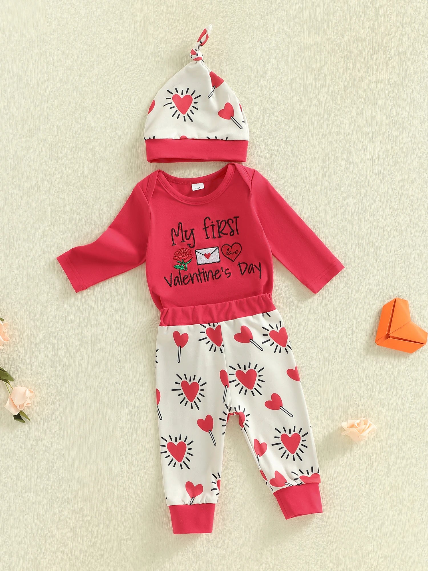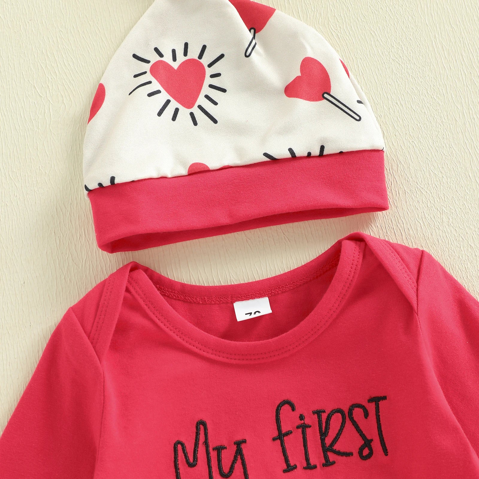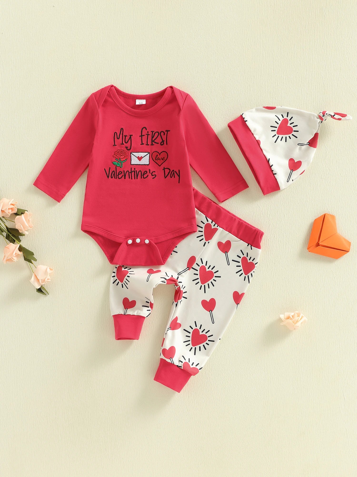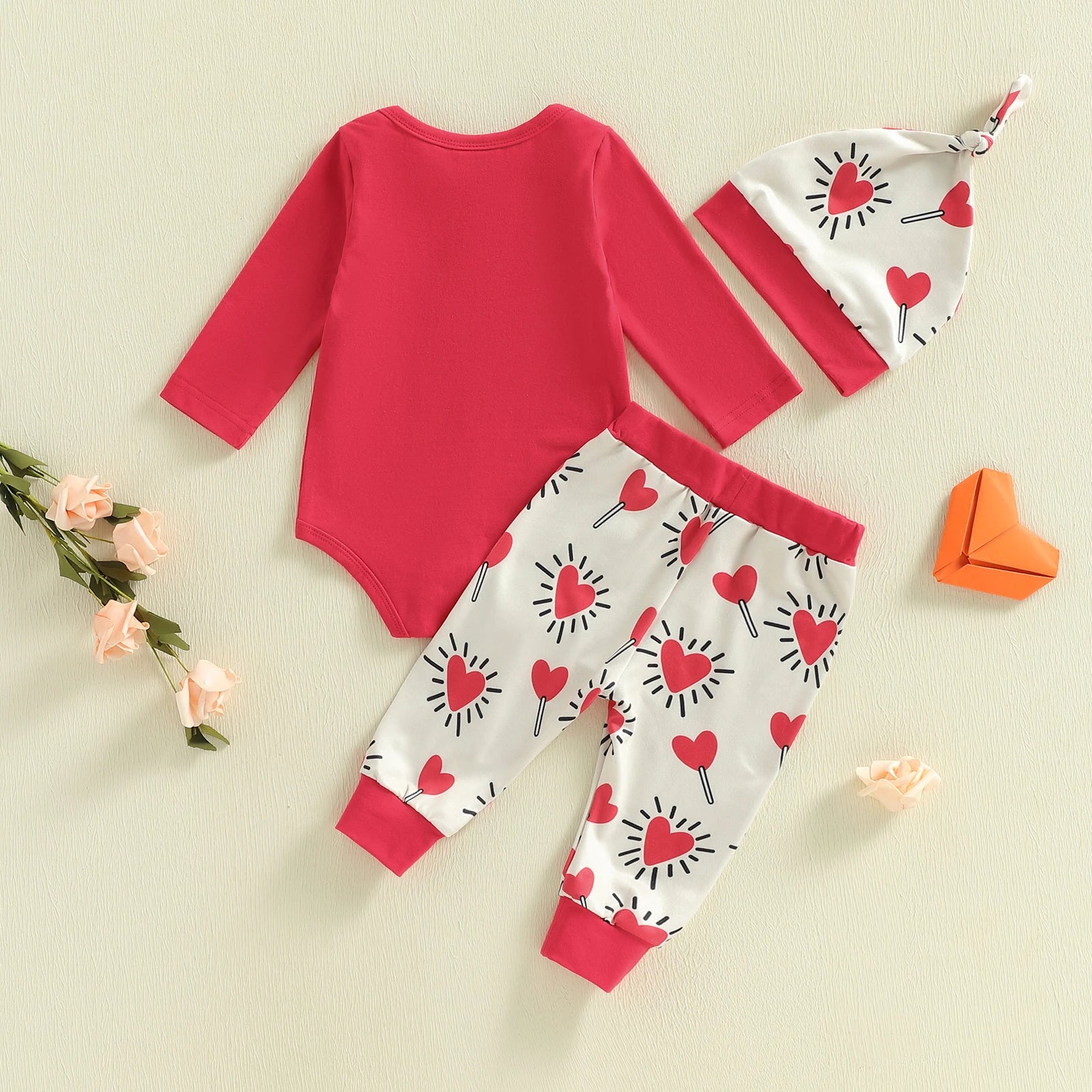 Baby Boy Girl 3Pcs My First Valentine's Day Outfit Letter Print Long Sleeve Romper Heart Candy Pattern Long Pants and Hat 3Pcs Set