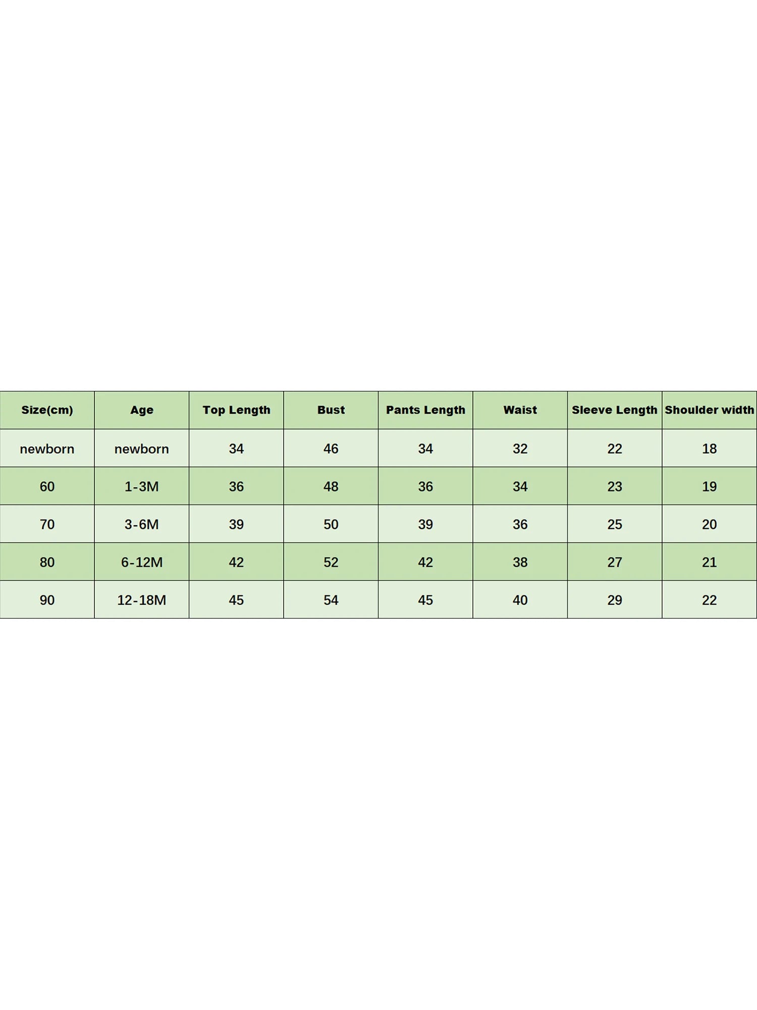 newborn Tops Length: 13.39 Bust: 18.11 Sleeve: 8.66 Shoulder: 7.09 Pants Length: 13.39 Waist: 12.60 Hip: 18.90 Advised Age: Newborn