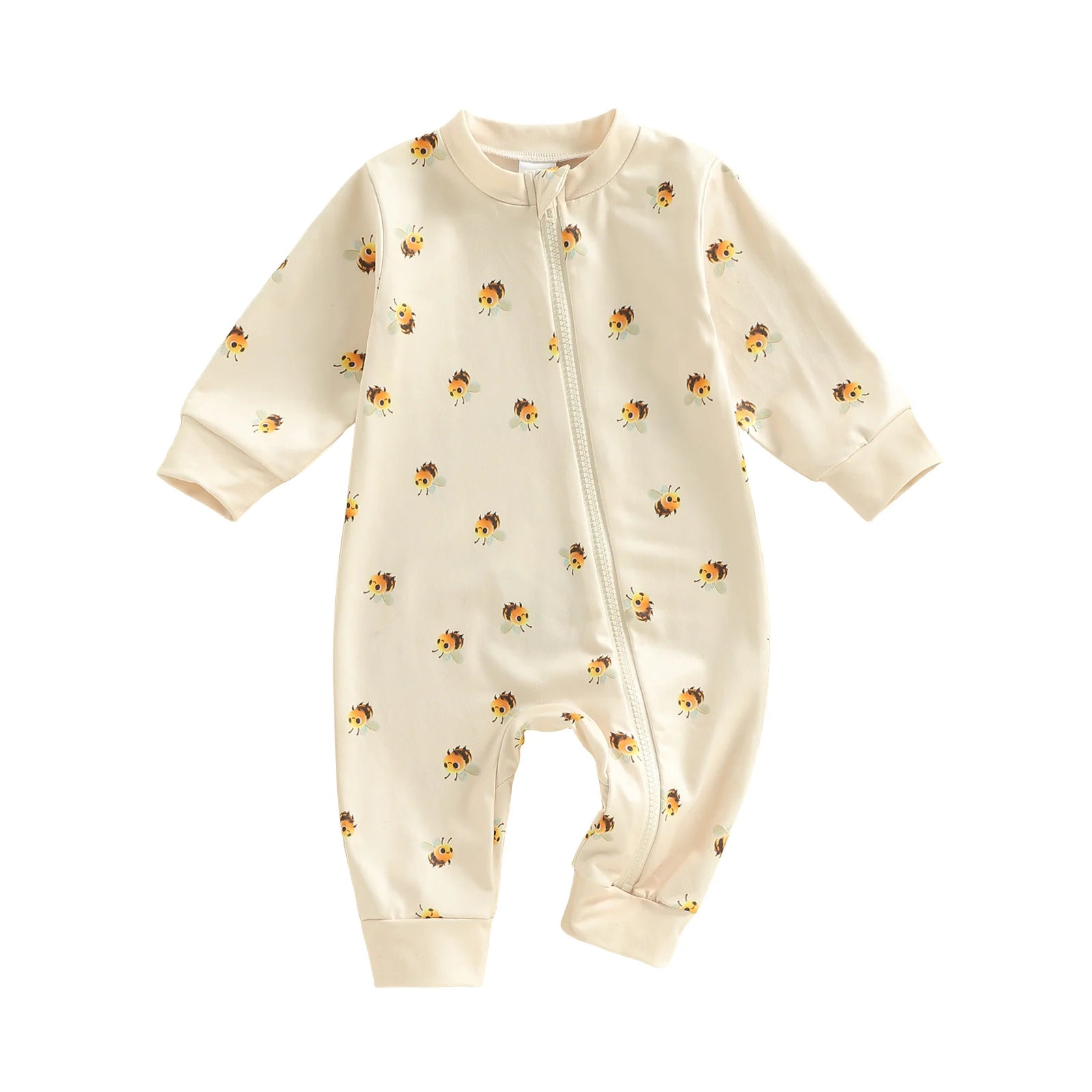 Baby Boy Girl Zipper Romper Crew Neck Long Sleeve Cute Bee Print Zip Up Jumpsuit