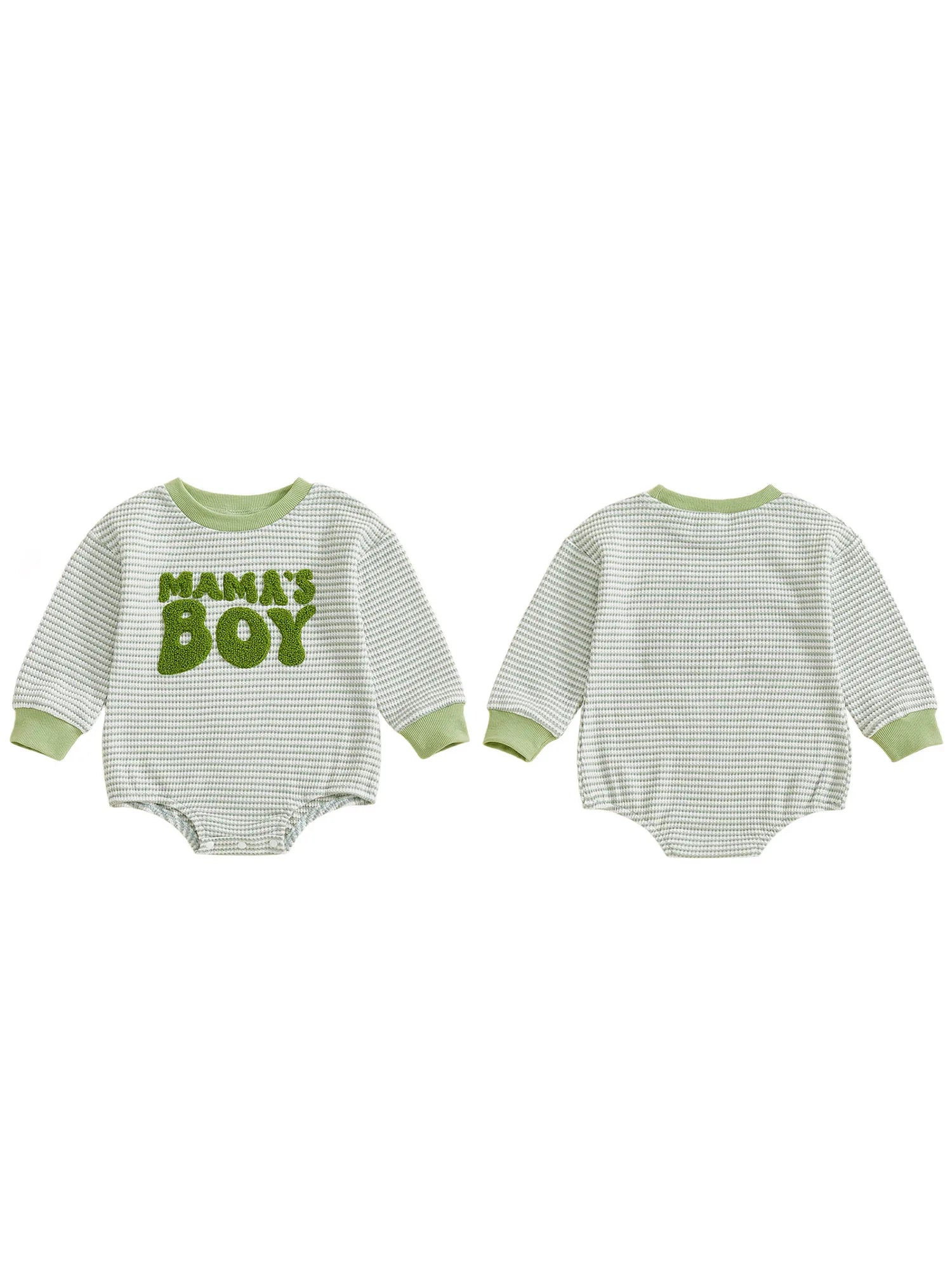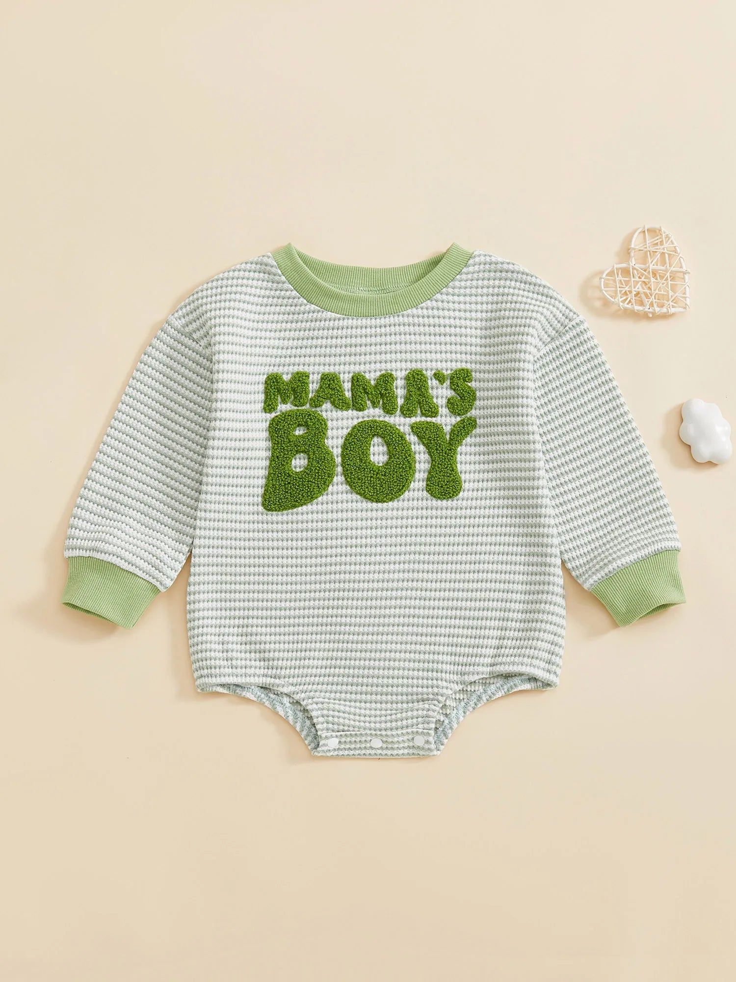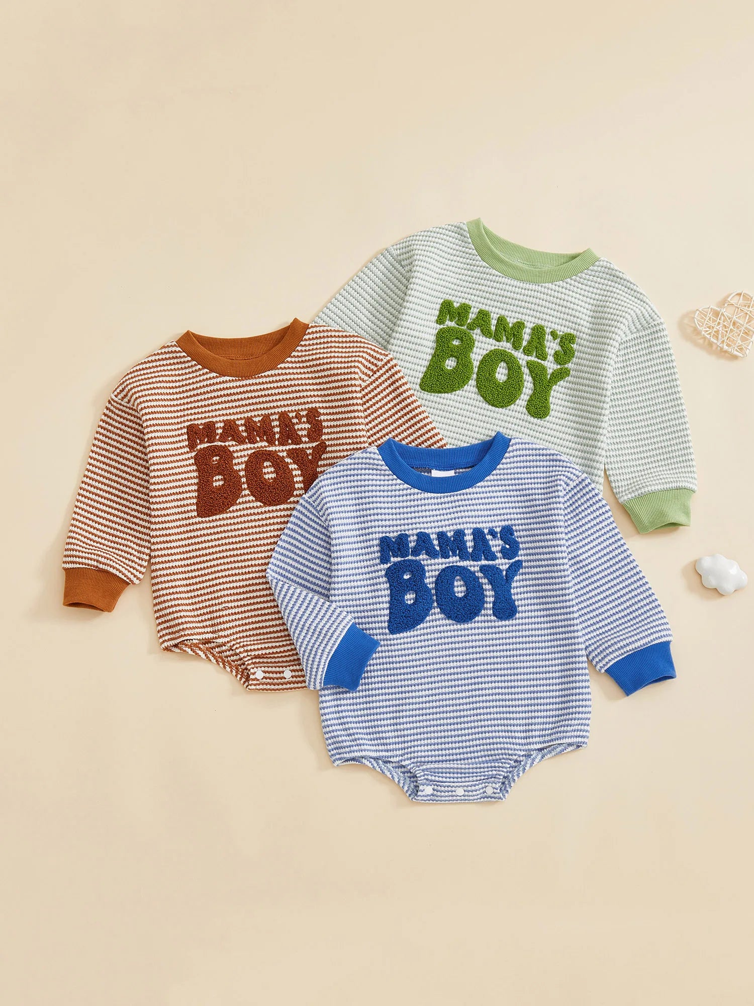 Baby Boy Romper Long Sleeve Crew Neck Striped Embroidery Mama's Boy Letters Fall Bodysuit