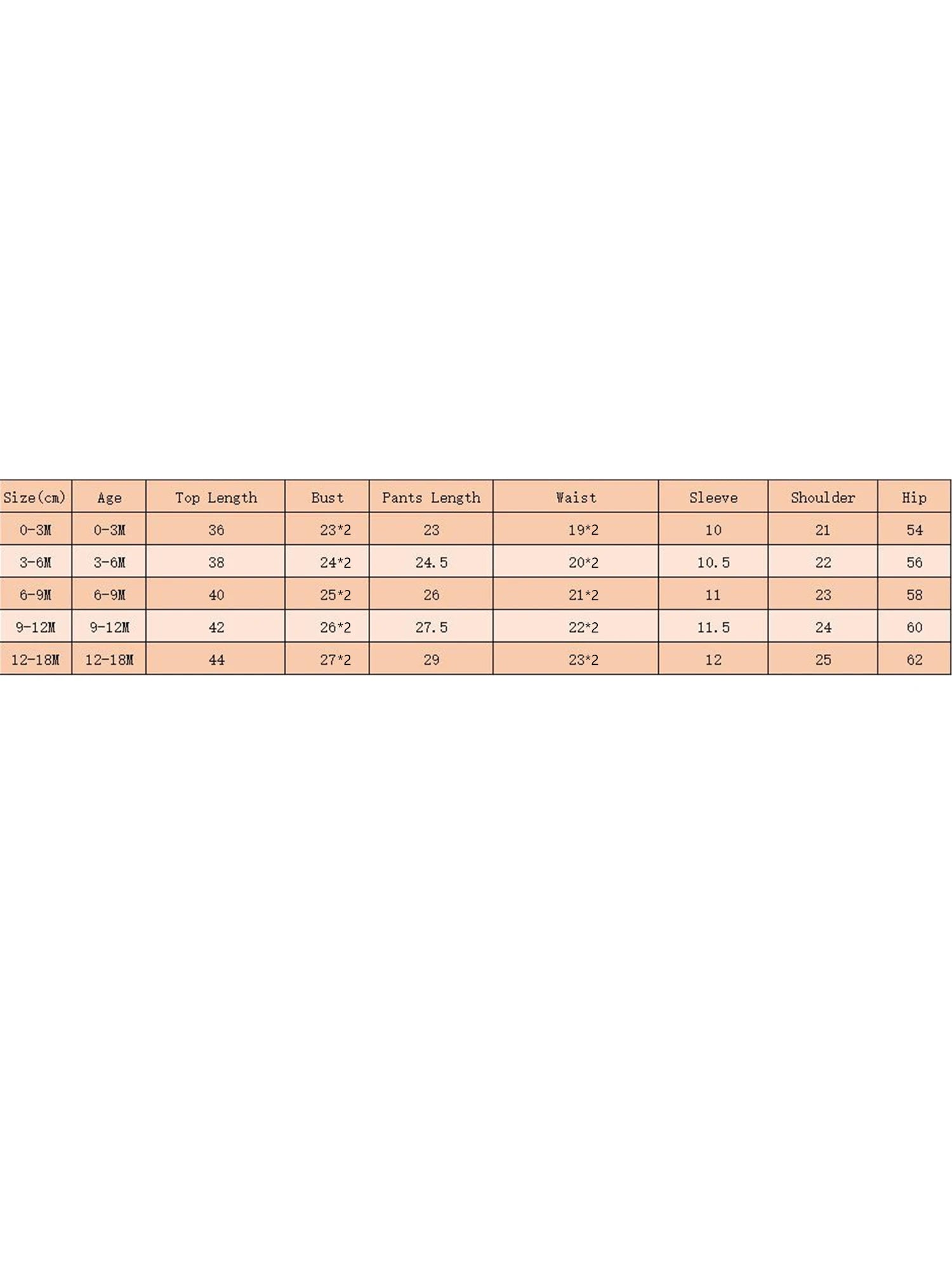 3-6M Tops Length: 14.96 Bust: 18.90 Sleeve: 4.13 Shoulder: 8.66 Pants Length: 9.65 Hip: 22.05 Waist: 15.75 Advised Age: 3-6 Months