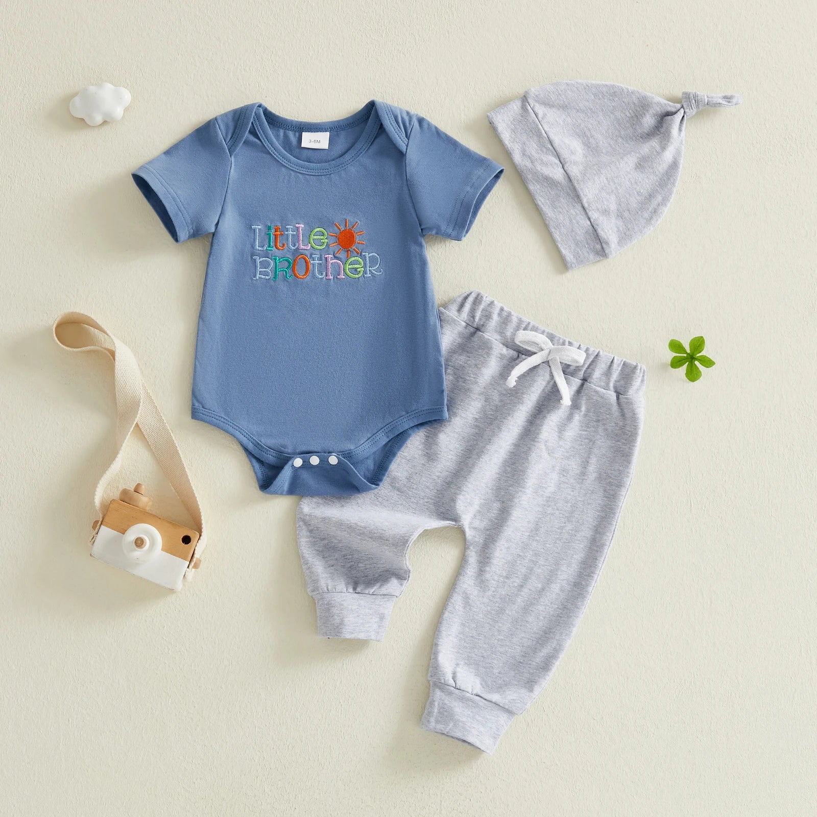 Baby Boys 3Pcs Little Brother Clothing Set Fashionable Short Sleeve Letters Embroidery Romper with Jogger Pants Hat Outfit