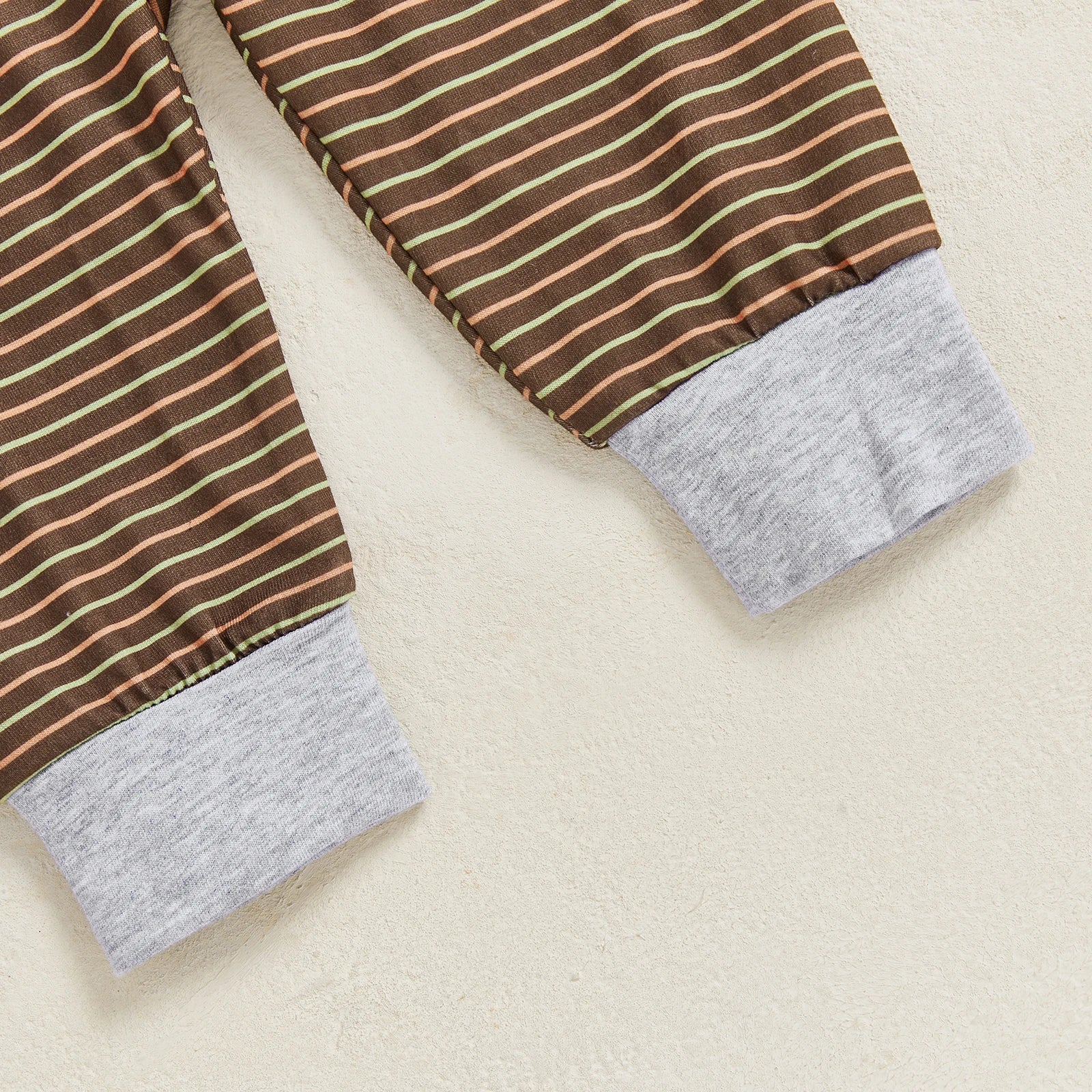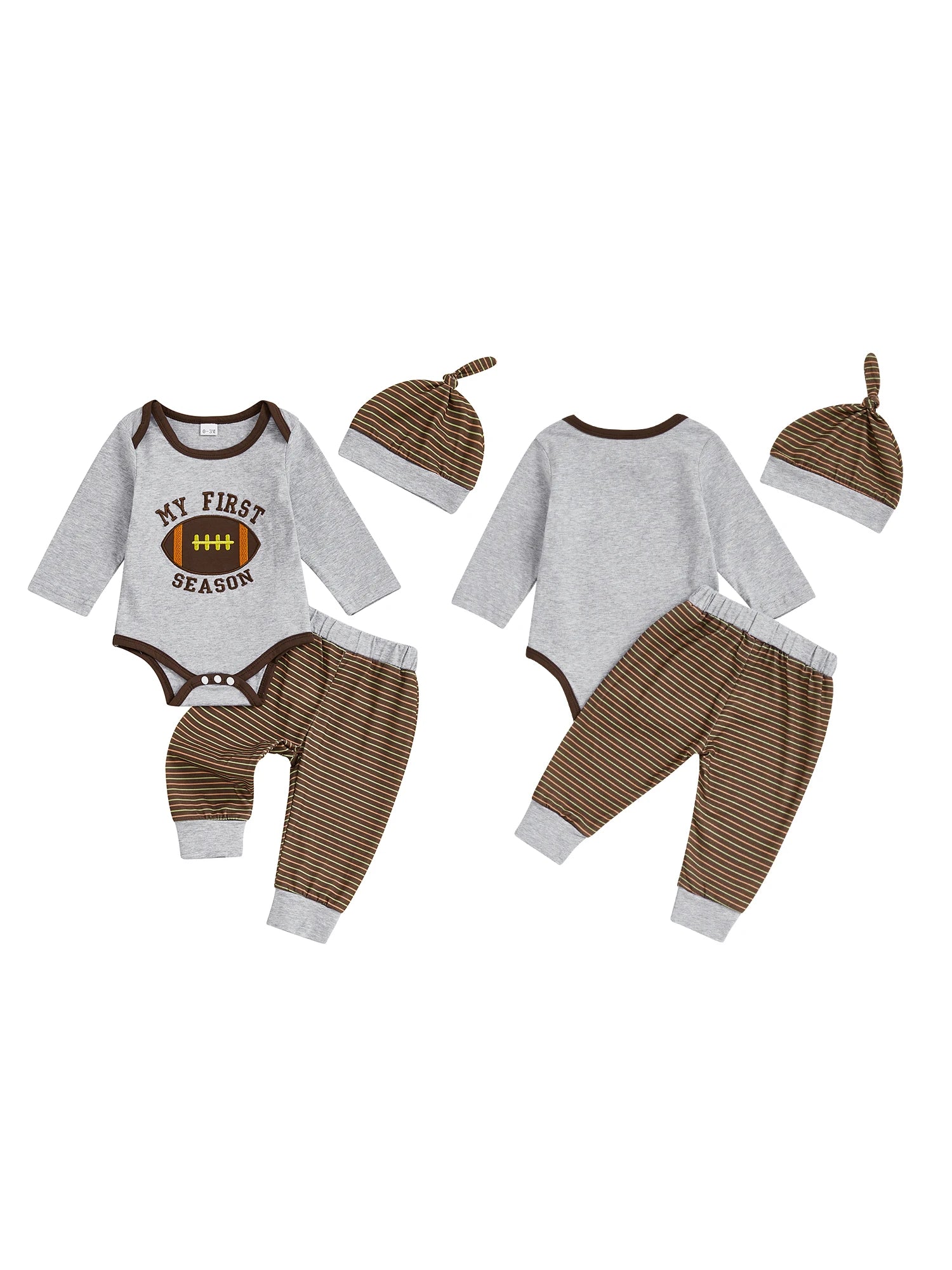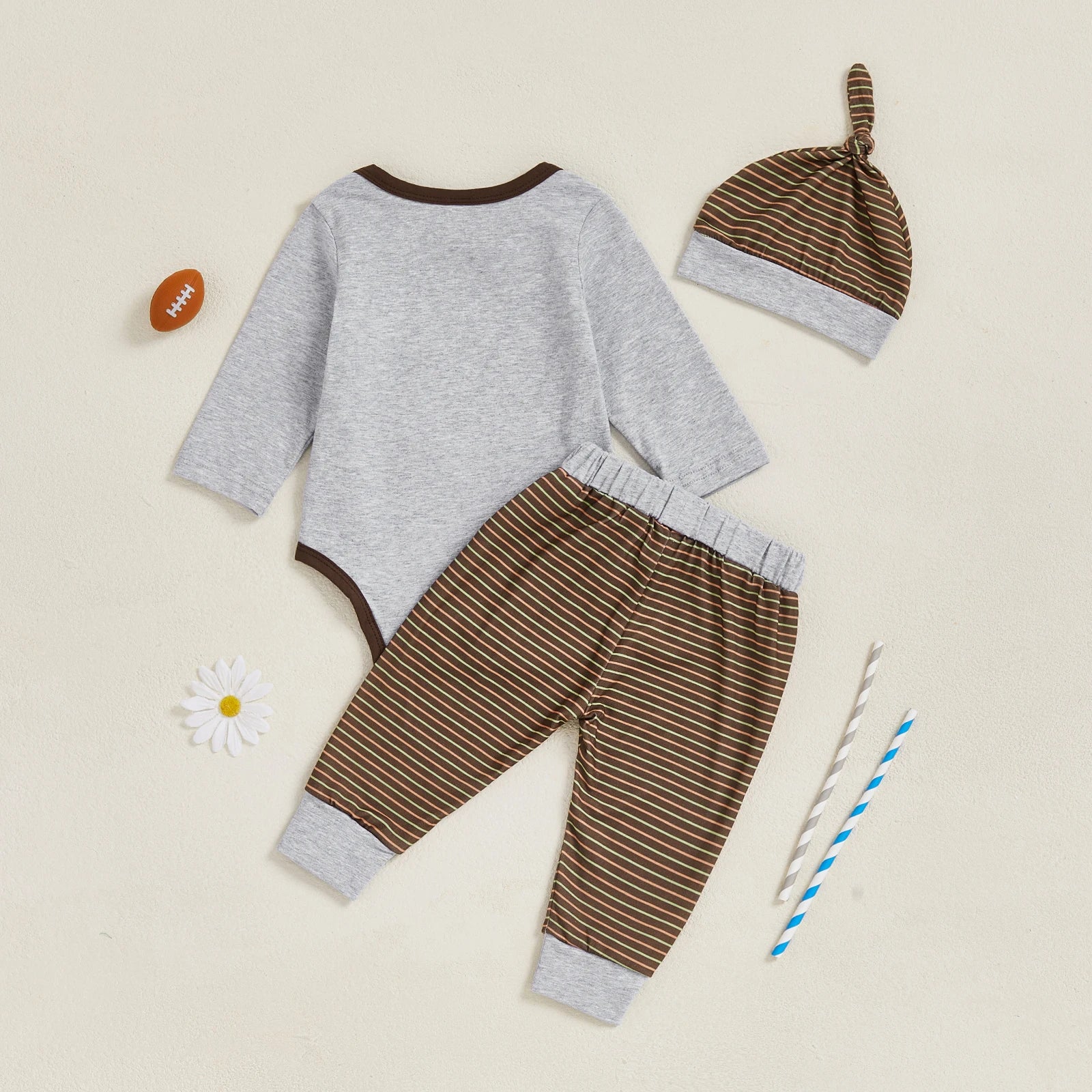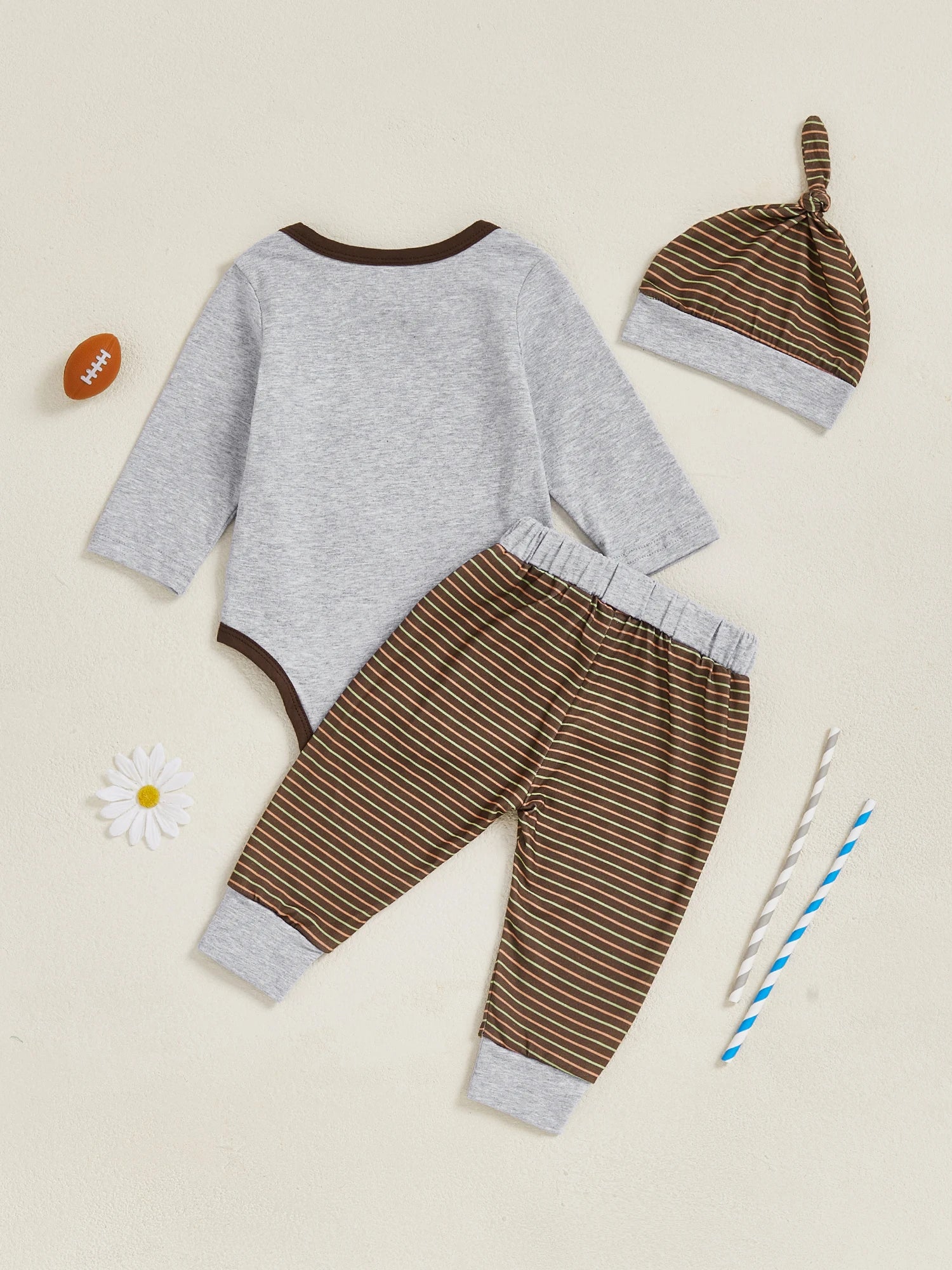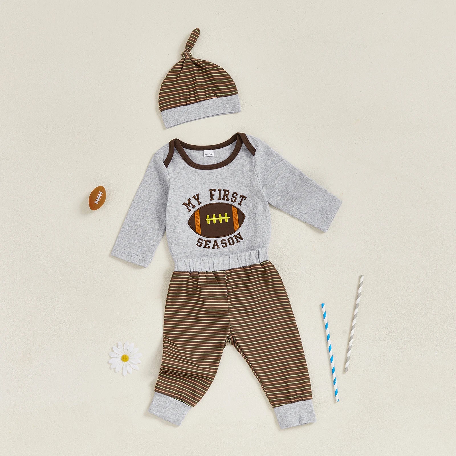 Baby Boys 3Pcs My First Football Season Fall Set Letter Embroidery Long Sleeve Romper Elastic Waist Striped Pants and Hat Outfit