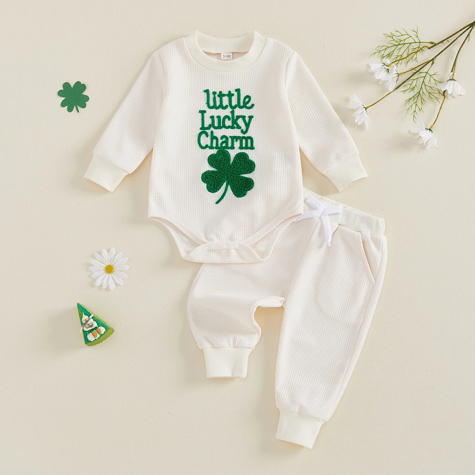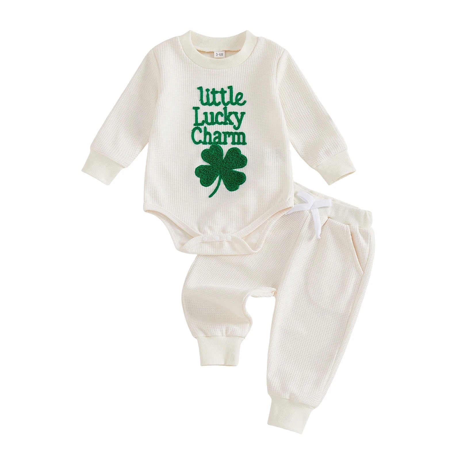 Baby Boys Girls 2Pcs Little Lucky Charm Outfit Long Sleeve O Neck Letter Shamrock Embroidery Jumpsuit Romper and Elastic Waist Pants Set