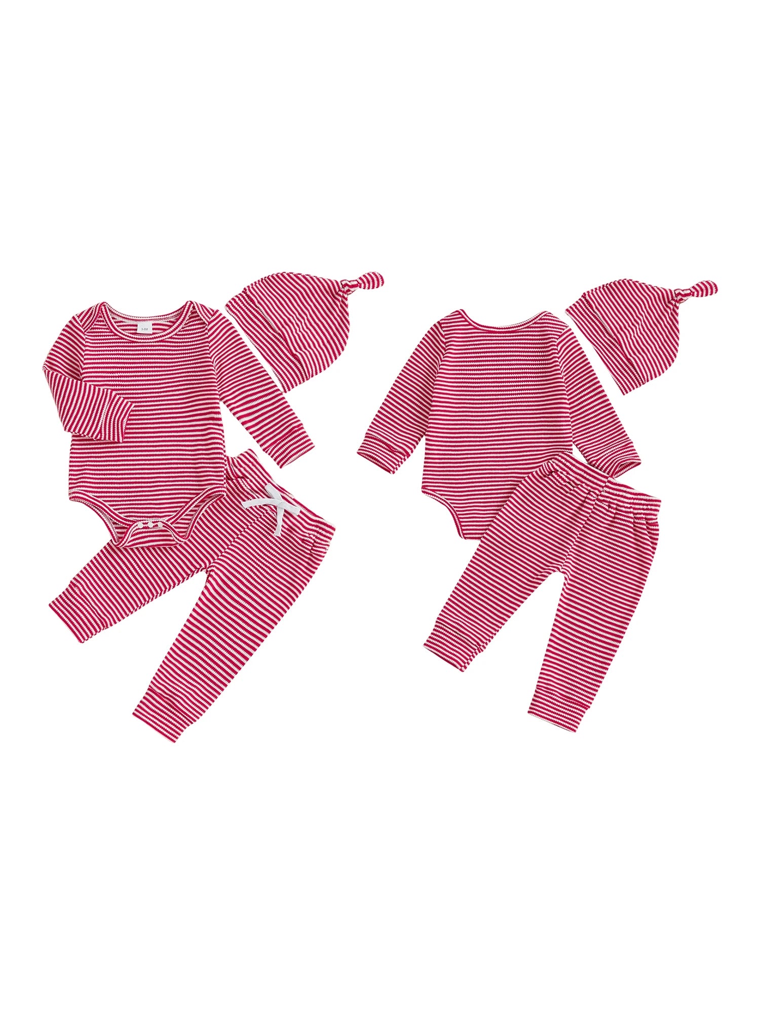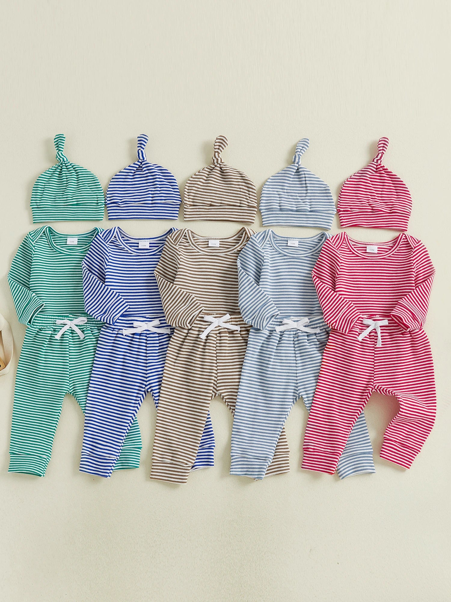 Baby Boys Girls 3Pcs Outfits Striped Crew Neck Long Sleeve Romper Pants and Cap Hat Set