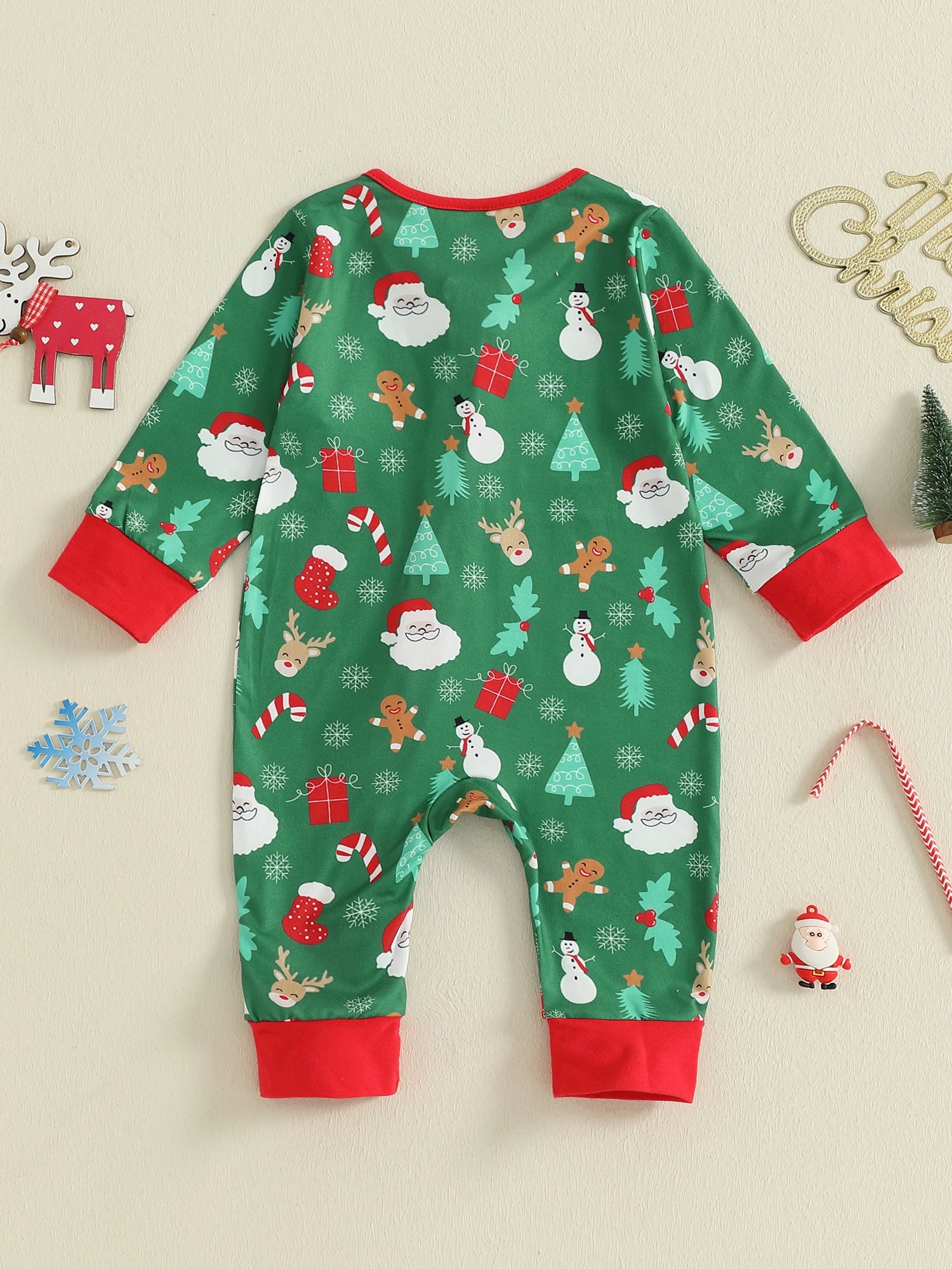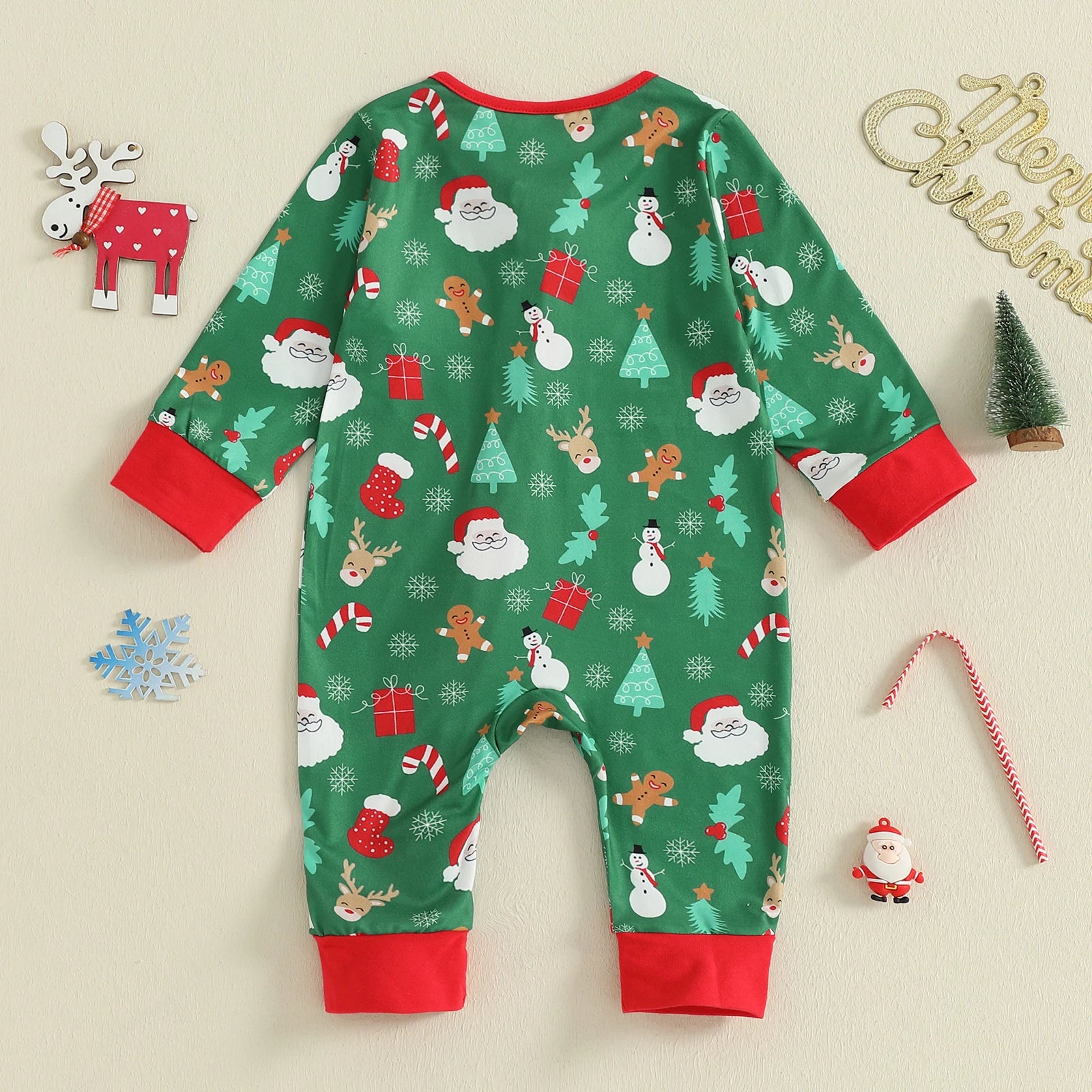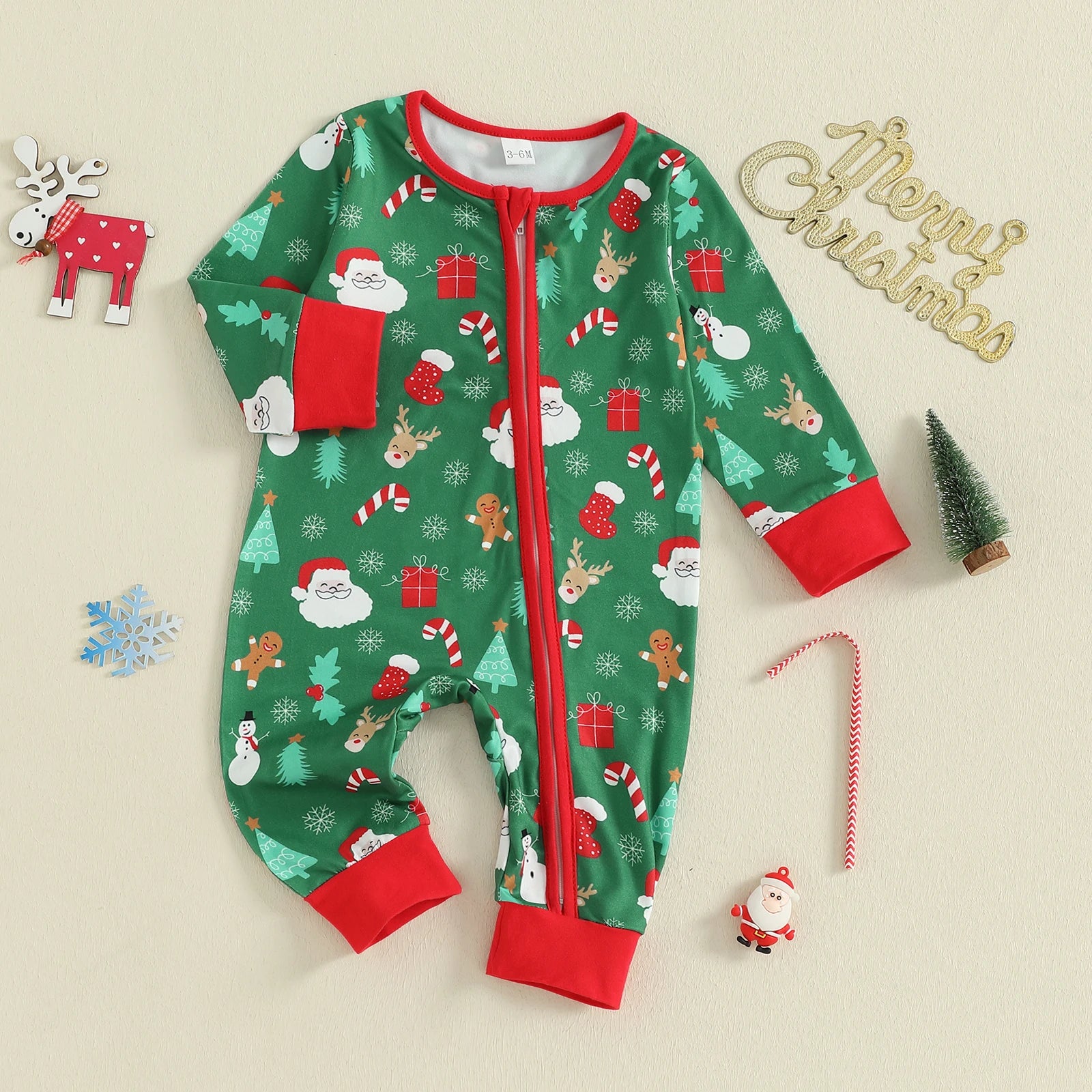 Baby Boys Girls Christmas Zipper Romper Reindeer Santa Print Zip Up Long Sleeve Round Neck Jumpsuit