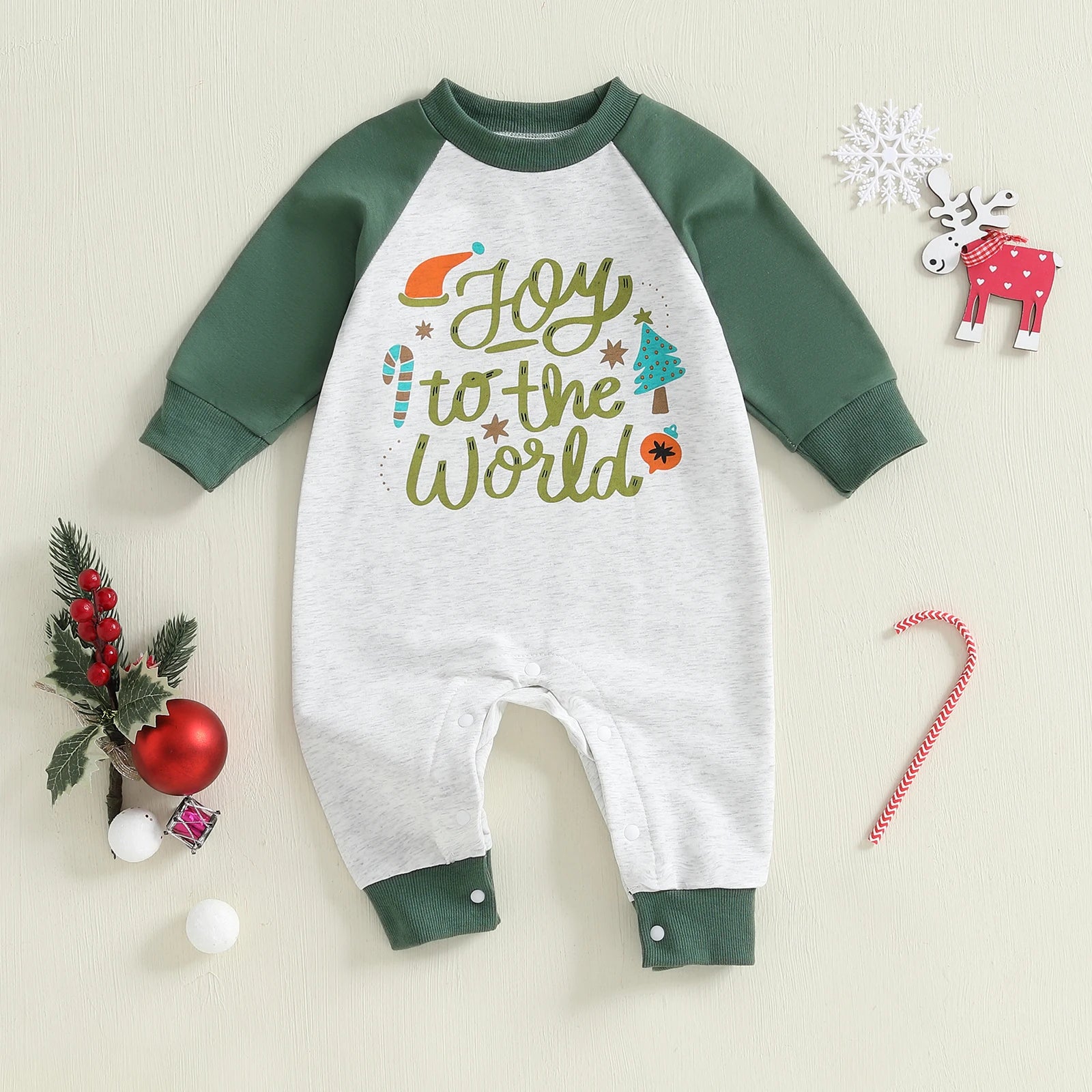 Baby Boys Girls Joy To The World Christmas Romper Letter Tree Long Raglan Sleeve Crewneck Jumpsuit Winter Clothes