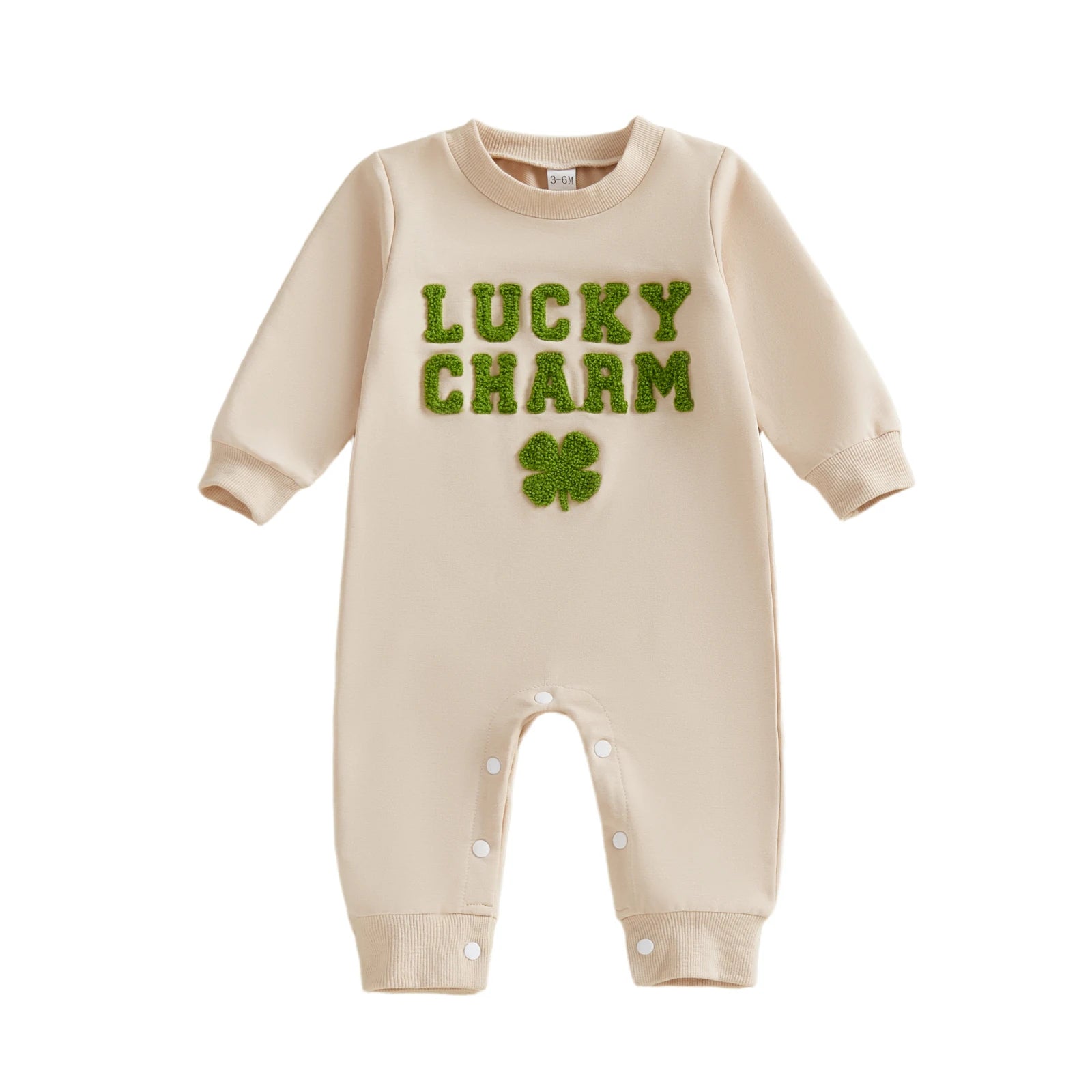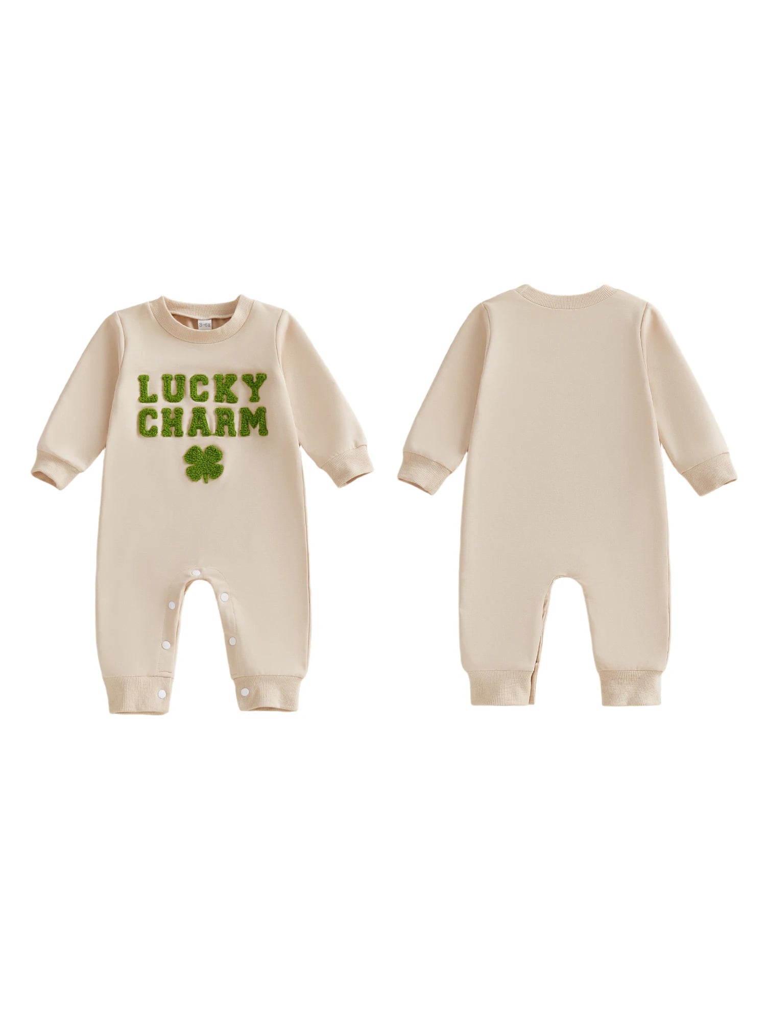Baby Boys Girls Lucky Charm Irish Romper Fashionable Letters Shamrock Embroidery Crew Neck Long Sleeve St. Patrick's Day Jumpsuit