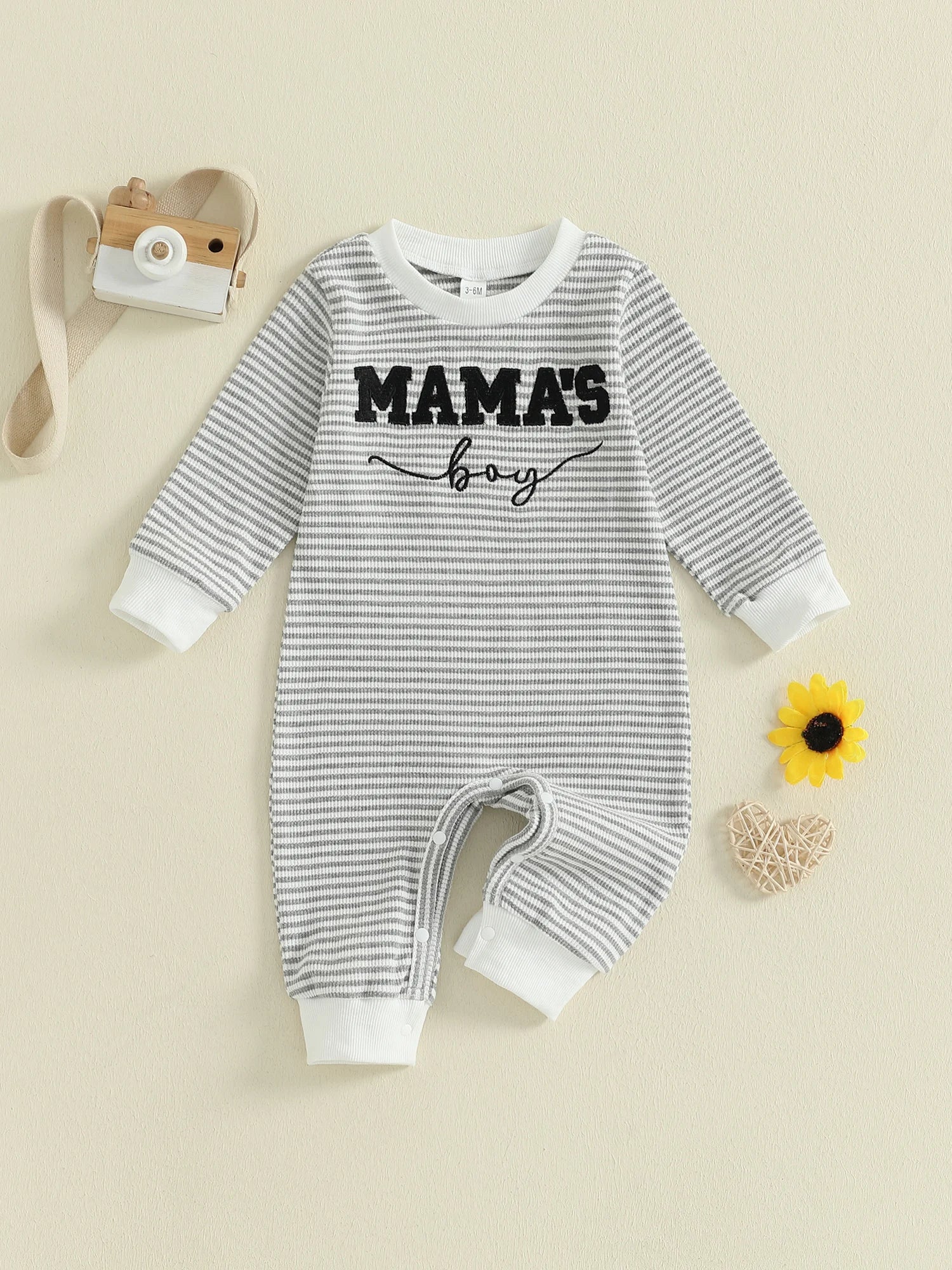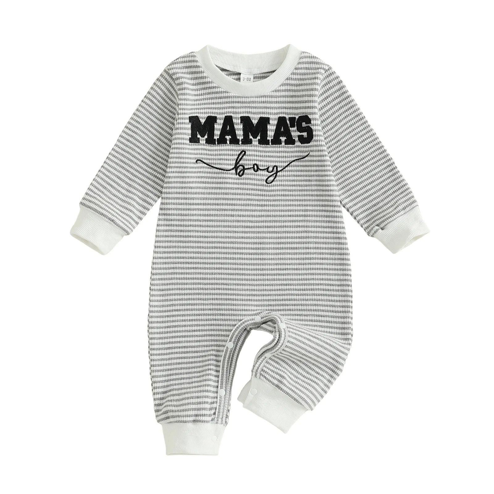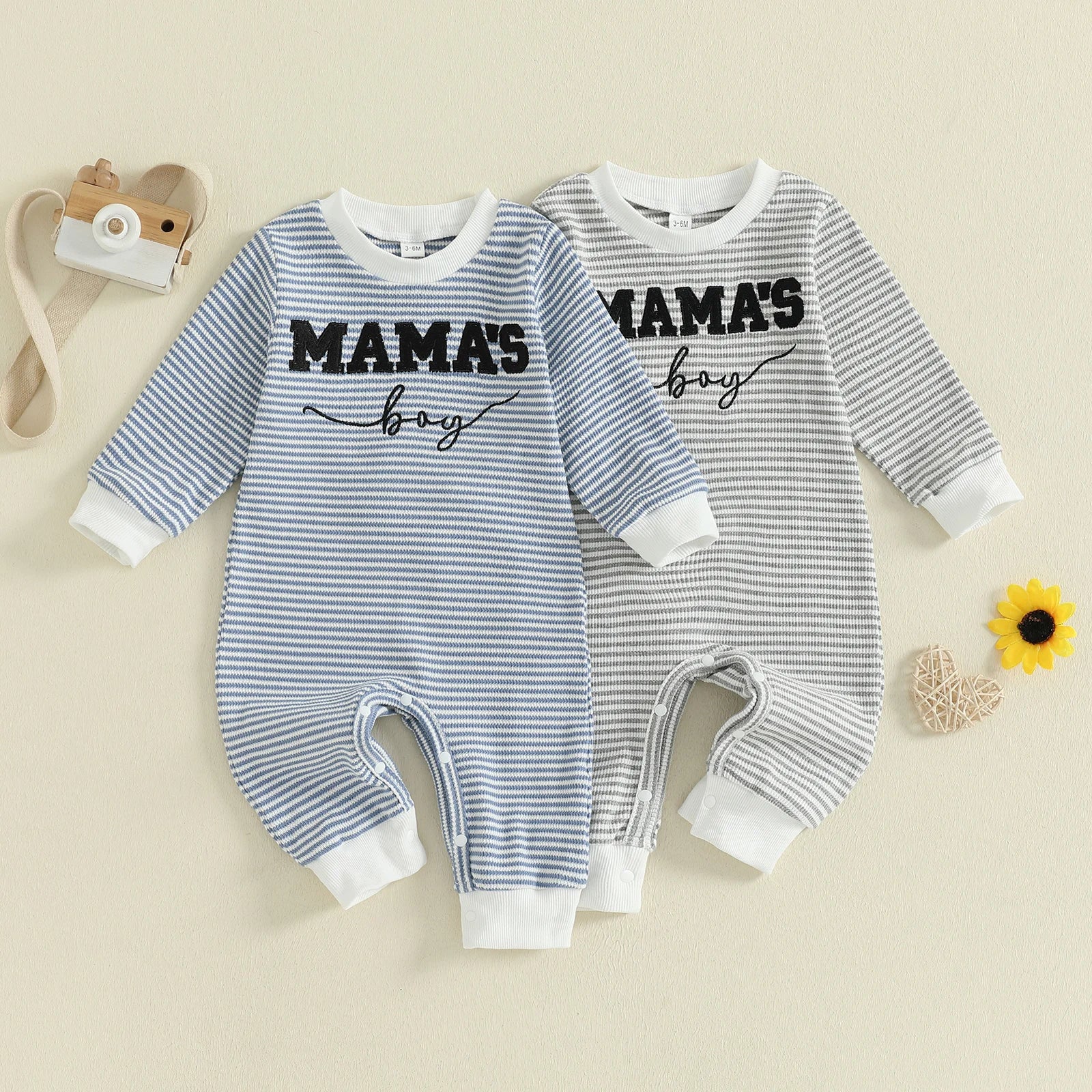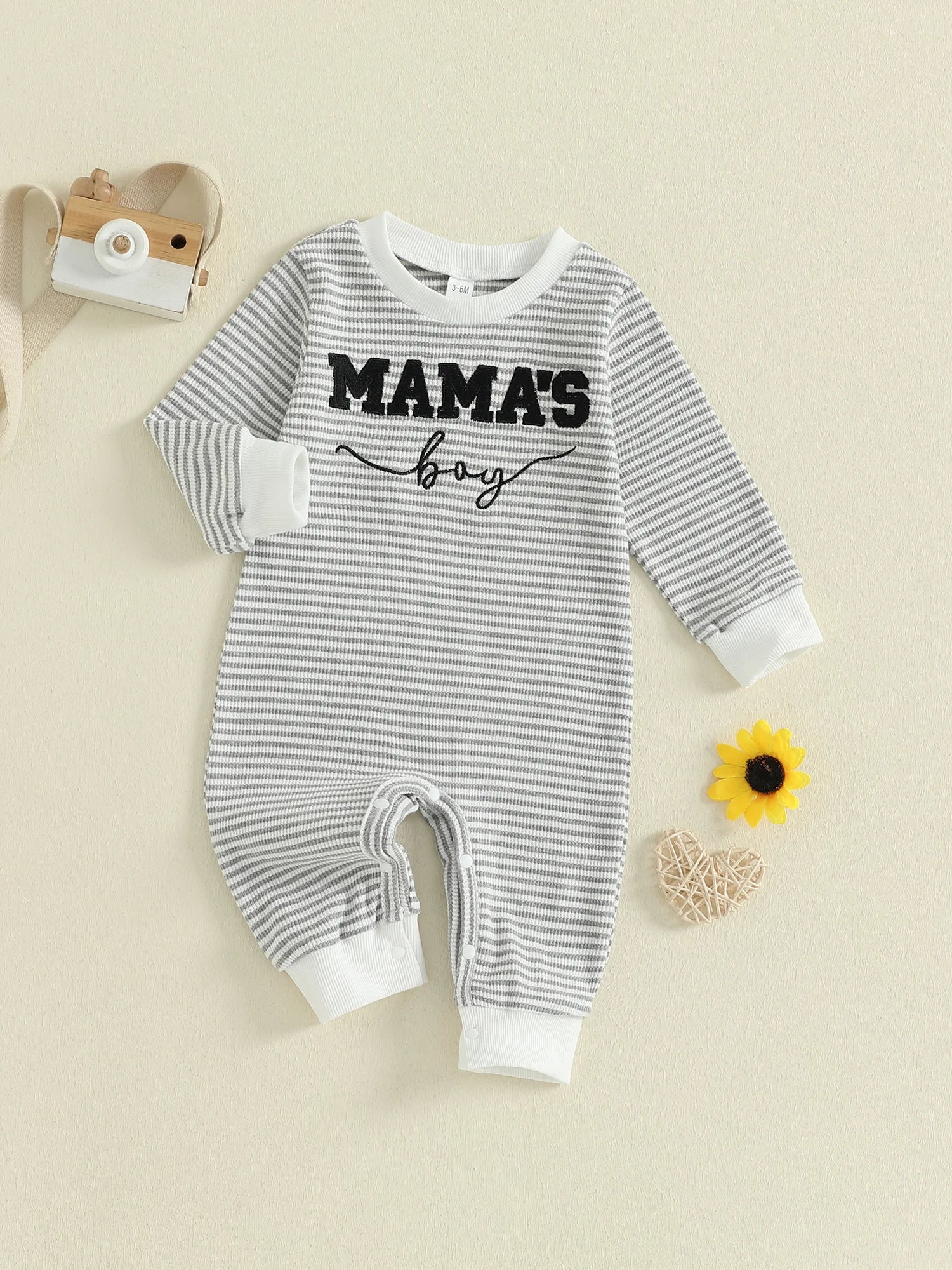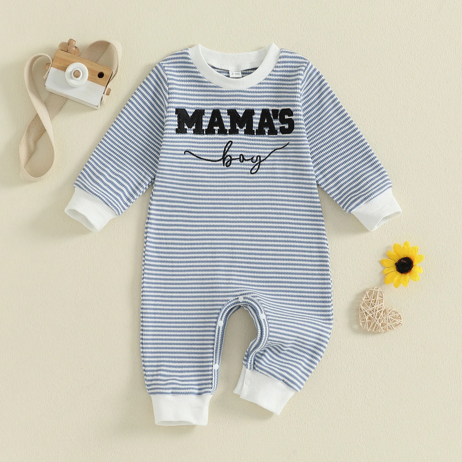 Baby Boys Mama's Boy Fall Romper Letter Embroidery Long Sleeve Round Neck Full Length Waffled Stripe Jumpsuit