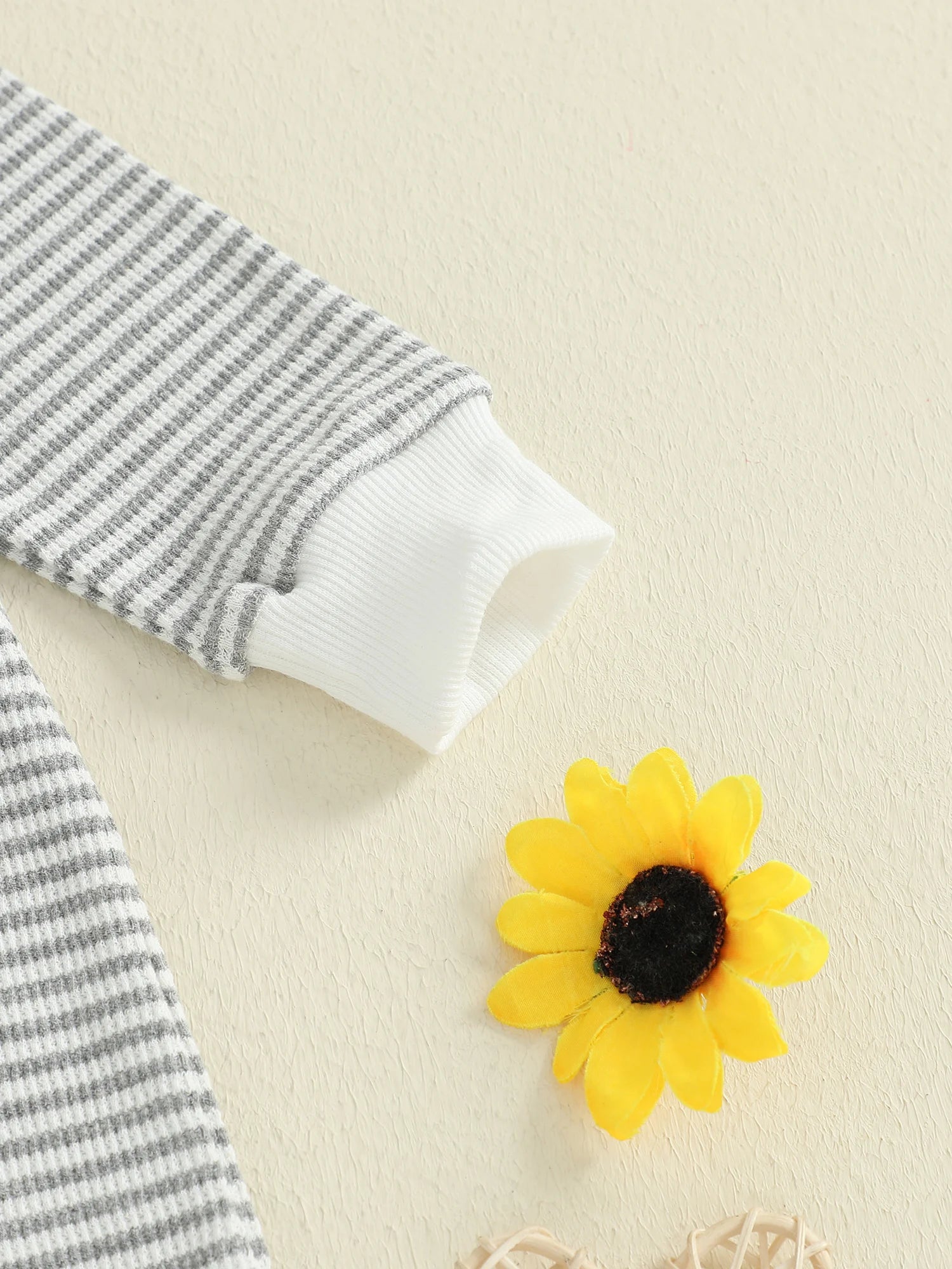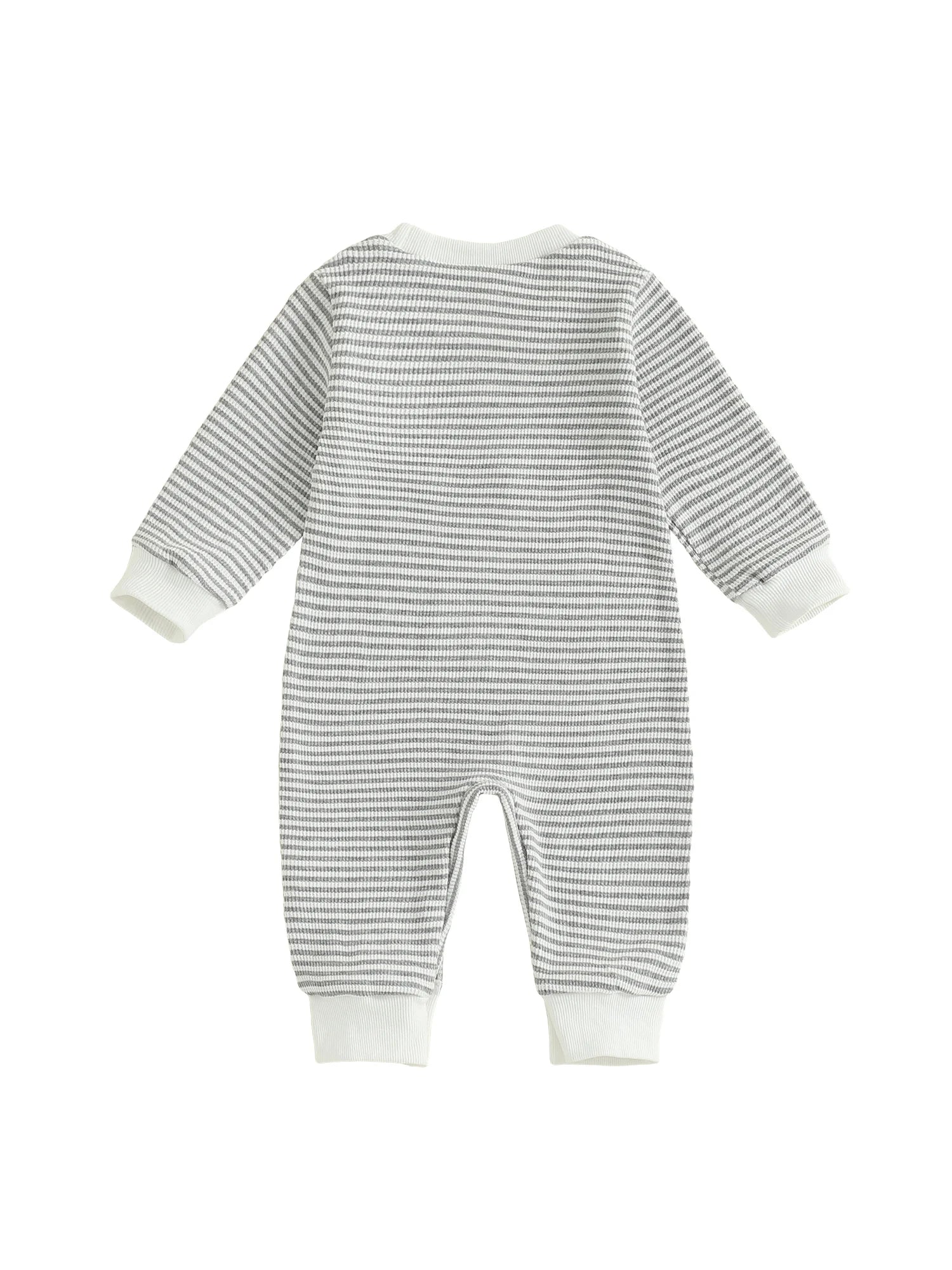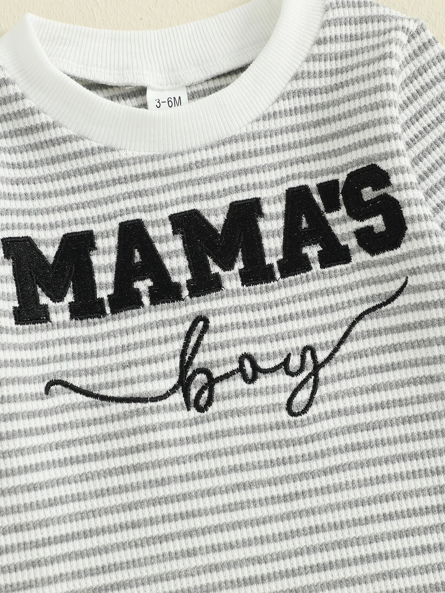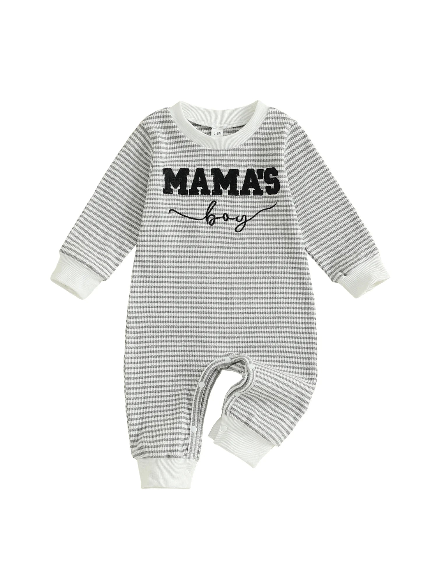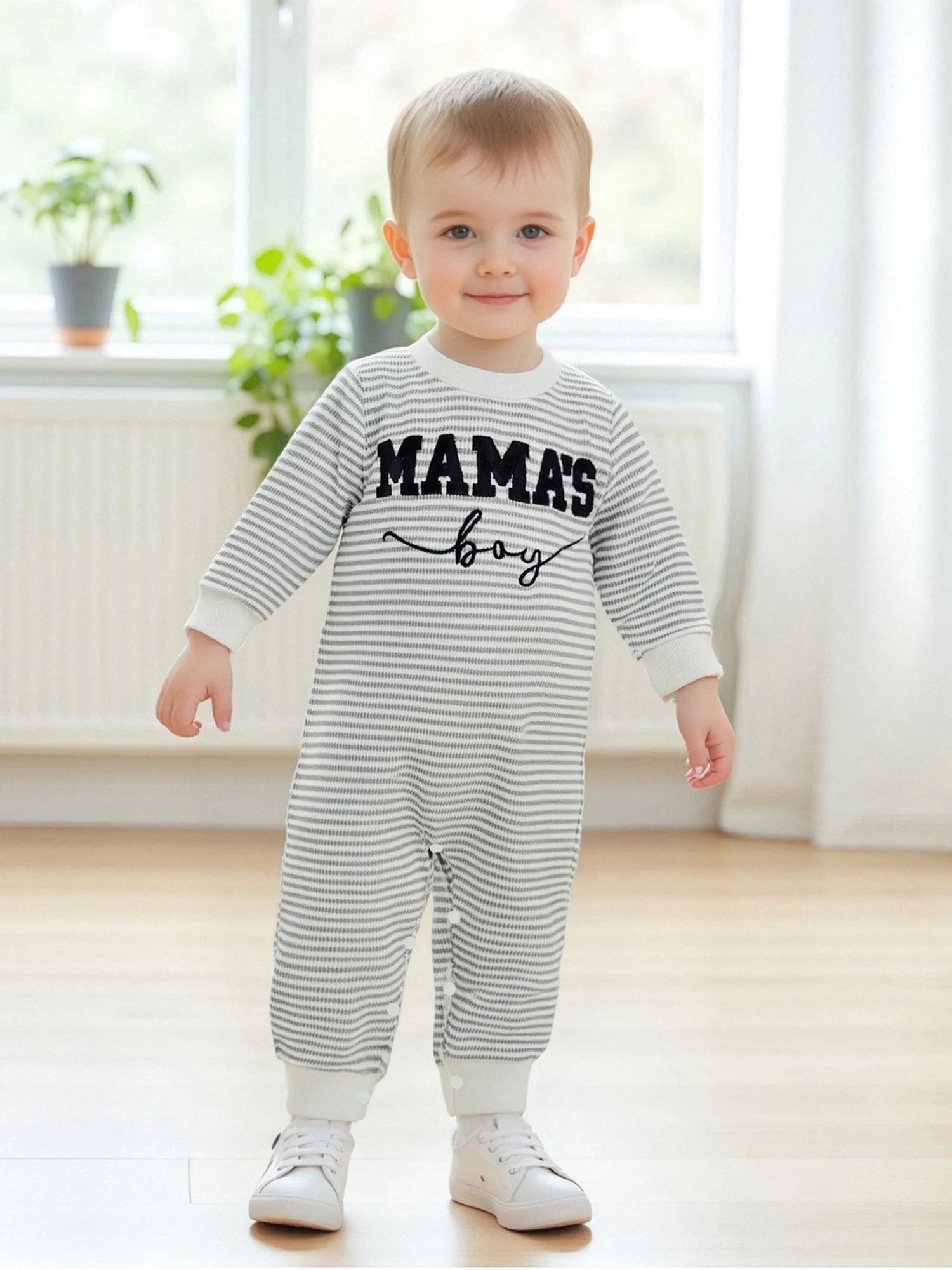 Baby Boys Mama's Boy Fall Romper Letter Embroidery Long Sleeve Round Neck Full Length Waffled Stripe Jumpsuit