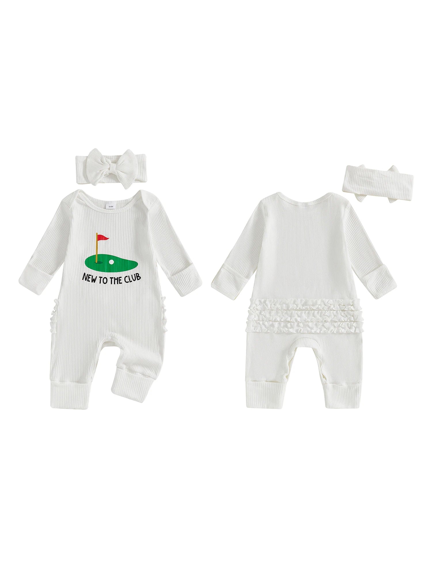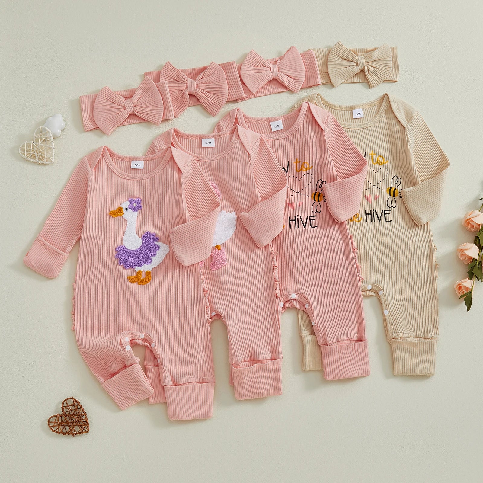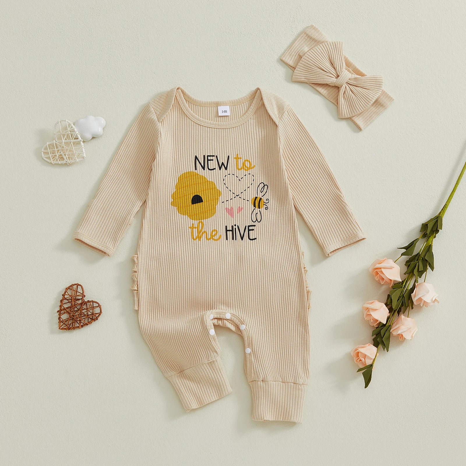 Baby Girl 2Pcs Fall Outfit Golf Goose Bee Print New to the Hive / Club Long Sleeve Ribbed Romper with Bow Headband 2Piece Set