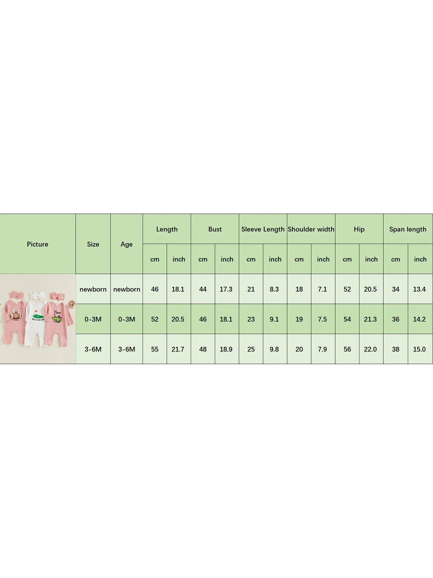 0-3M Length: 20.47 Bust: 18.11 Sleeve: 9.06 Shoulder: 7.48 Hip: 21.26 Advised Age: 0-3 Months