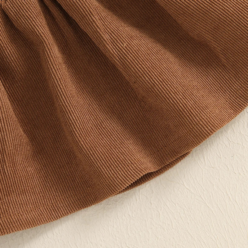 Baby Girl 2Pcs Fall Outfit Solid Ruffled Long Sleeve Crew Neck Romper with Corduroy Suspender Skirt 2Pcs Set