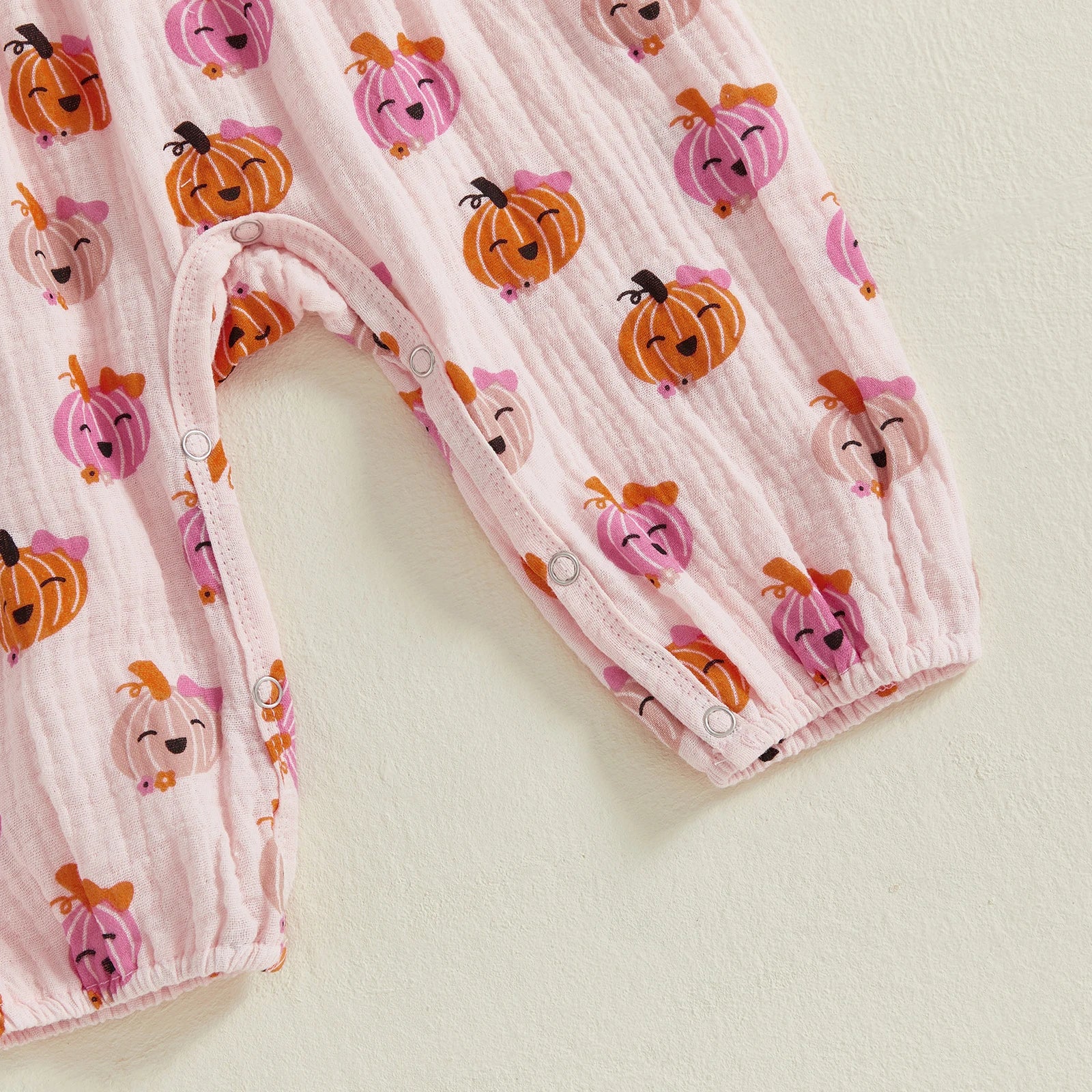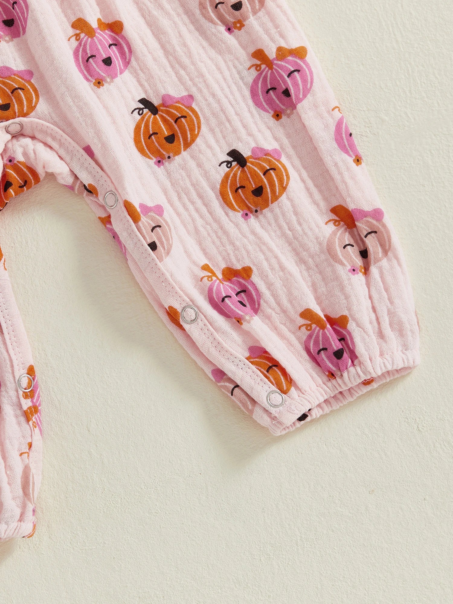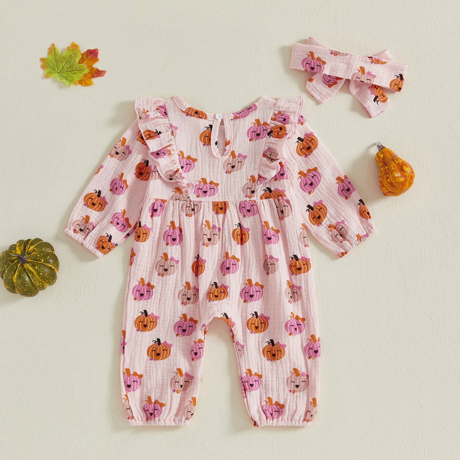 Baby Girl 2Pcs Halloween Outfit Pumpkin Ruffle Trim Long Sleeve Romper Tie-up Headband Cotton Linen Set