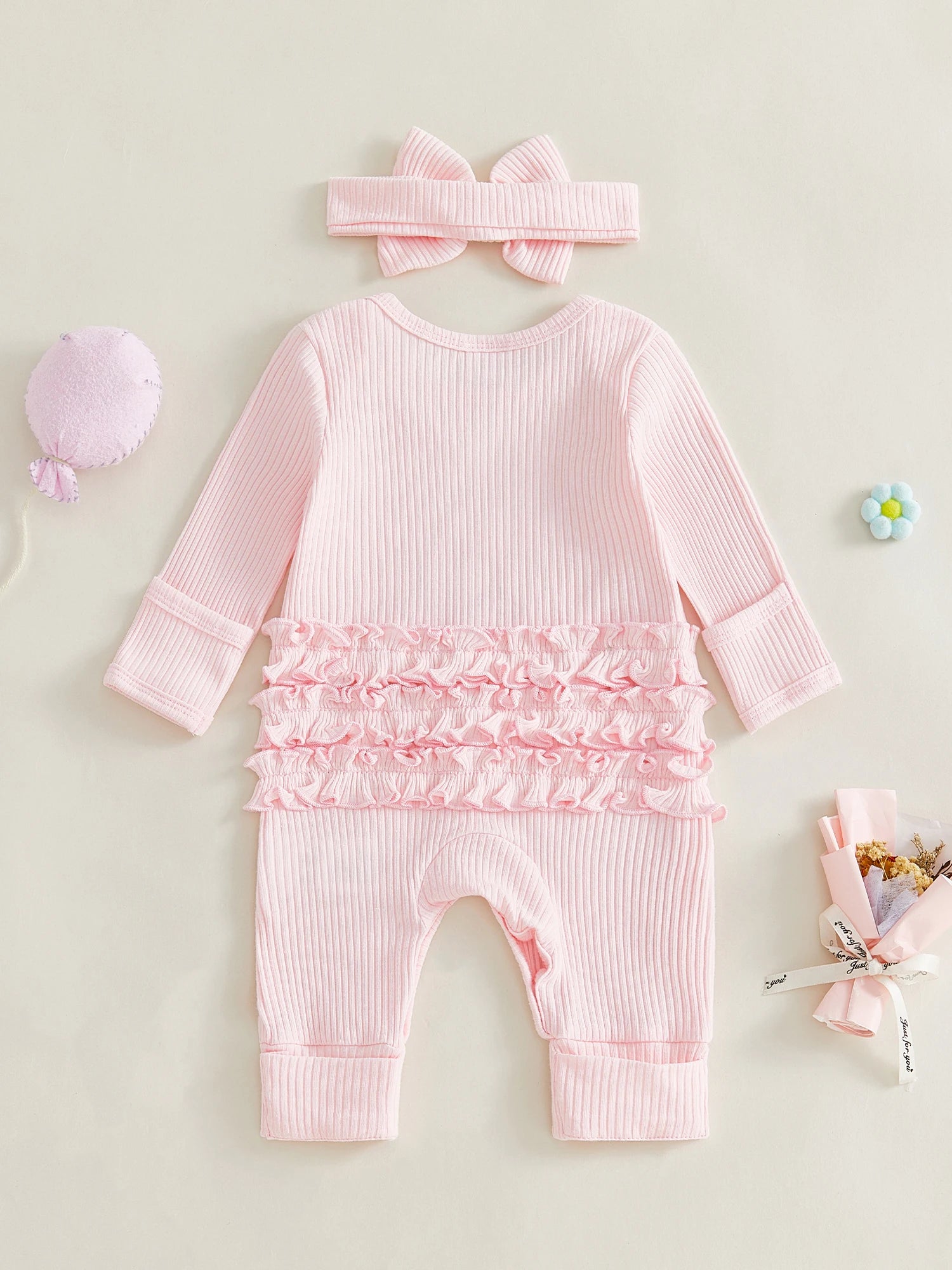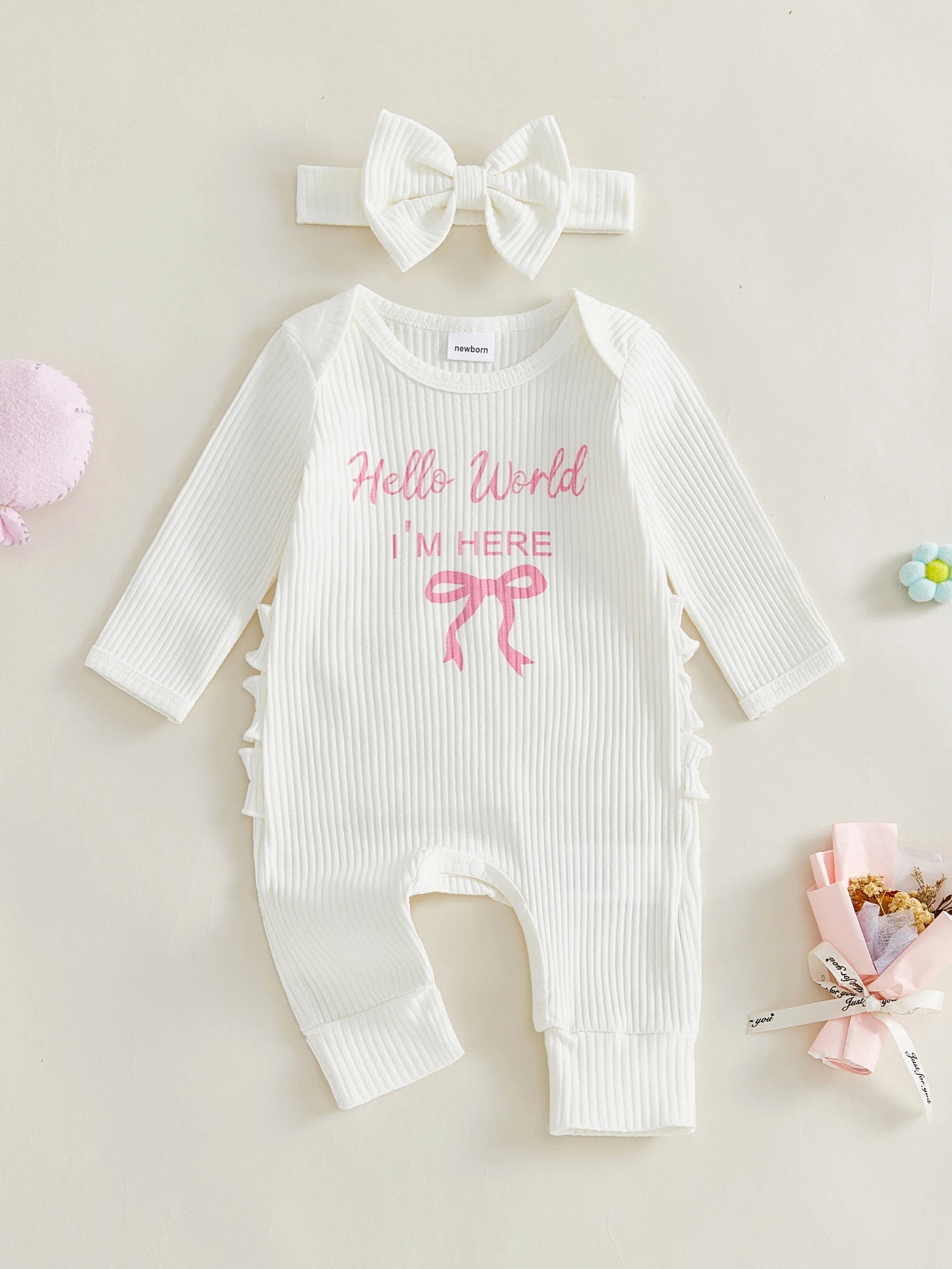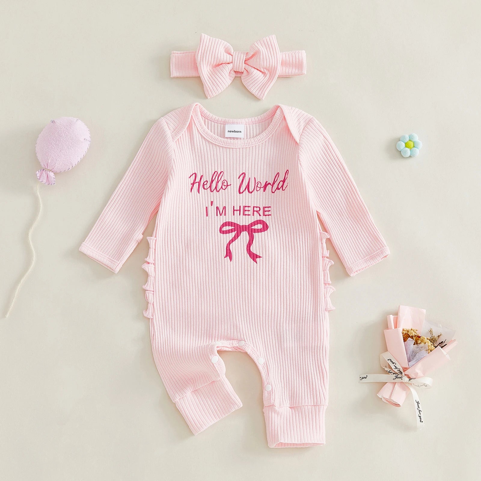 Baby Girl 2Pcs Hello World I'm Here Outfit Long Sleeve Crew Neck Letters Bow Print Romper with Bow Headband Set