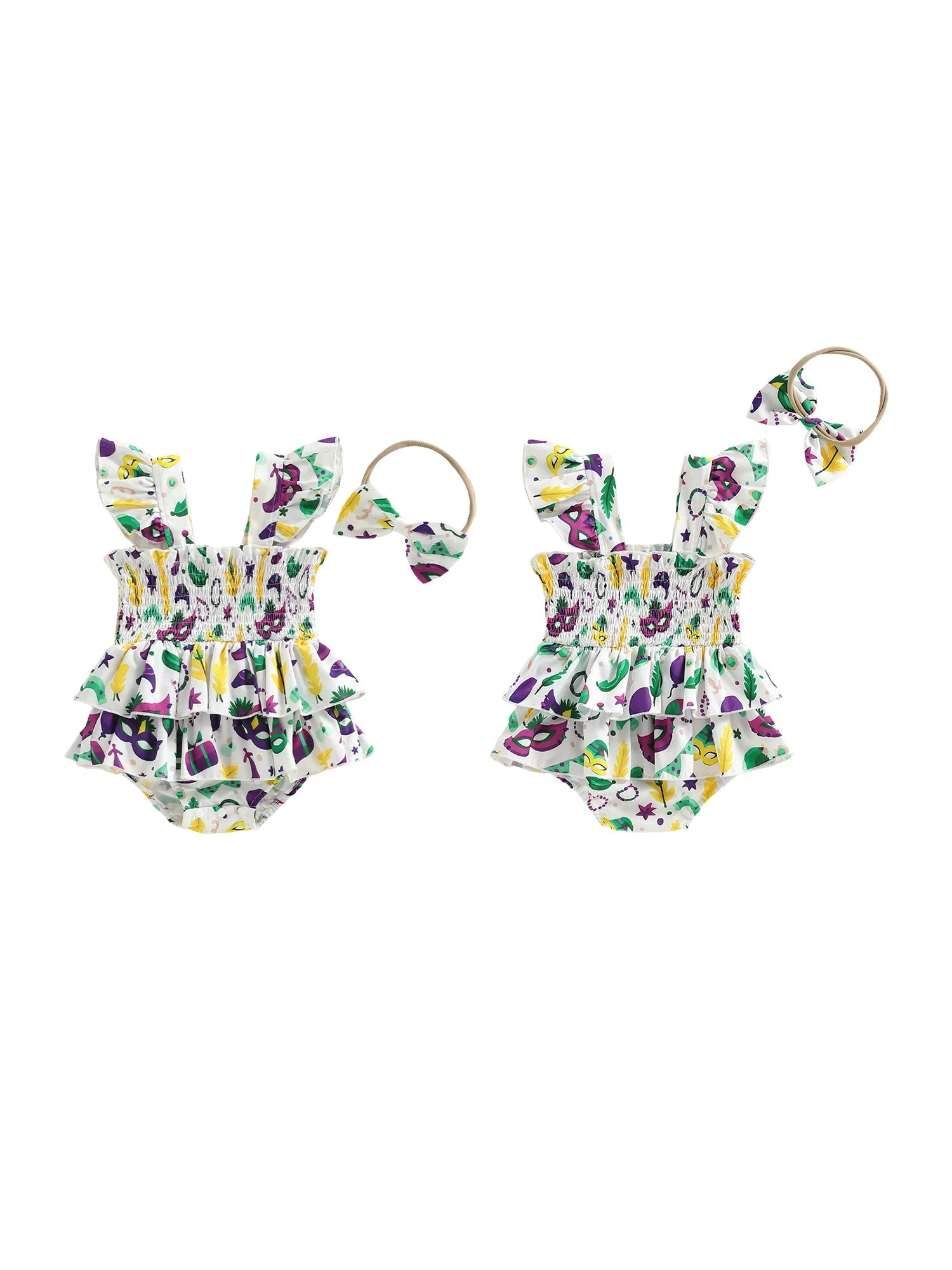 Baby Girl 2Pcs MardiGras Outfit Flying Sleeve Square Neck Mask Print Romper Dress with Bow Headband Set