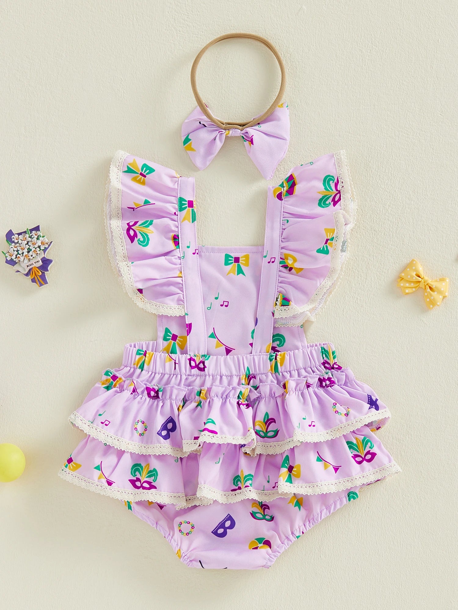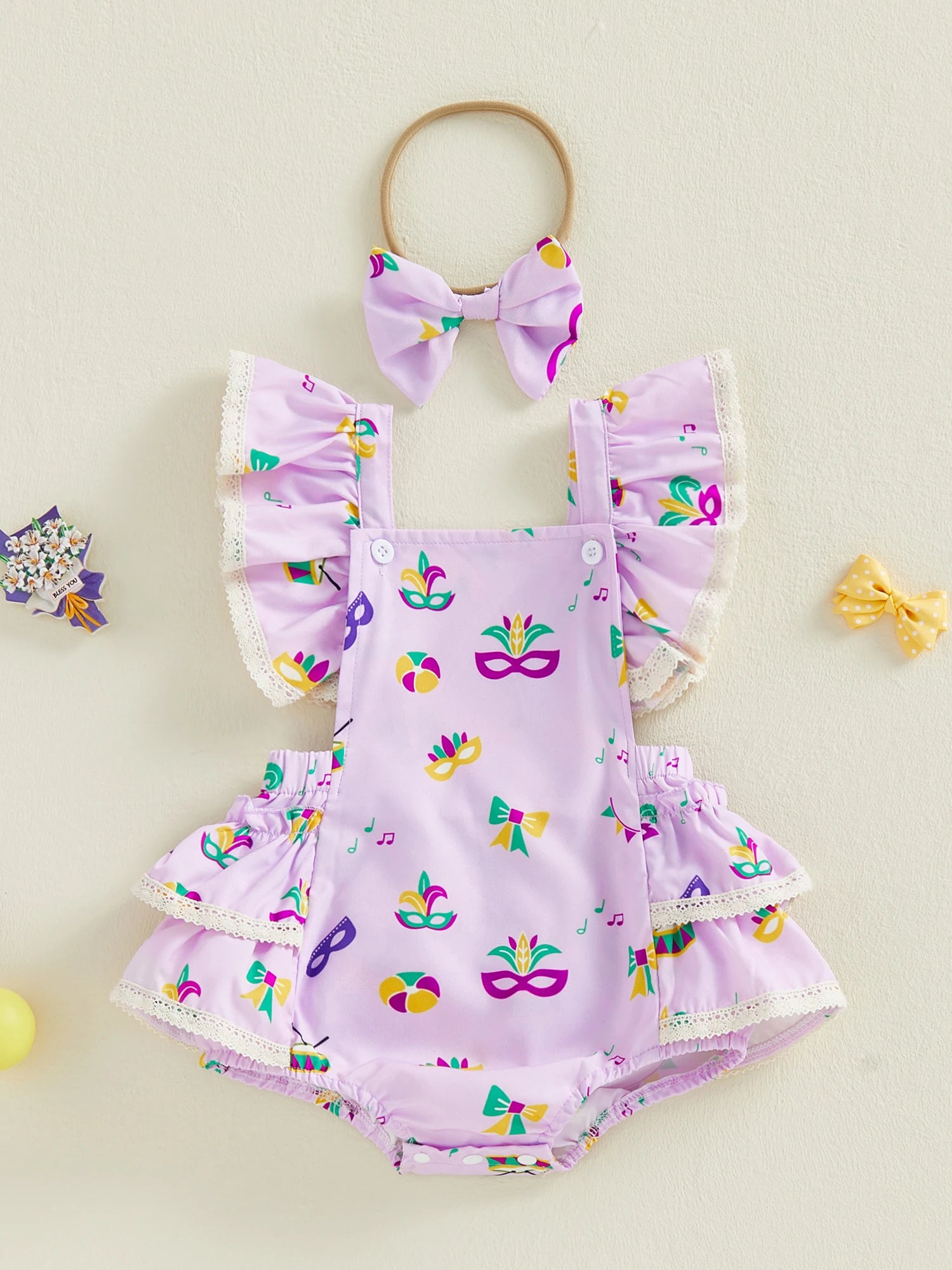 Baby Girl 2Pcs MardiGras Outfit Ruffled Trim Flying Sleeve Romper and Bow Headband Set
