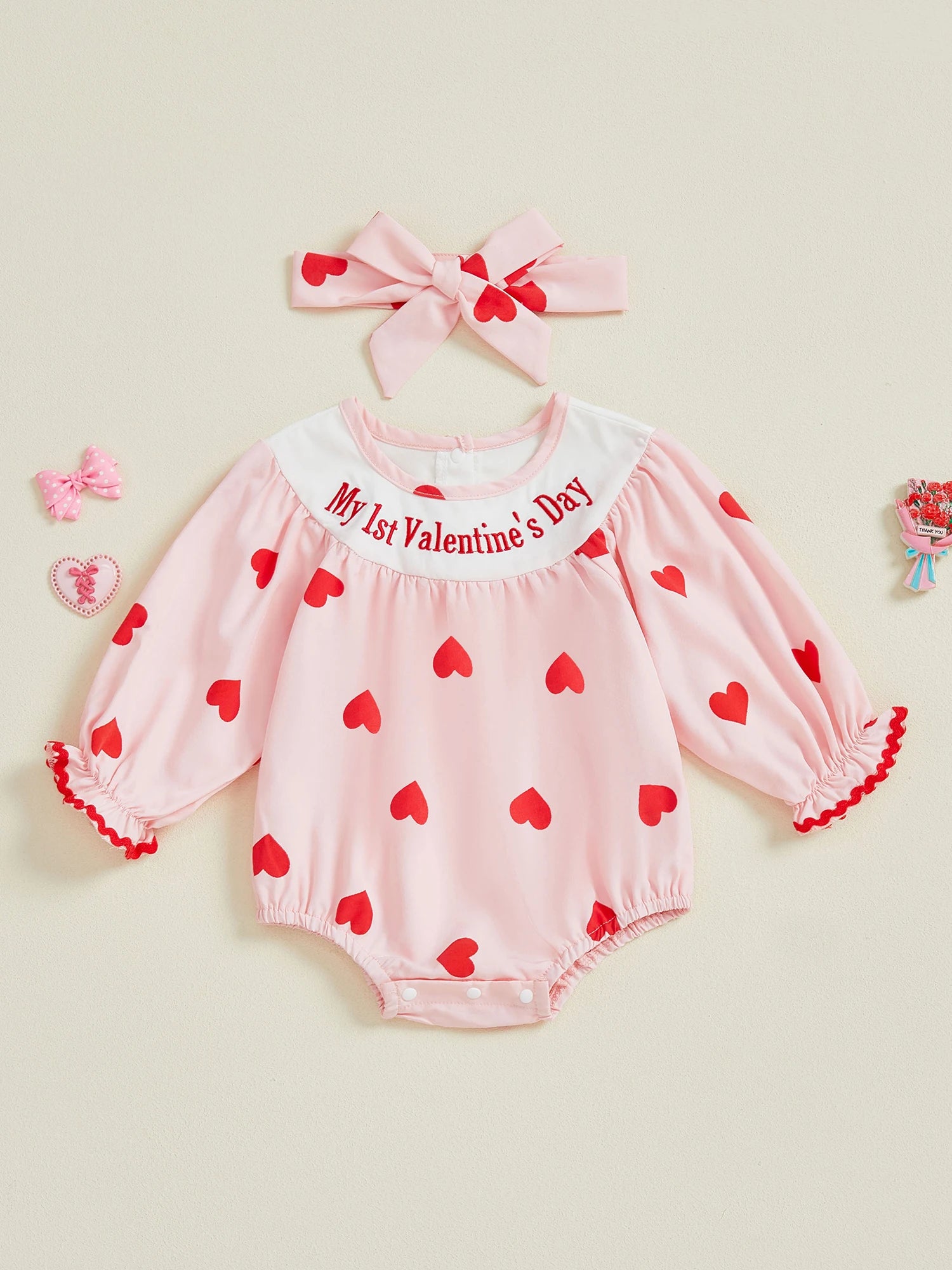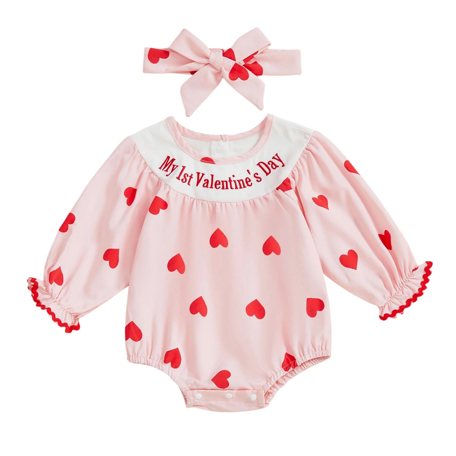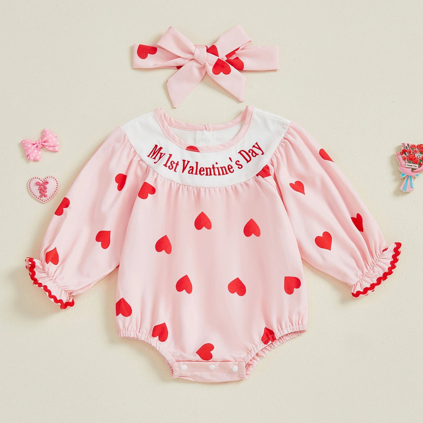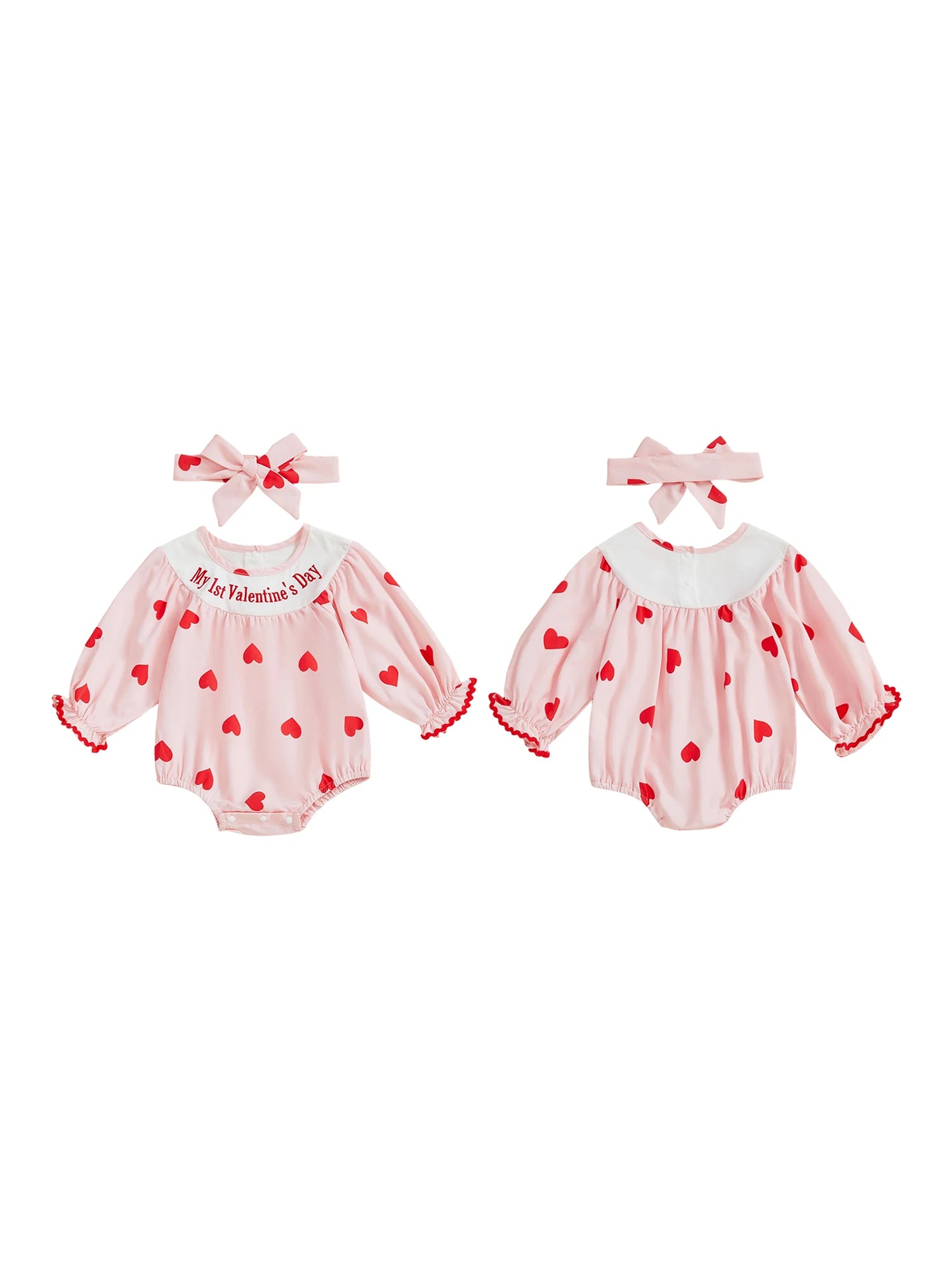 Baby Girl 2Pcs My 1st Valentine's Day Romper with Heart Print and Letter Embroidery Long Sleeve Infant Jumpsuit with Matching Headband Set