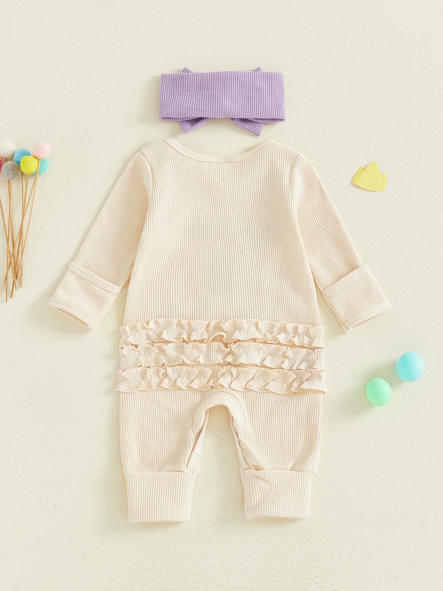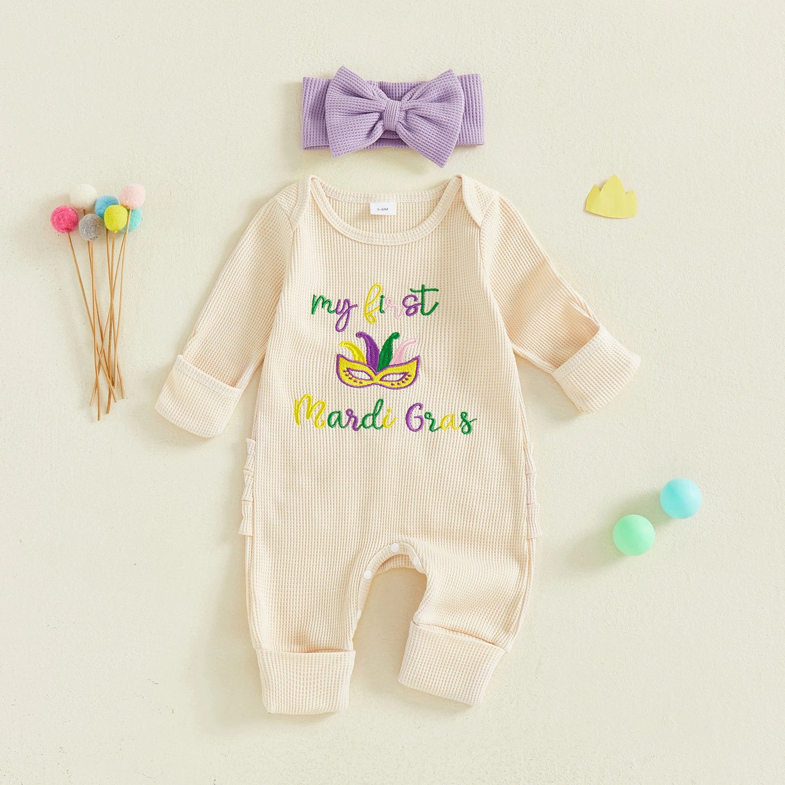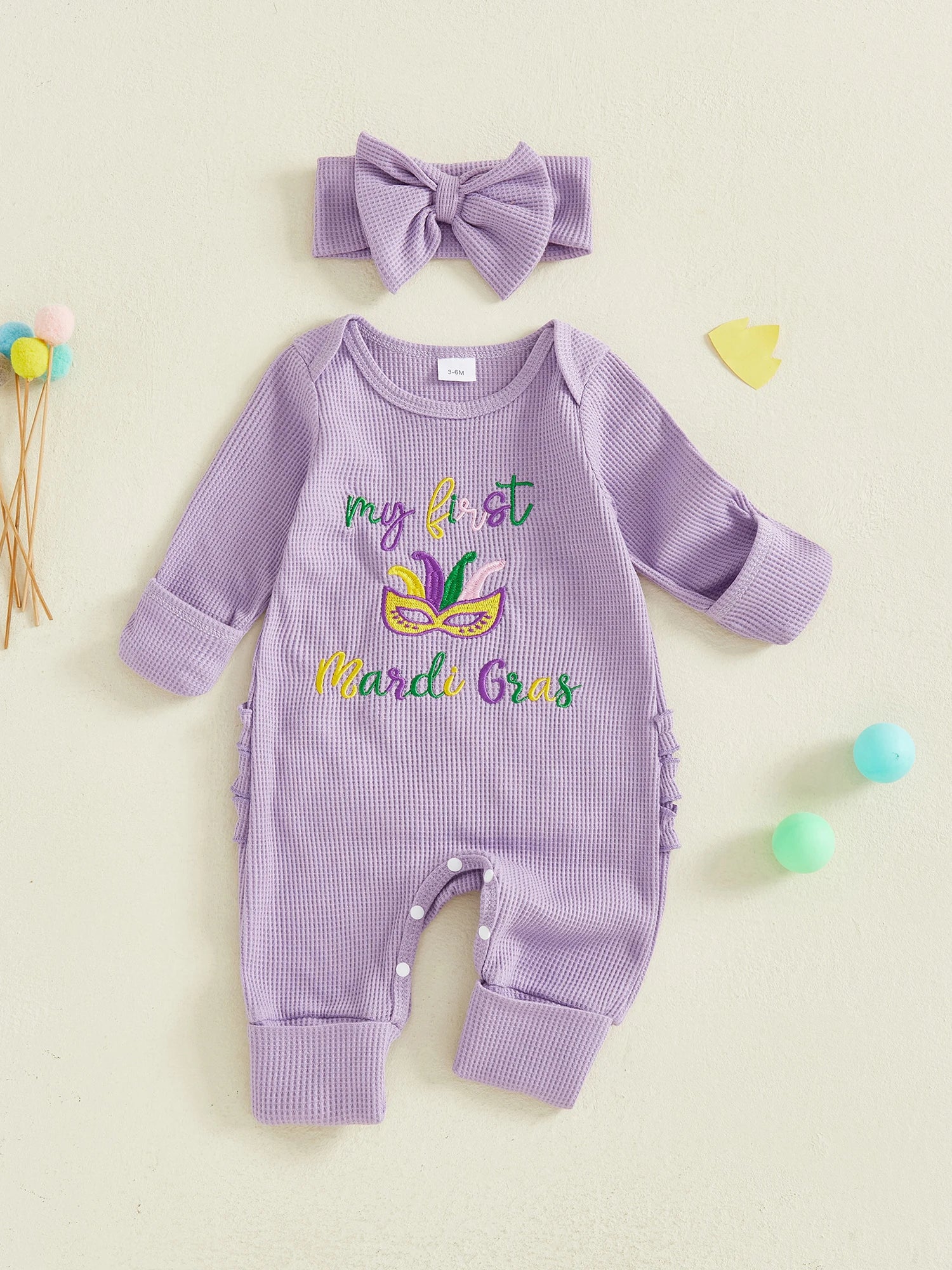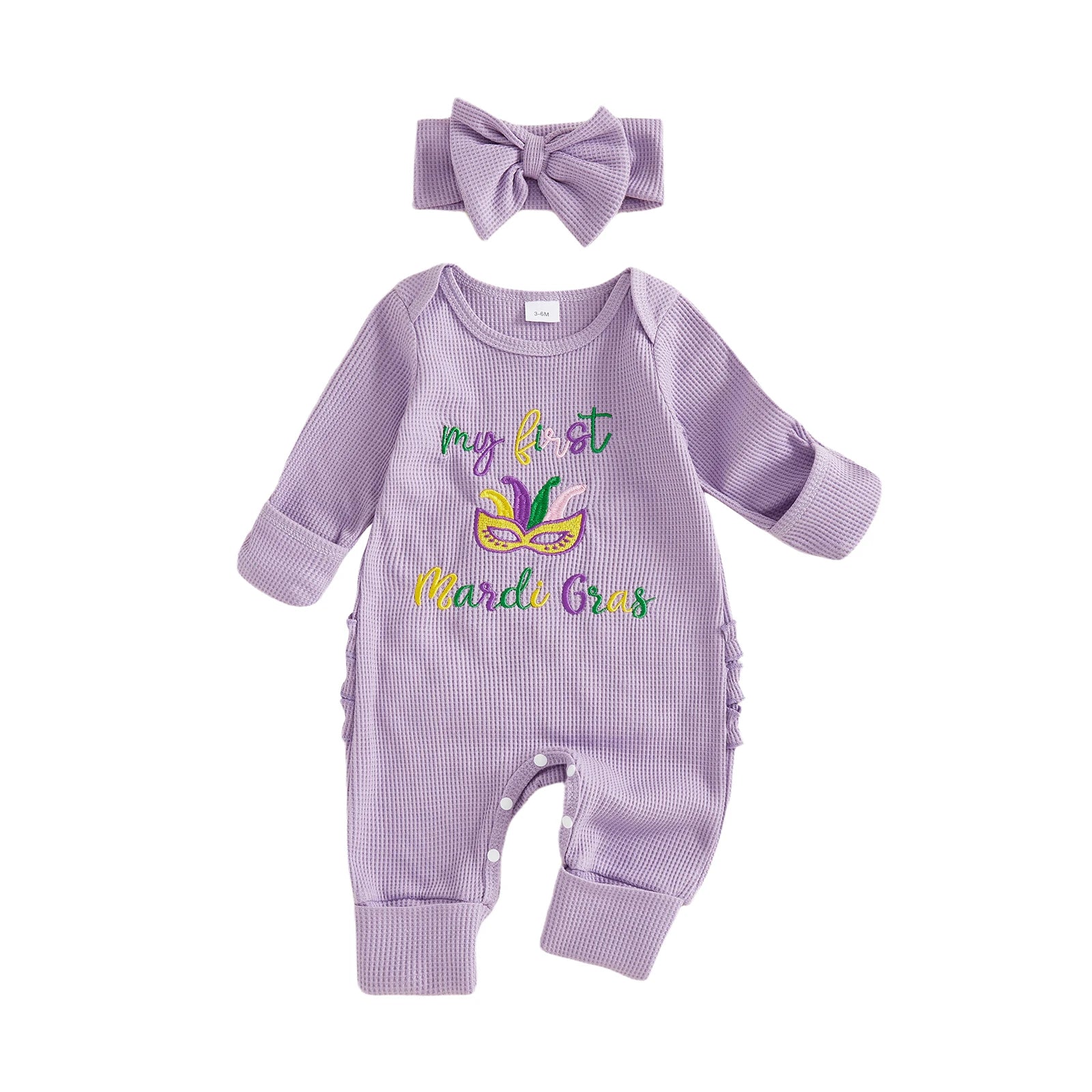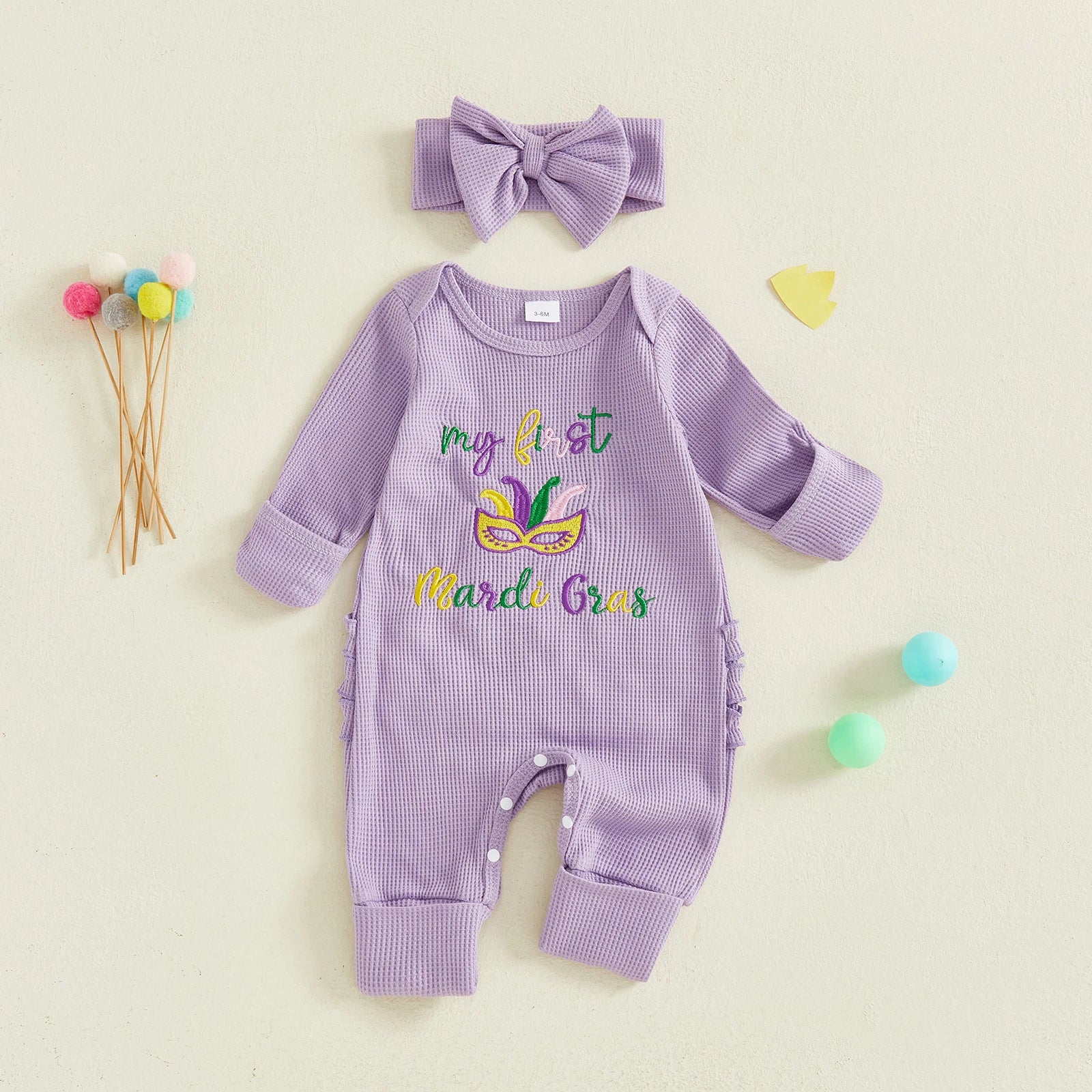 Baby Girl 2Pcs My First Mardi Gras Romper Letter Embroidery Full Length Long Sleeve Crew Neck Bodysuit Bow Headband Set