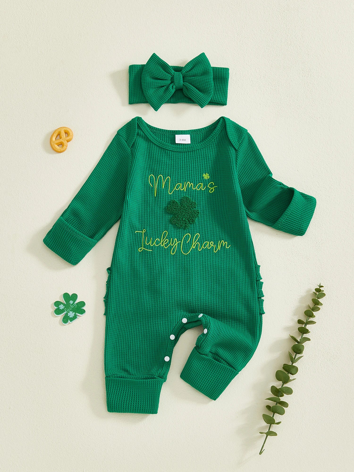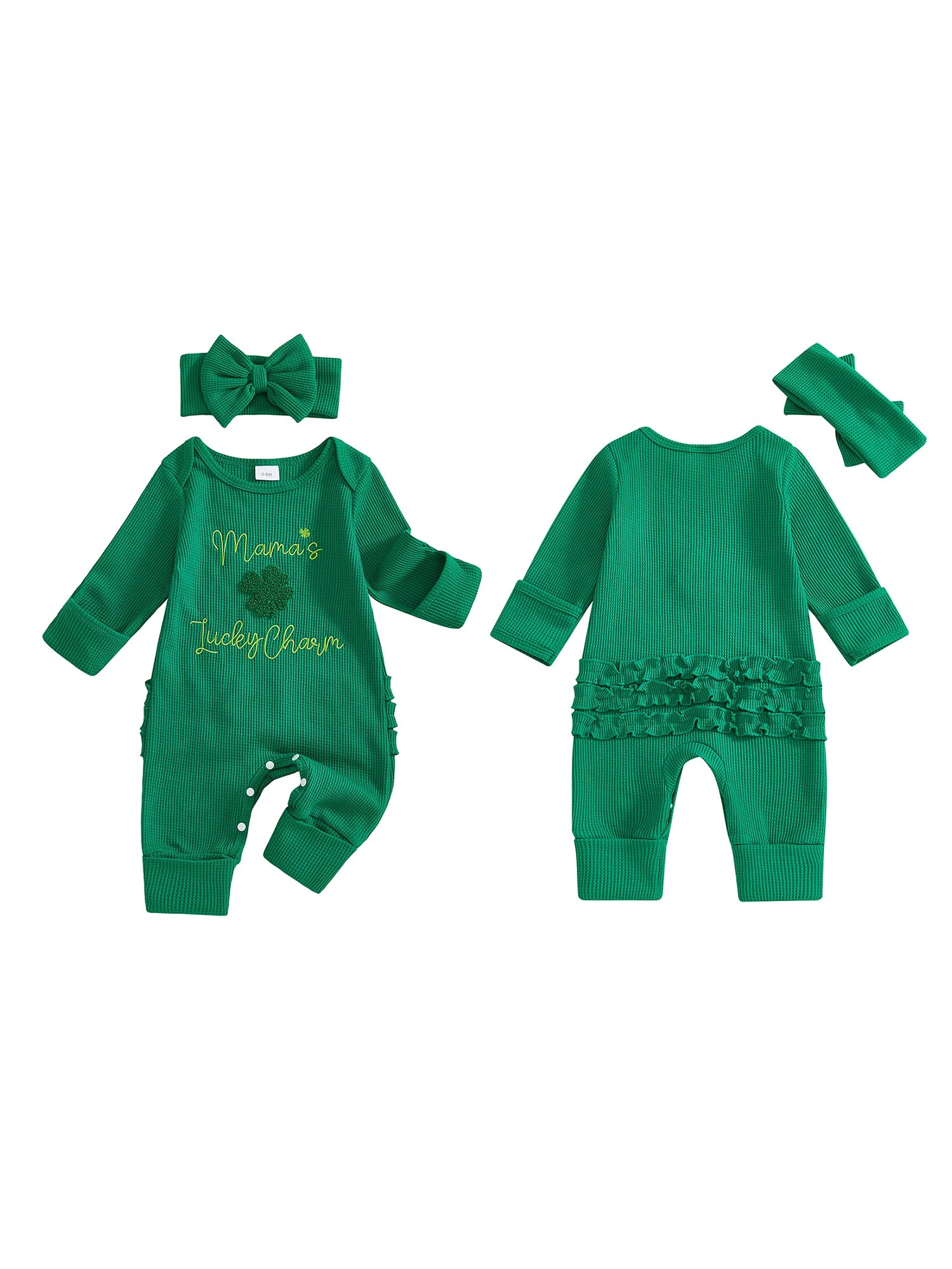 Baby Girl 2Pcs My First St. Patrick's Day Spring Romper Long Sleeve O Neck Letter Clover Embroidery Jumpsuit with Headband Set