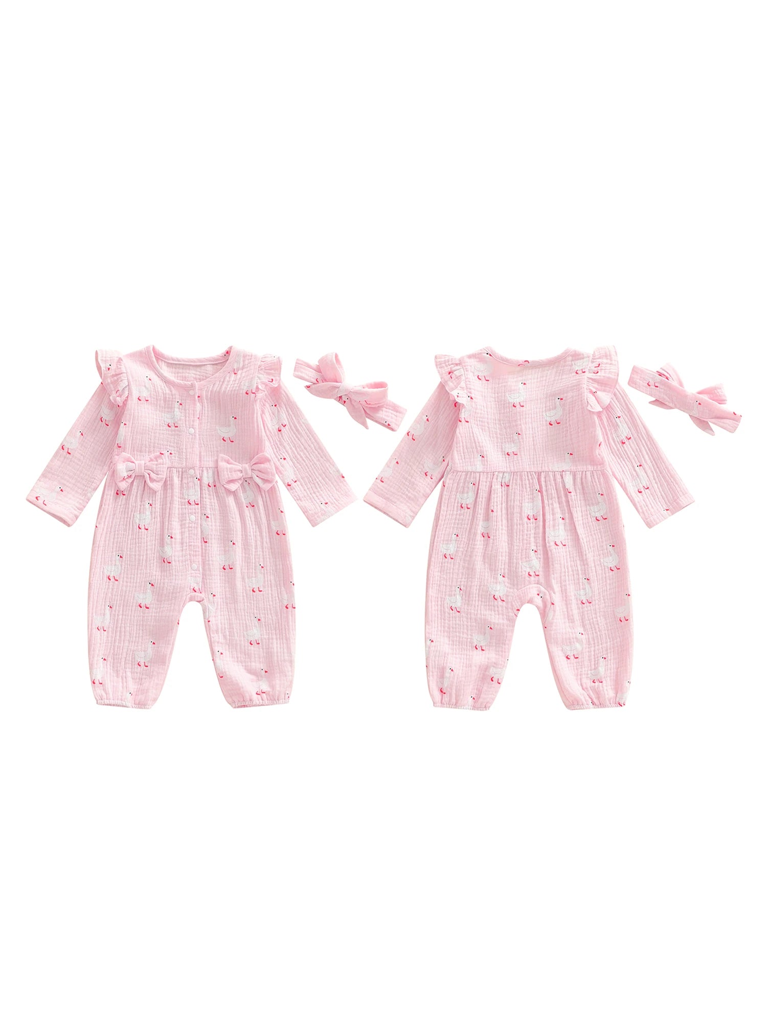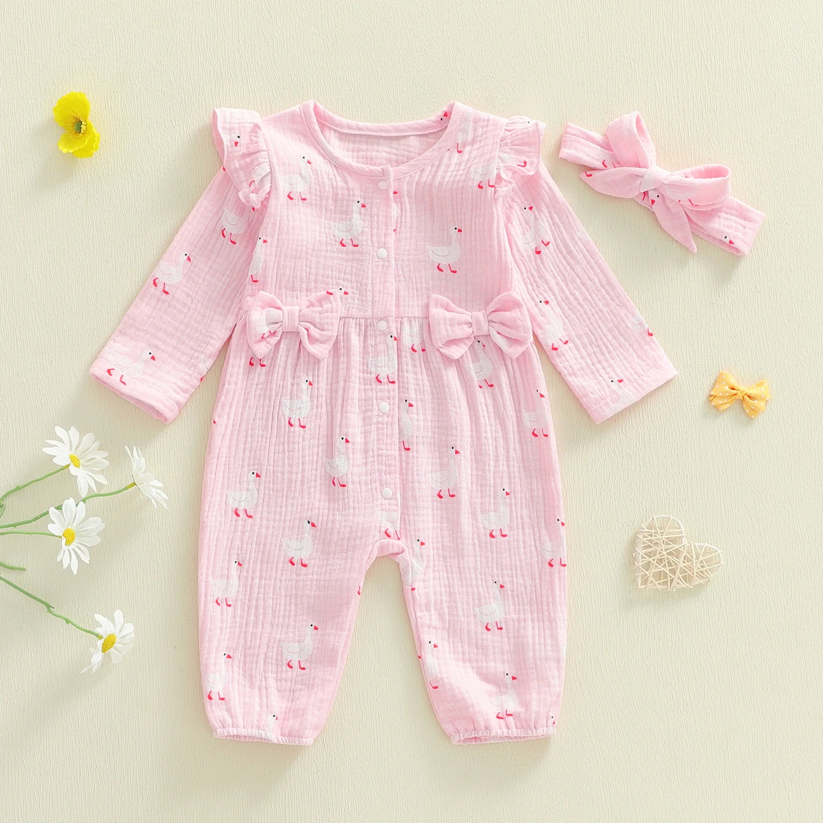 Baby Girl 2Pcs Outfit Duck Bow Ruffle Long Sleeve Romper and Headband 2 Piece Set