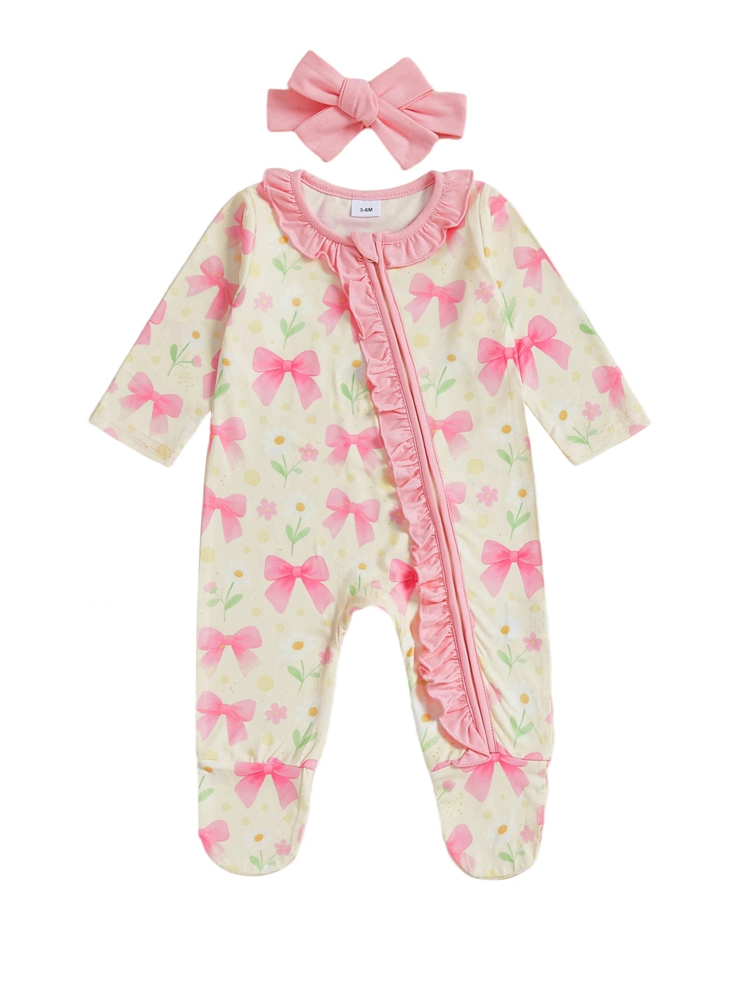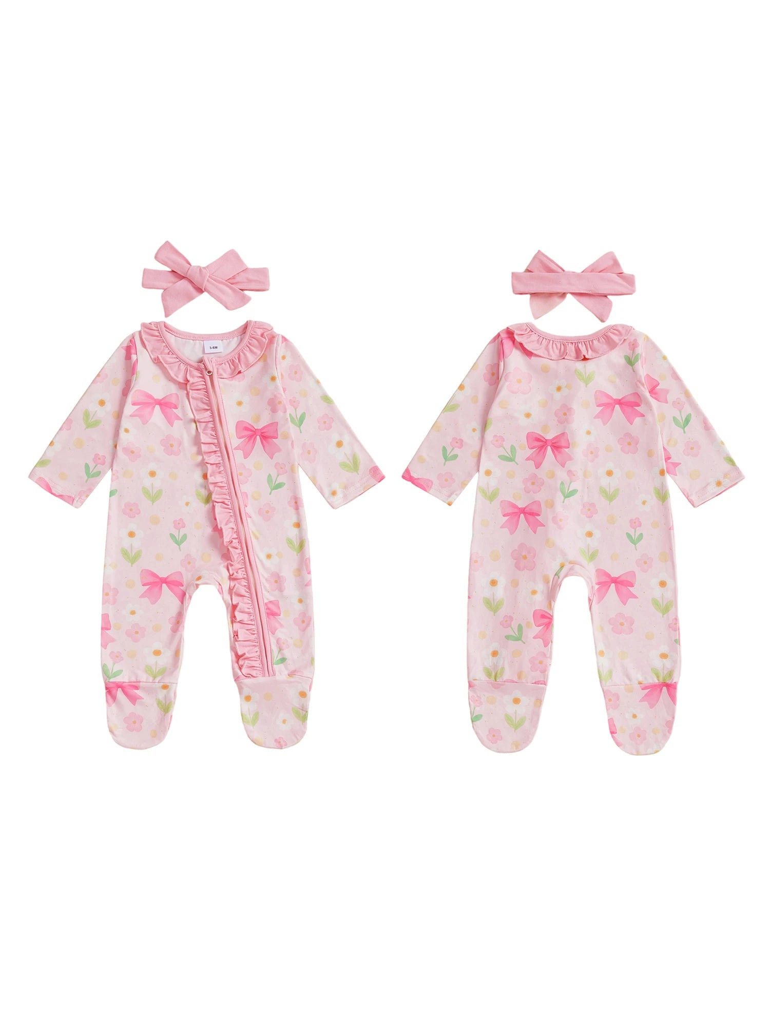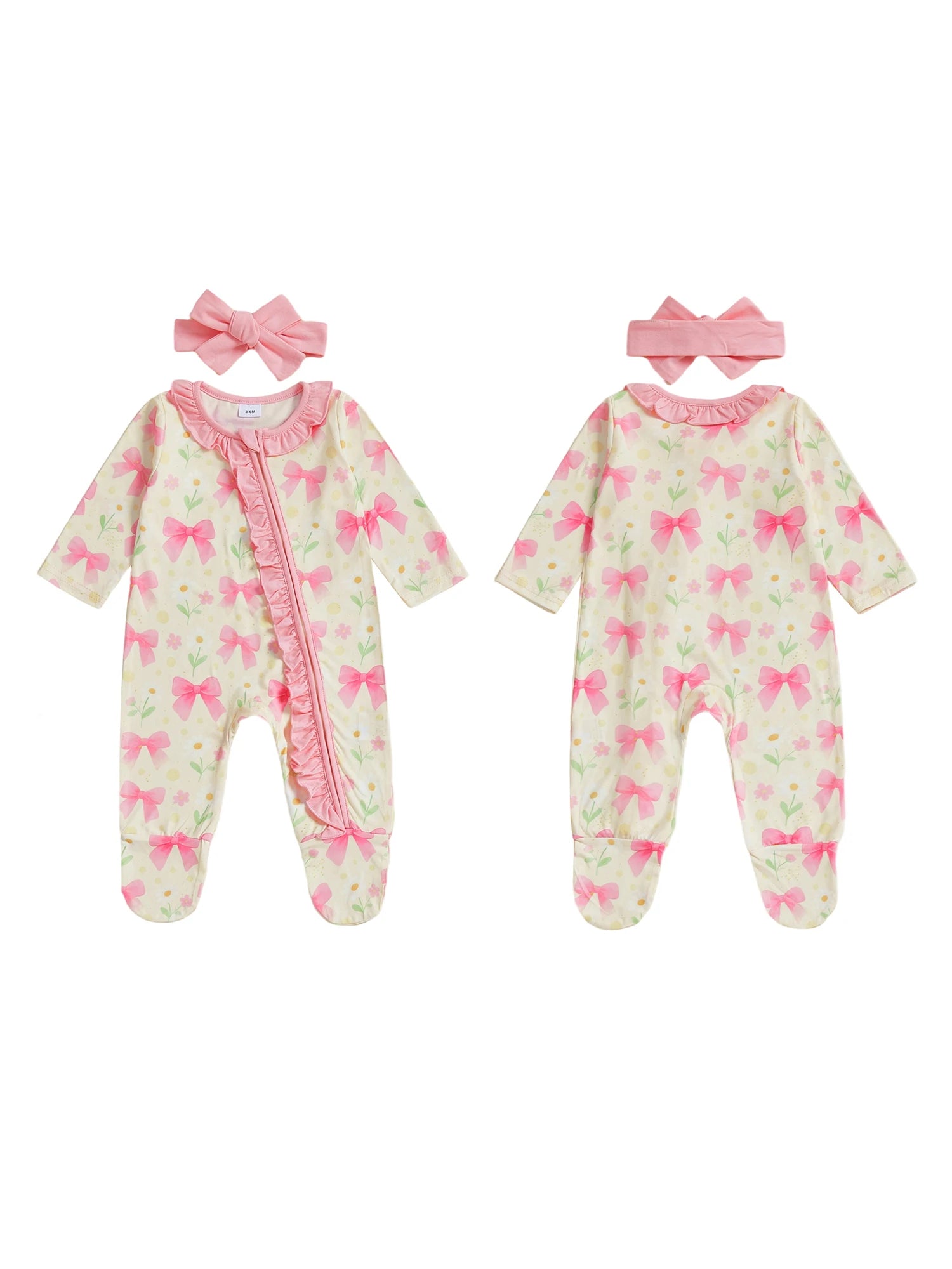 Baby Girl 2Pcs Pink Romper Set with Matching Headband Long Sleeves Floral Bow Print and Ruffled Details - Zip Up Jumpsuit Zipper Romper