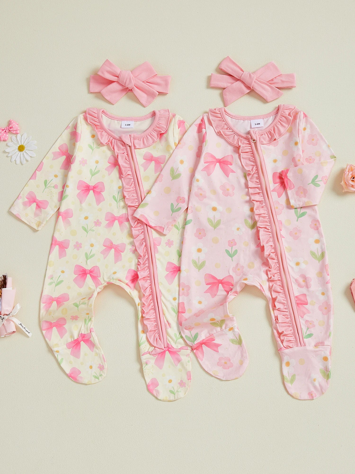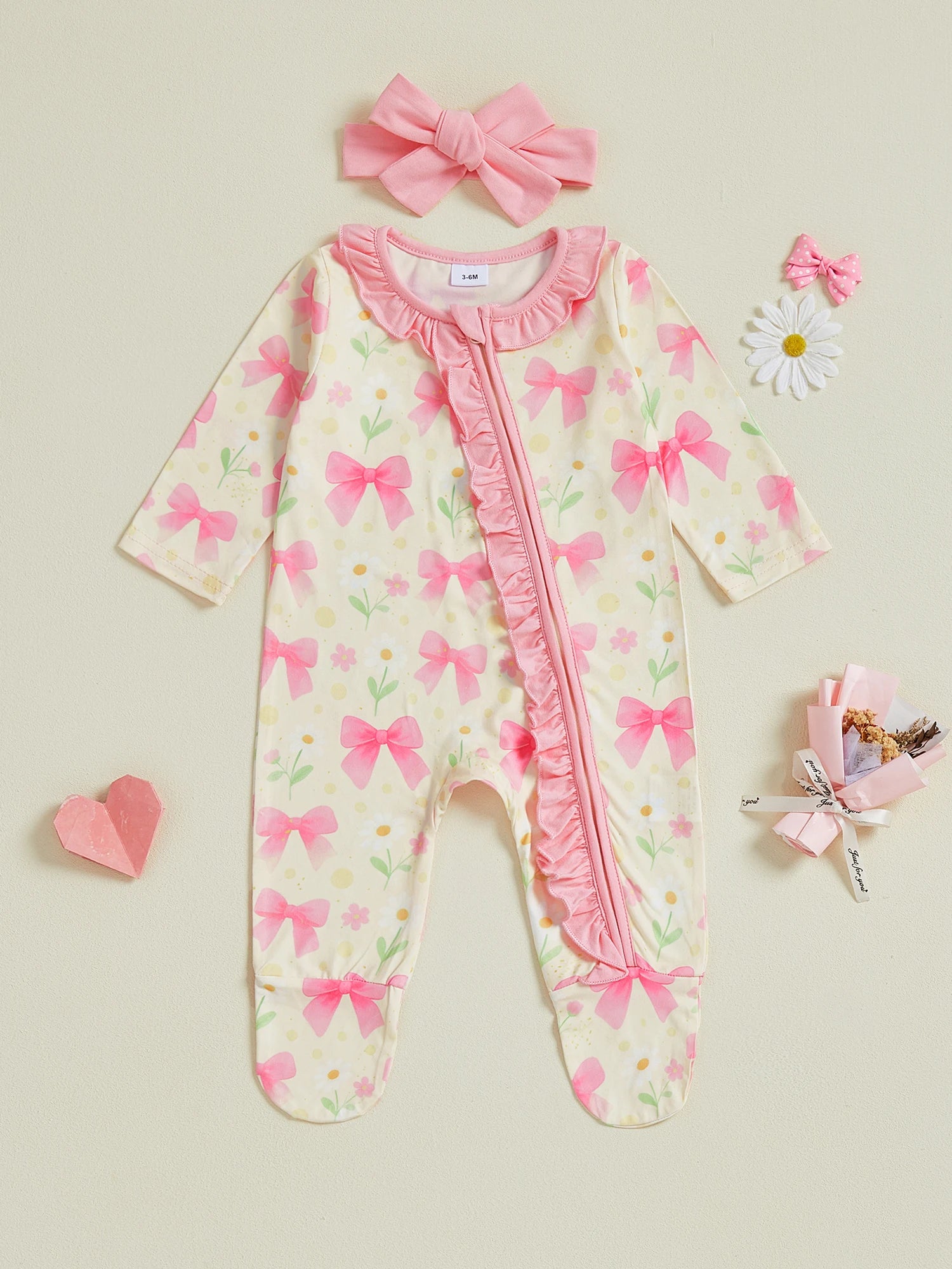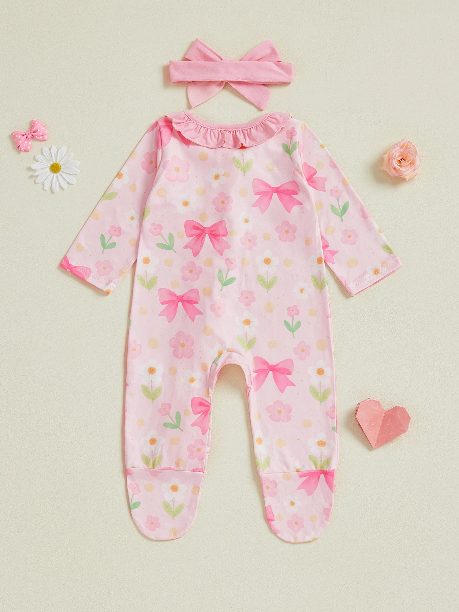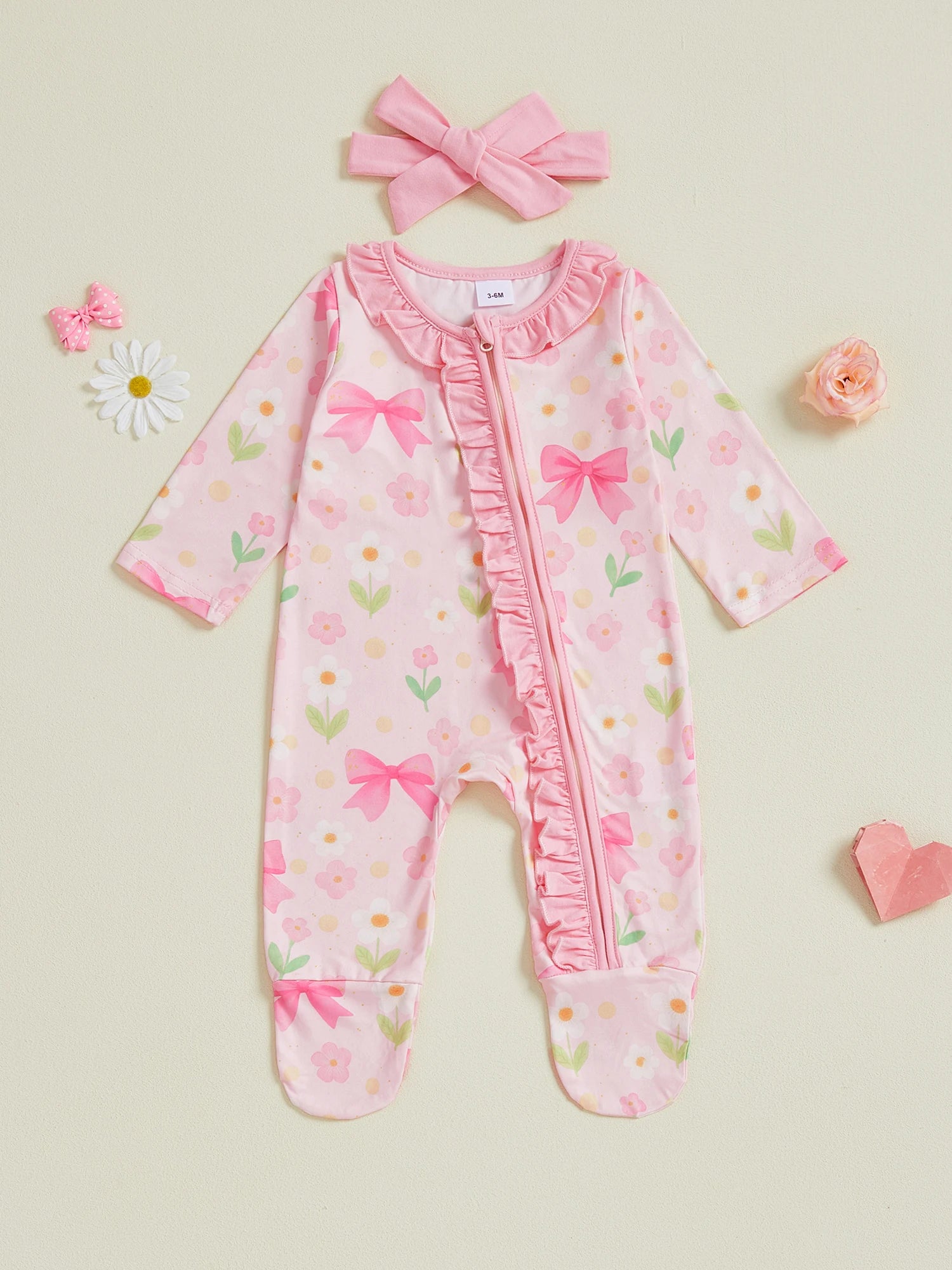 Baby Girl 2Pcs Pink Romper Set with Matching Headband Long Sleeves Floral Bow Print and Ruffled Details - Zip Up Jumpsuit Zipper Romper