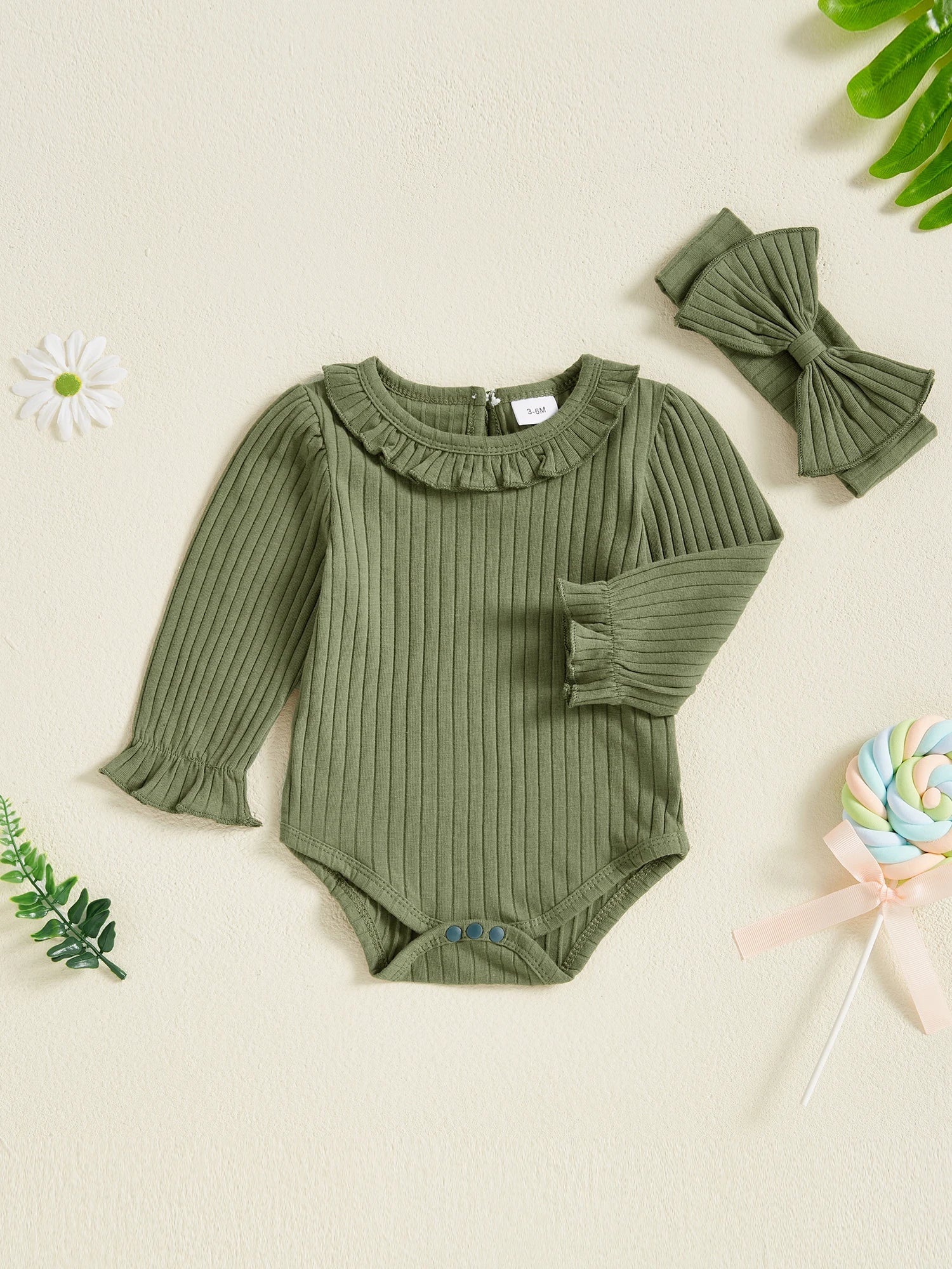 Baby Girl 2Pcs Spring Outfit Long Puff Sleeve Solid Color Bodysuit with Headband Set Infant Clothes