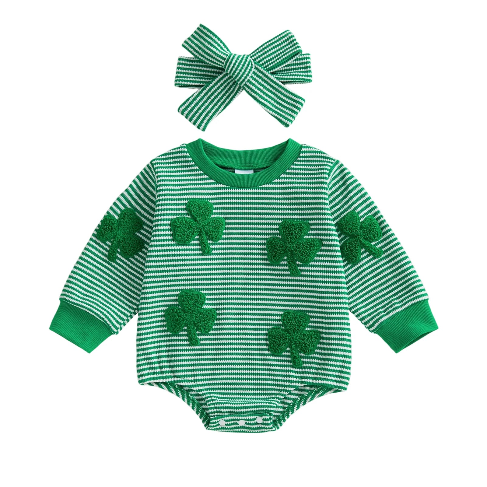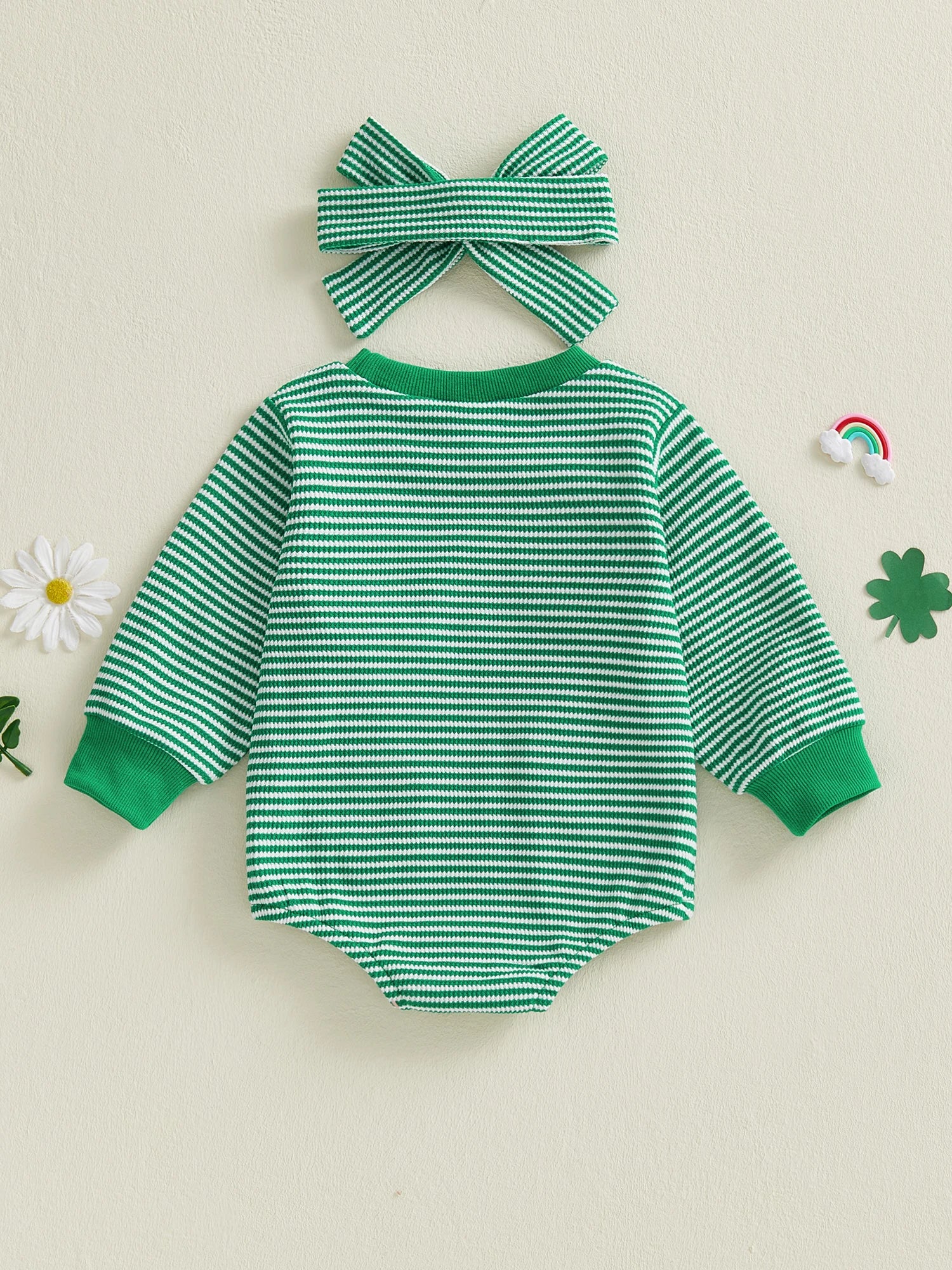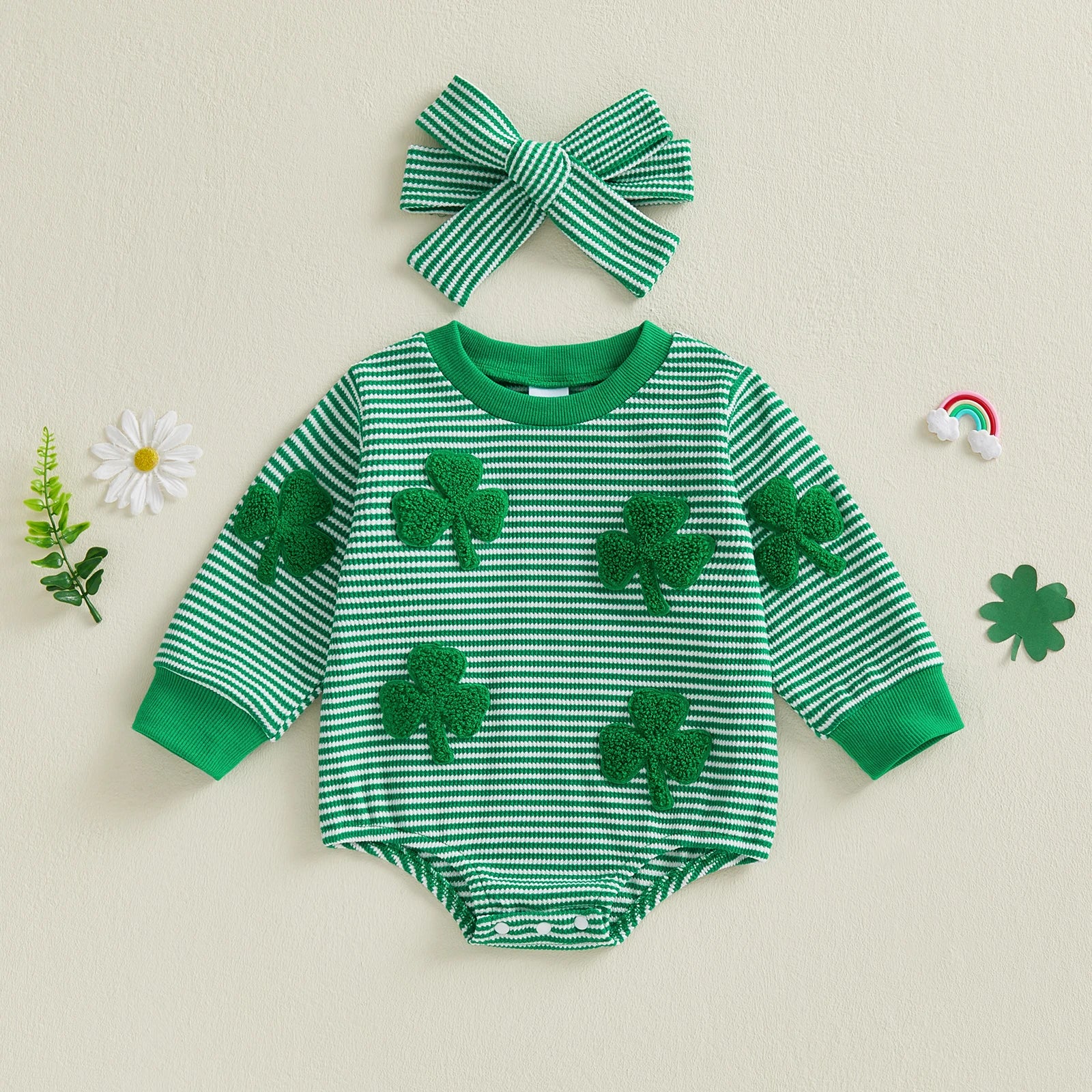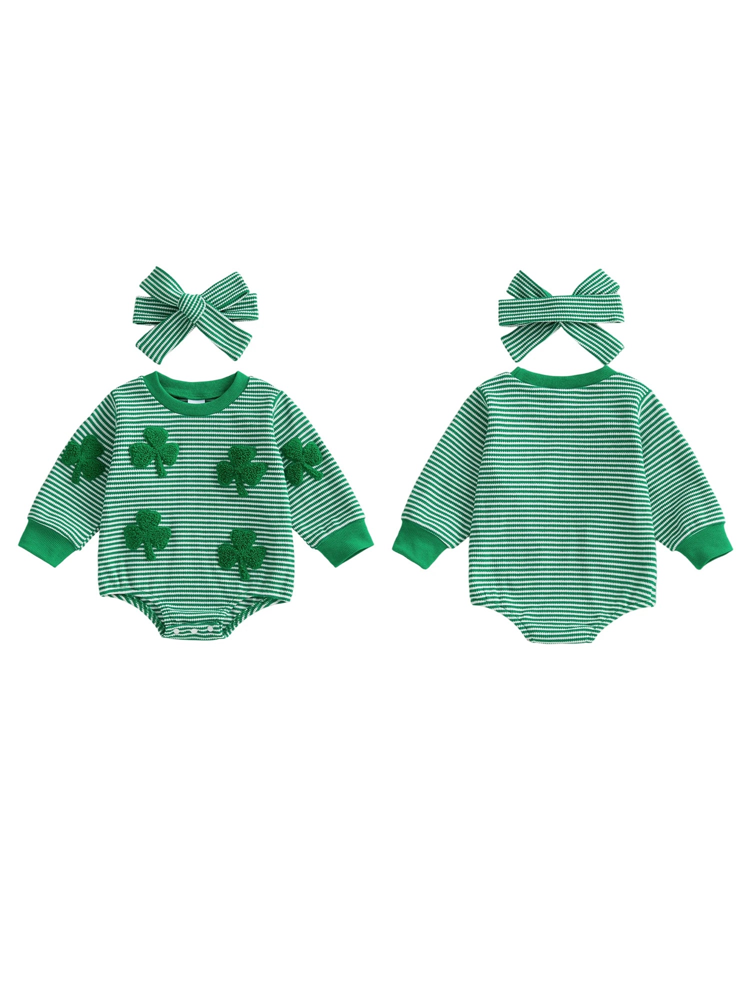 Baby Girl 2Pcs Spring Romper Stripe Shamrock Embroidery Long Sleeve Round Neck Jumpsuit with Headband St. Patrick's Day Set