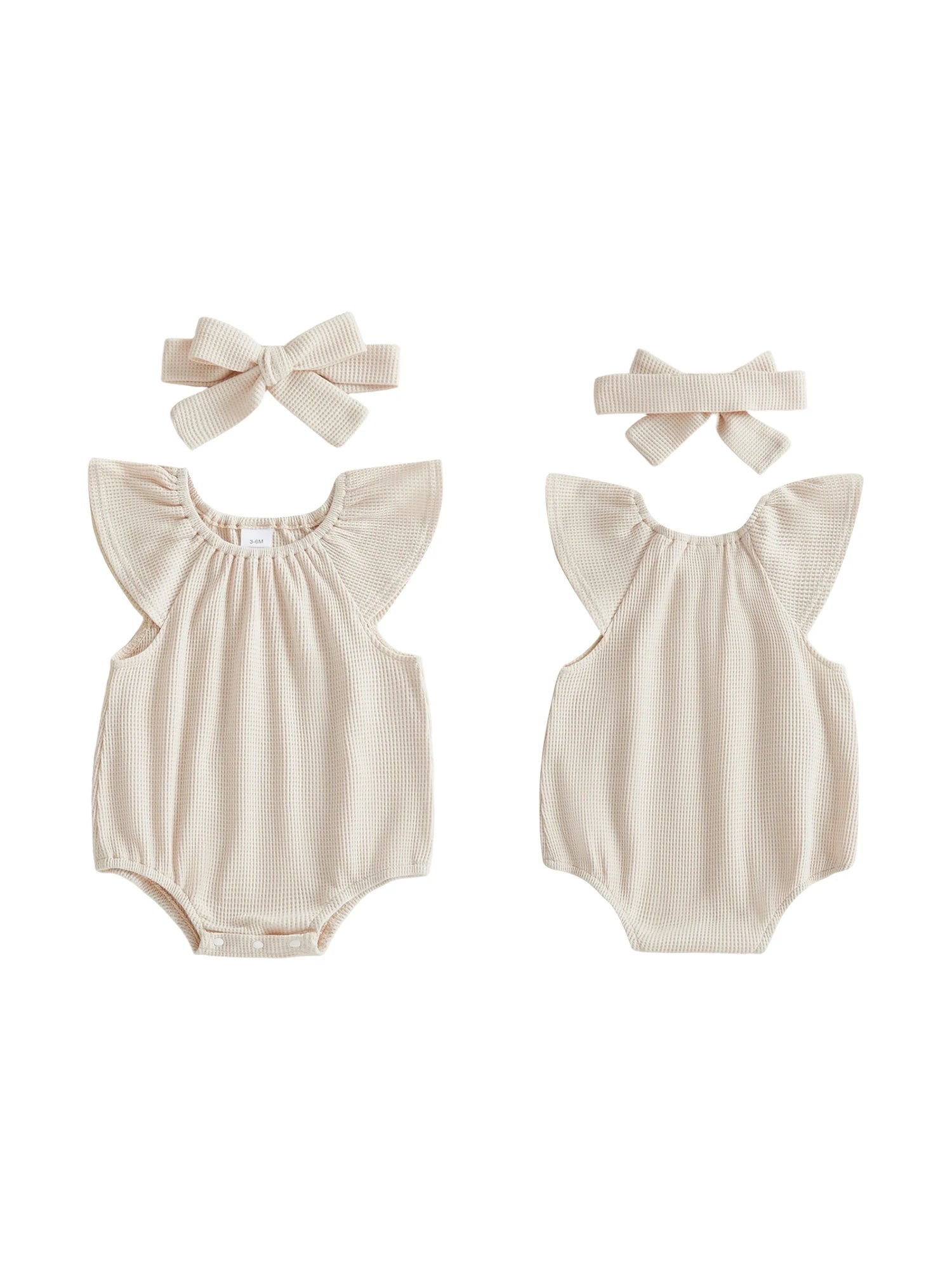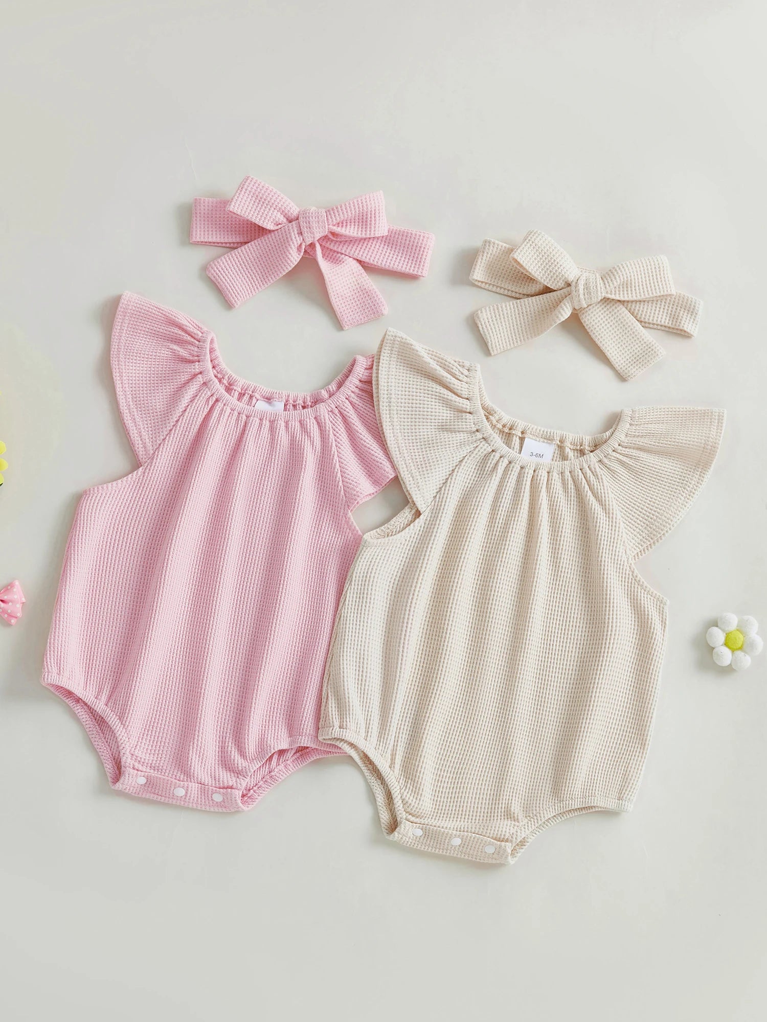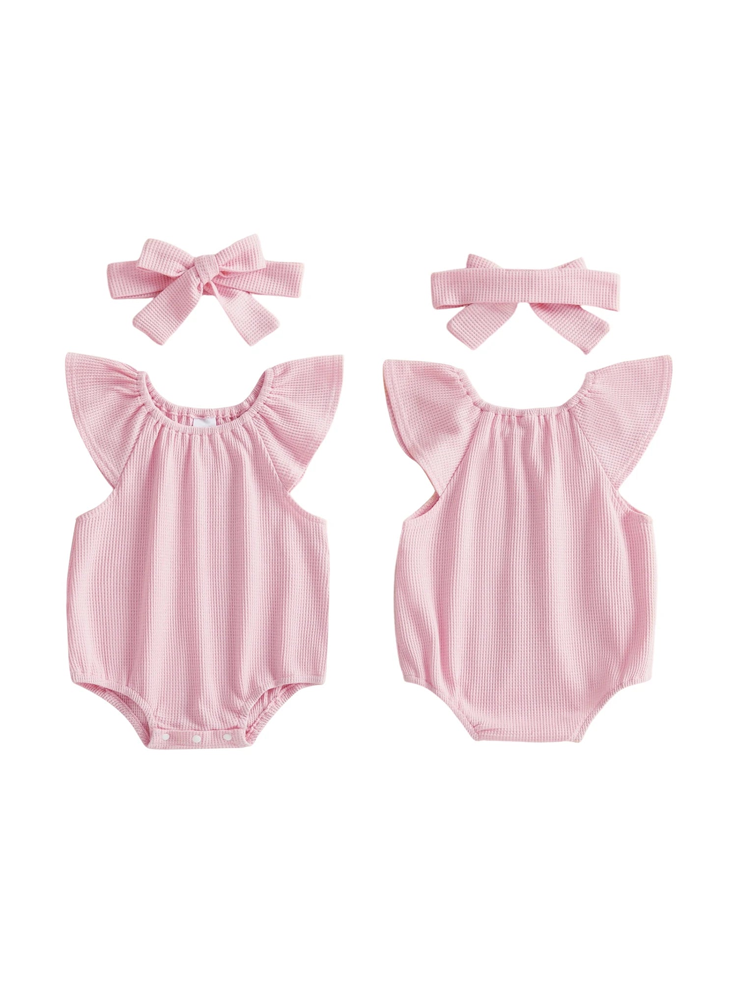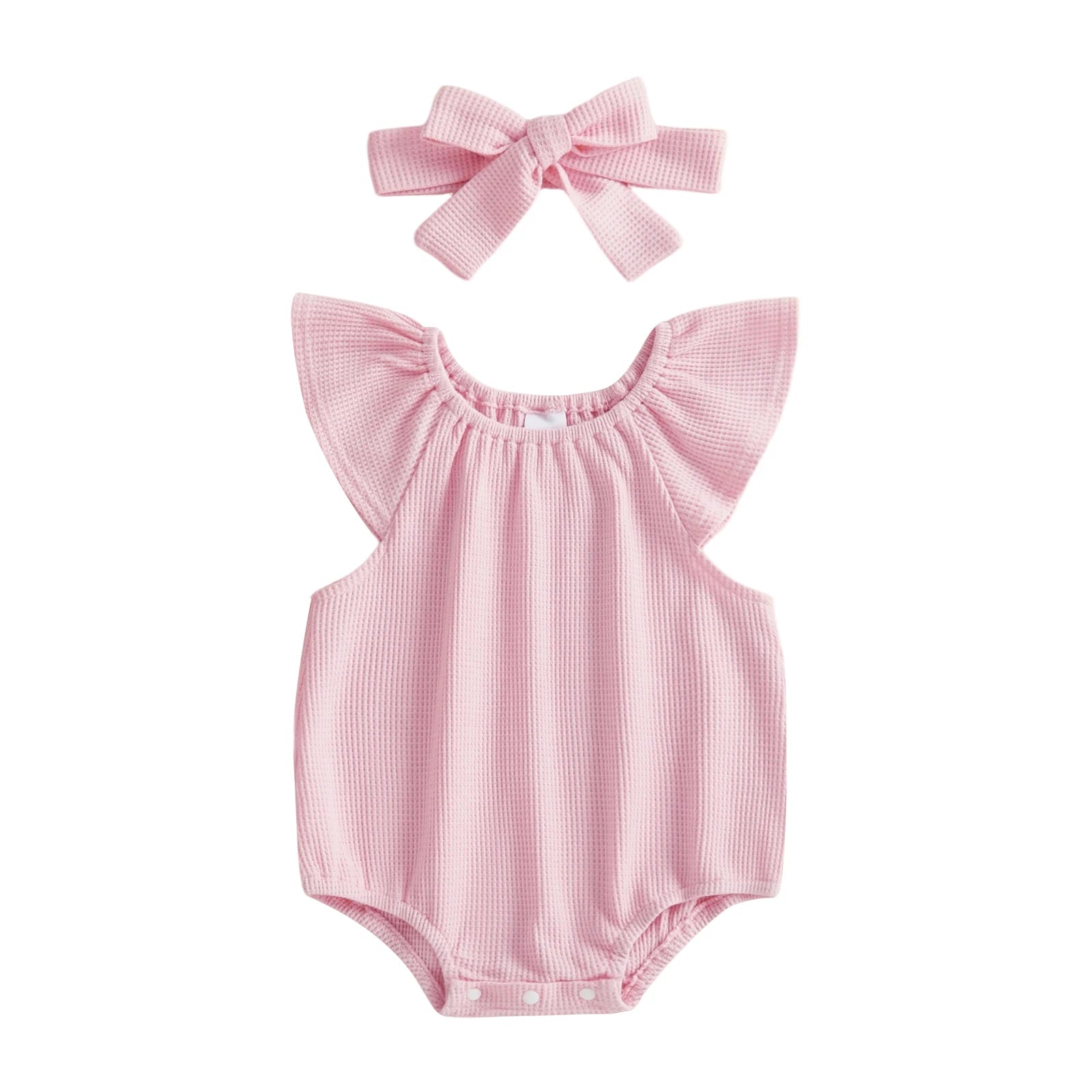 Baby Girl 2Pcs Spring Summer Waffle Romper Short Flying Sleeve O Neck Solid Color Romper with Headband Set