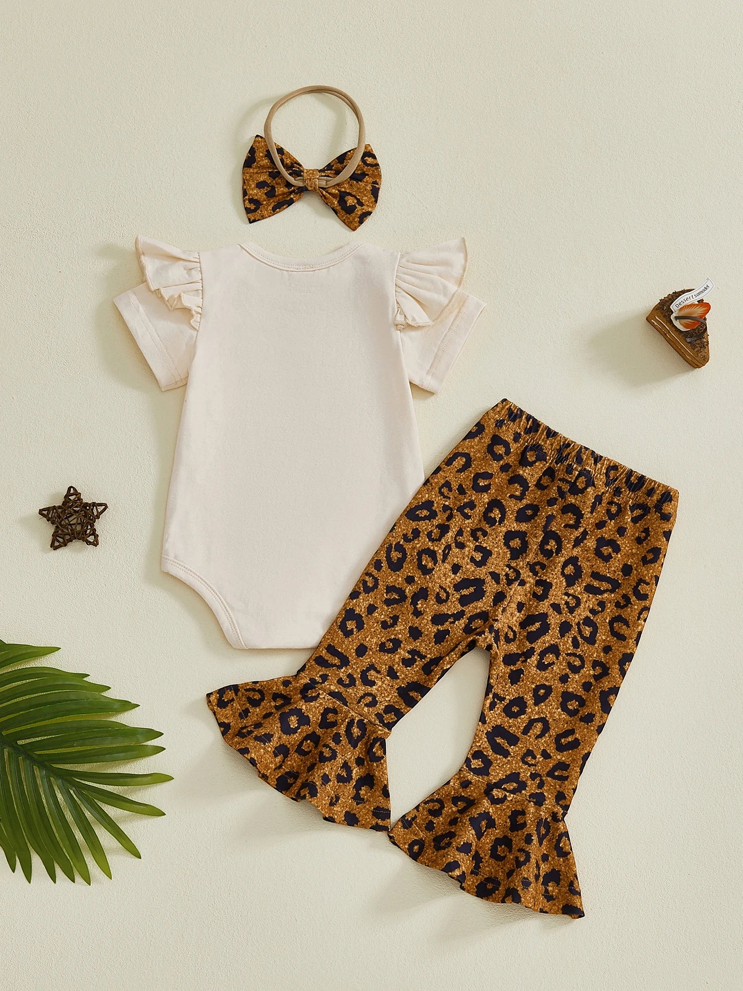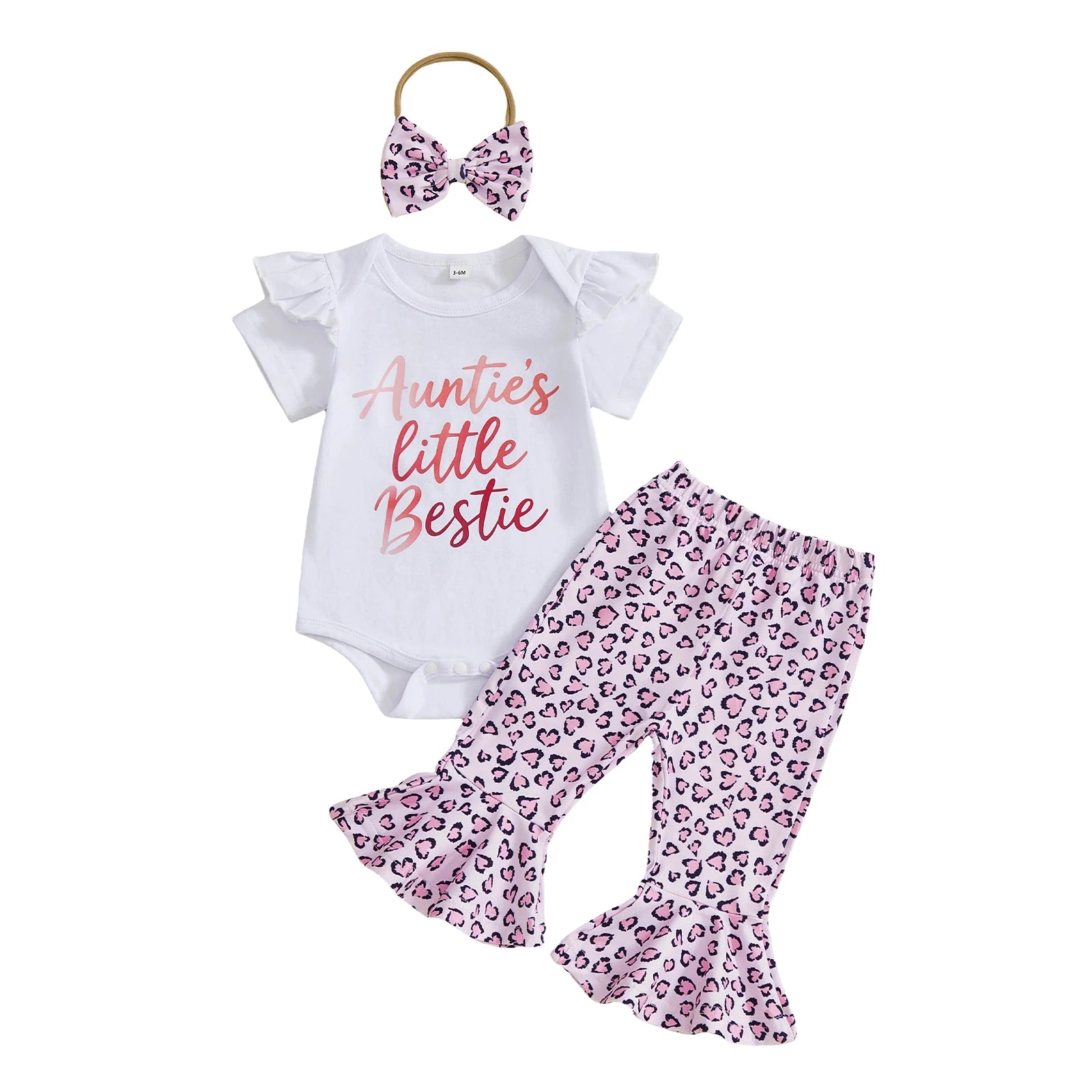 Baby Girl 3Pcs Auntie's Little Bestie Spring Outfits Letter Short Sleeve Romper with Leopard Pattern Flare Pants and Bow Headband Set