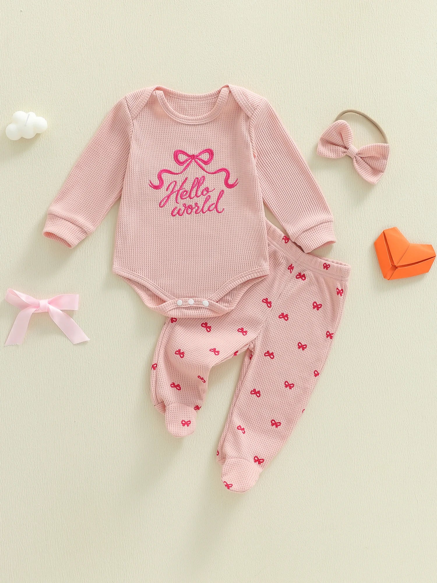 Baby Girl 3Pcs Hello World Spring Outfits Waffle Bow Letter Embroidered Long Sleeve Romper Footie Pants and Bow Headband 3 Pcs Set