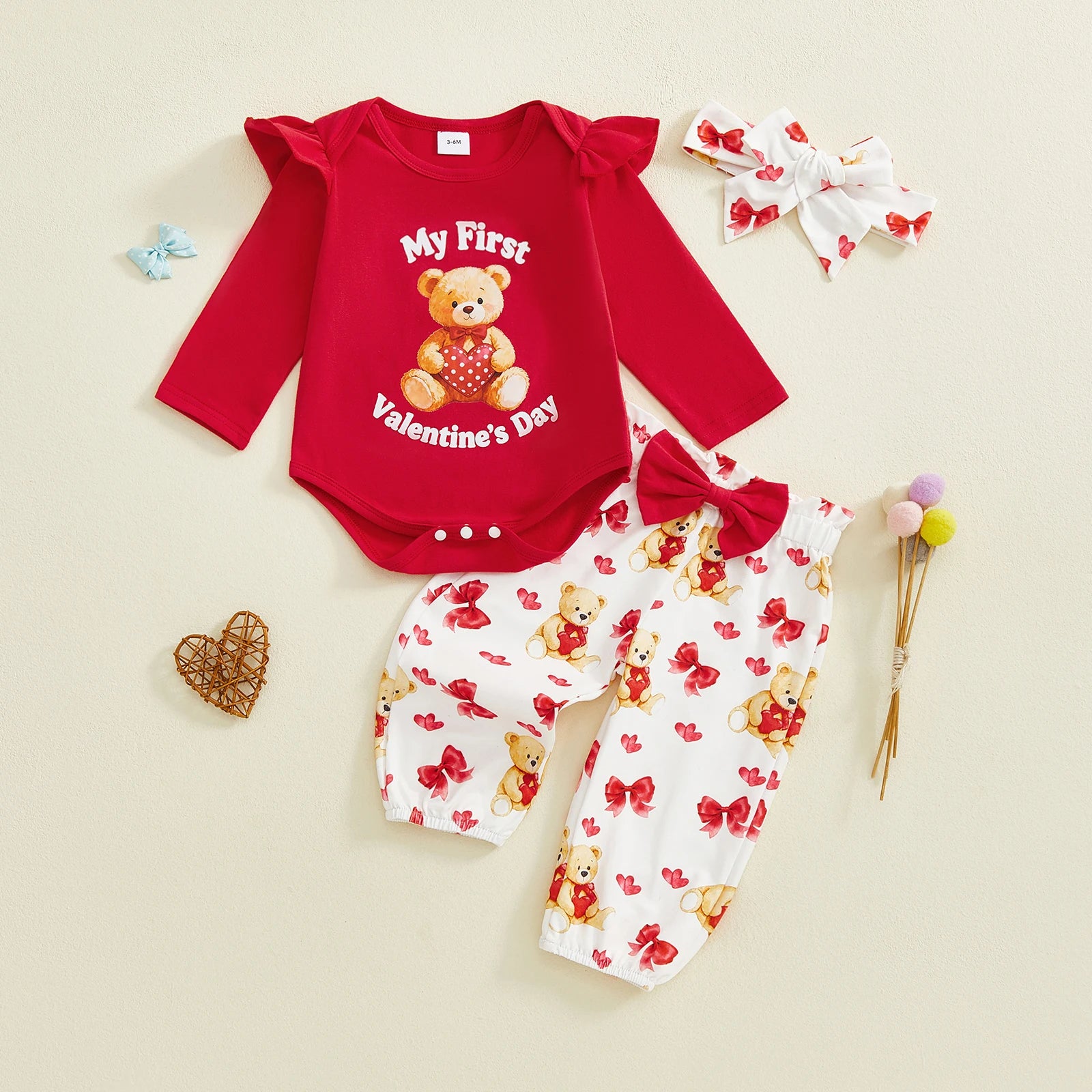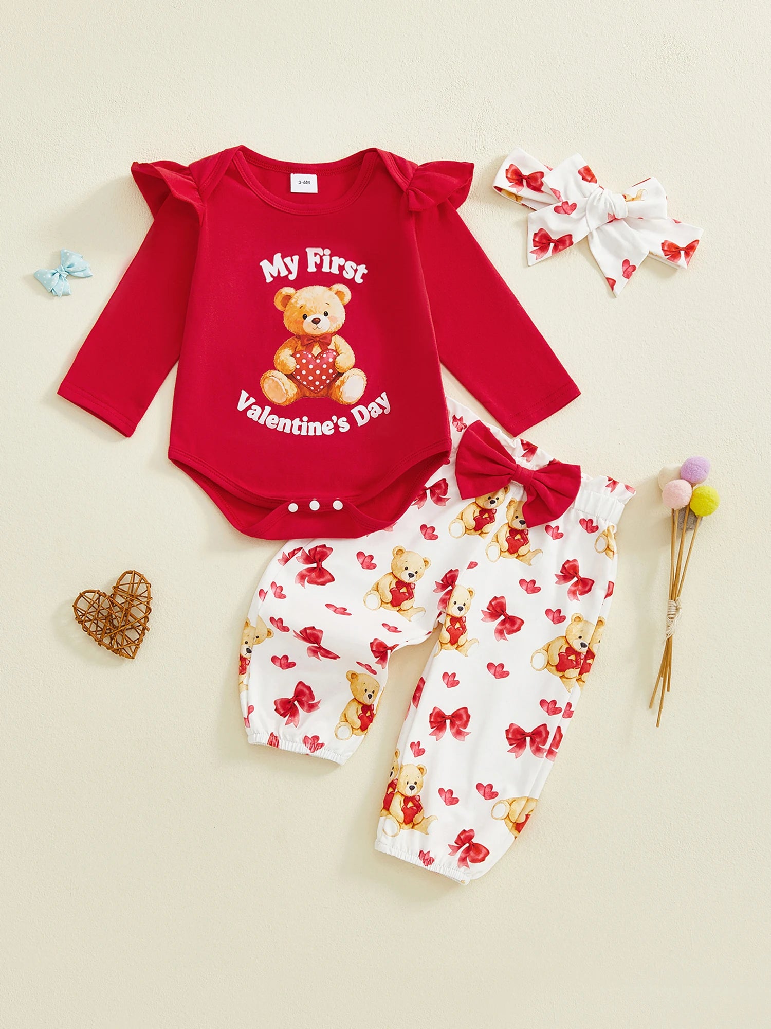 Baby Girl 3Pcs My First Valentine's Day Outfit Ruffle Long Sleeve Crew Neck Bear Print Romper Elastic Waist Pants and Headband Set