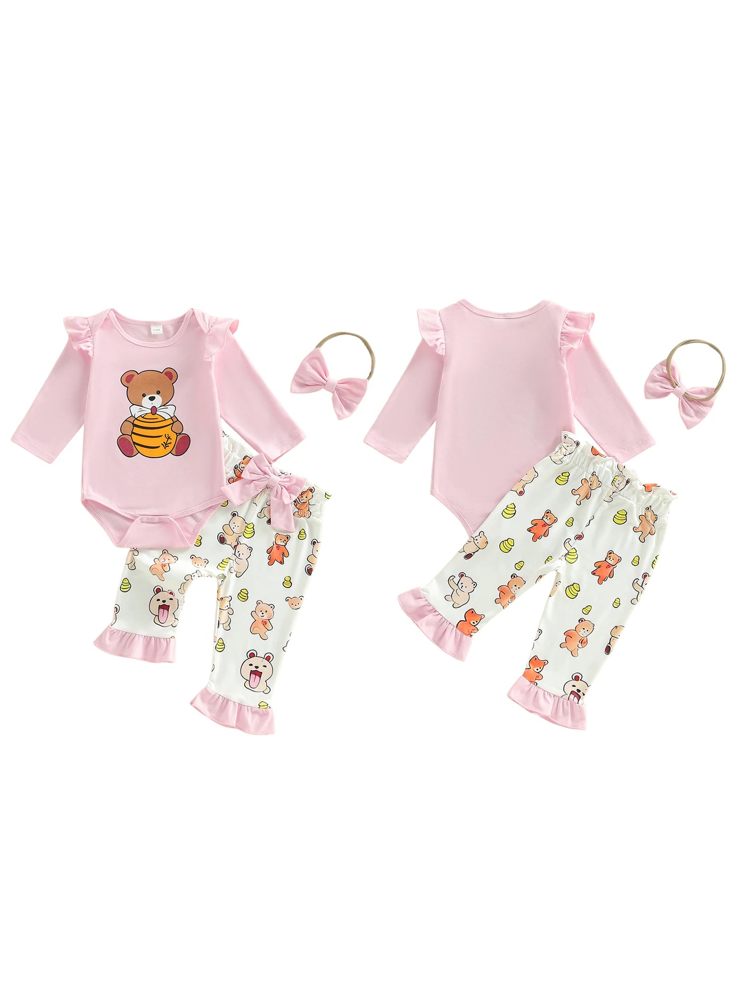 Baby Girl 3Pcs Spring Outfit Honey Bear Long Sleeve Romper Ruffle Pants and Bow Headband 3 Piece Set