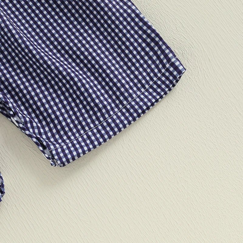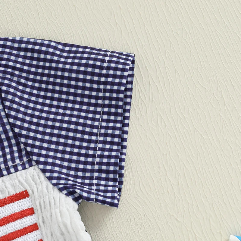 Baby Girl 4th of July Romper Smocked Plaid Pattern American Flag Embroidery Ruffled Doll Collar Short Sleeve Jumpsuit