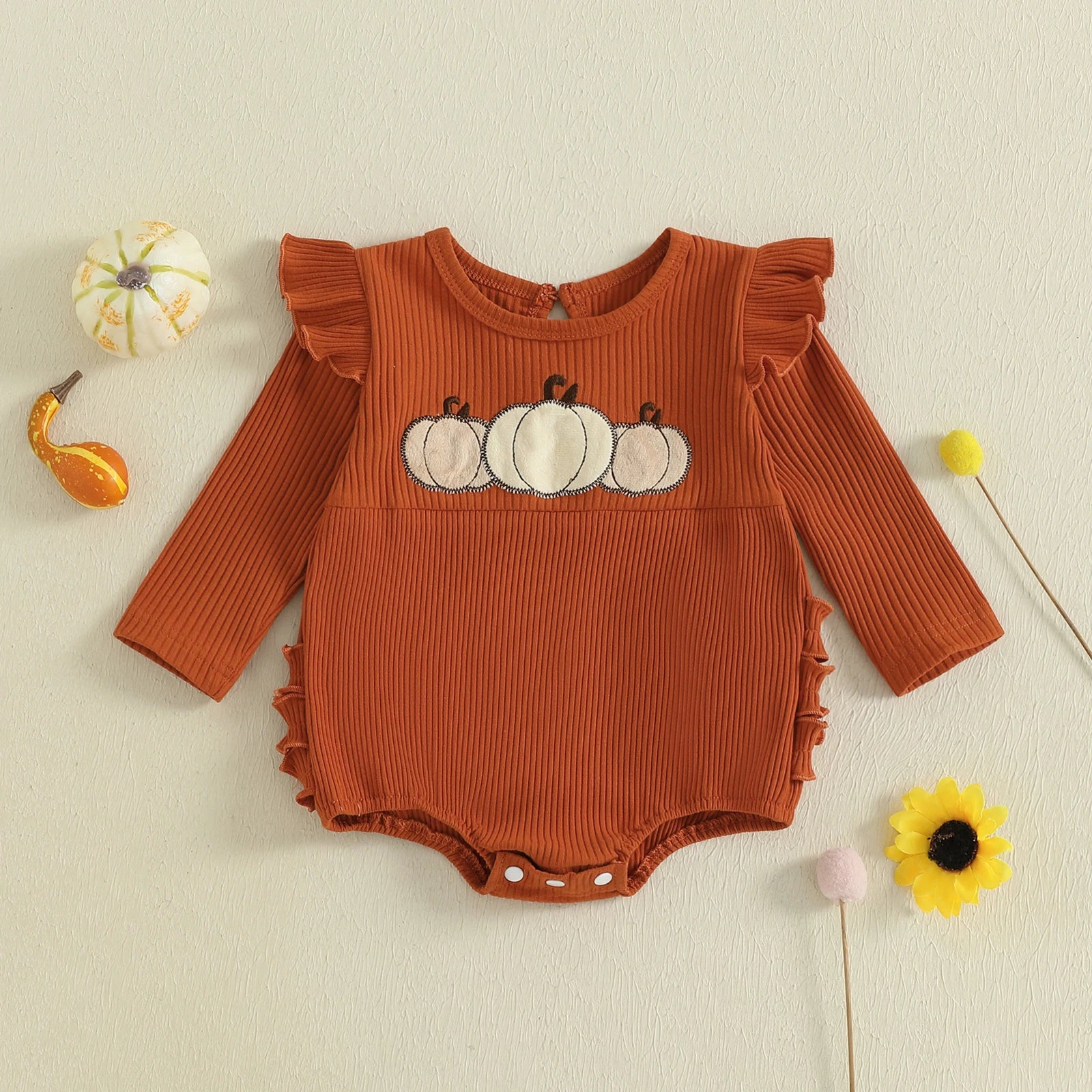 Baby Girl Pumpkin Embroidered Jumpsuit Halloween Fall Long Sleeve Round Neck Ruffle Romper