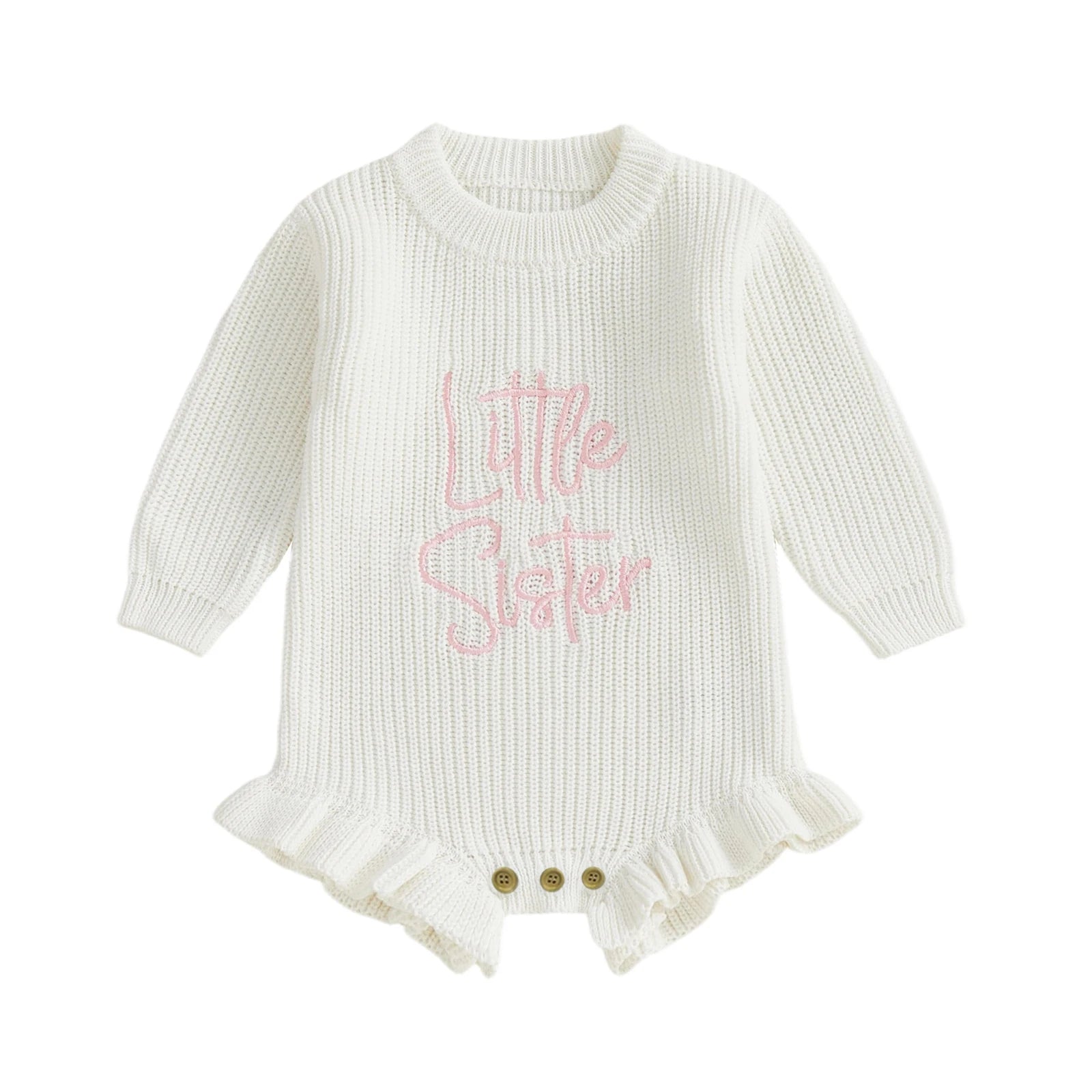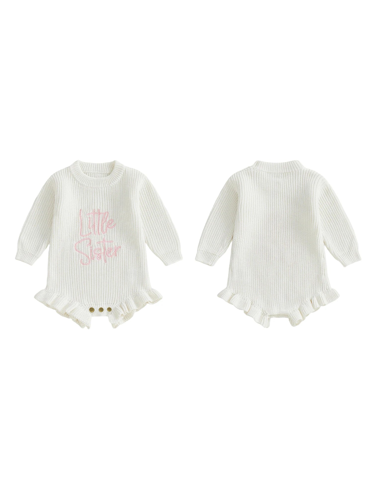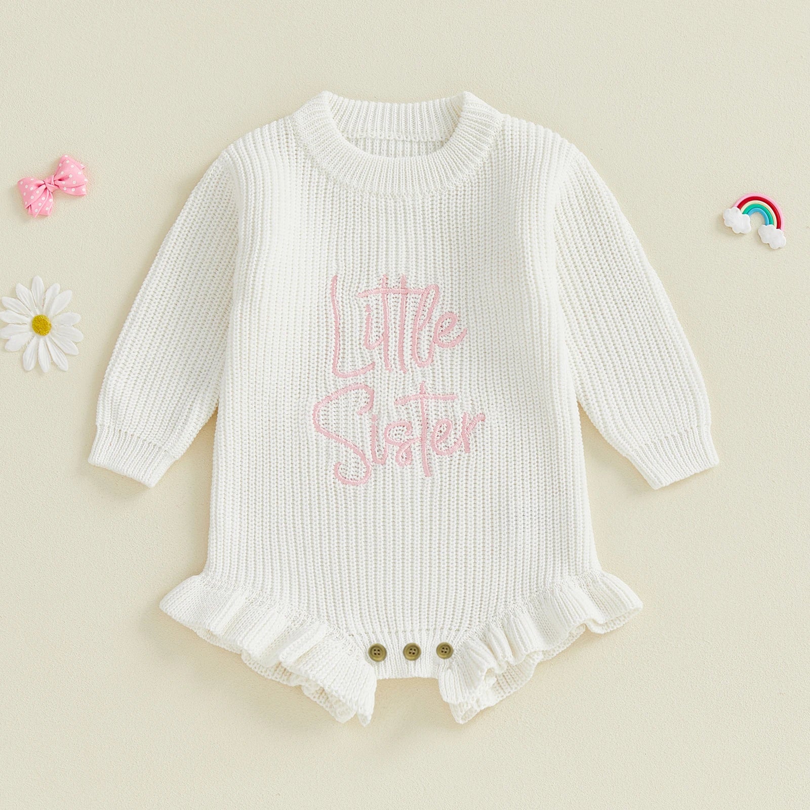Baby Girl Sweater Romper Little Sister Long Sleeve Round Neck Letter Embroidery Knit Bodysuit