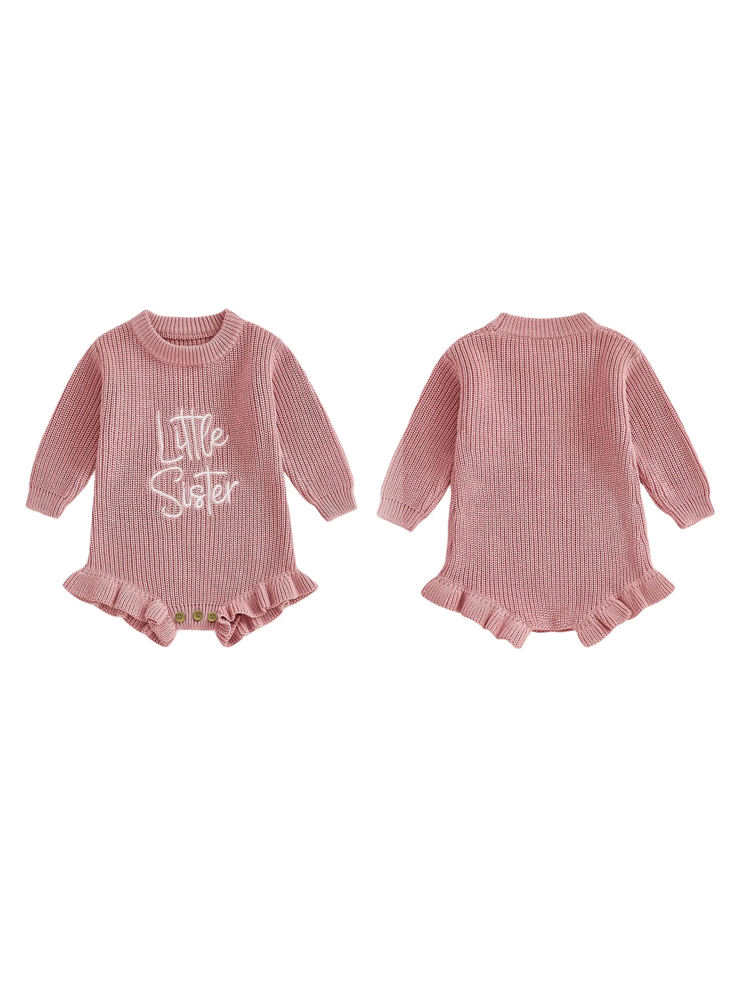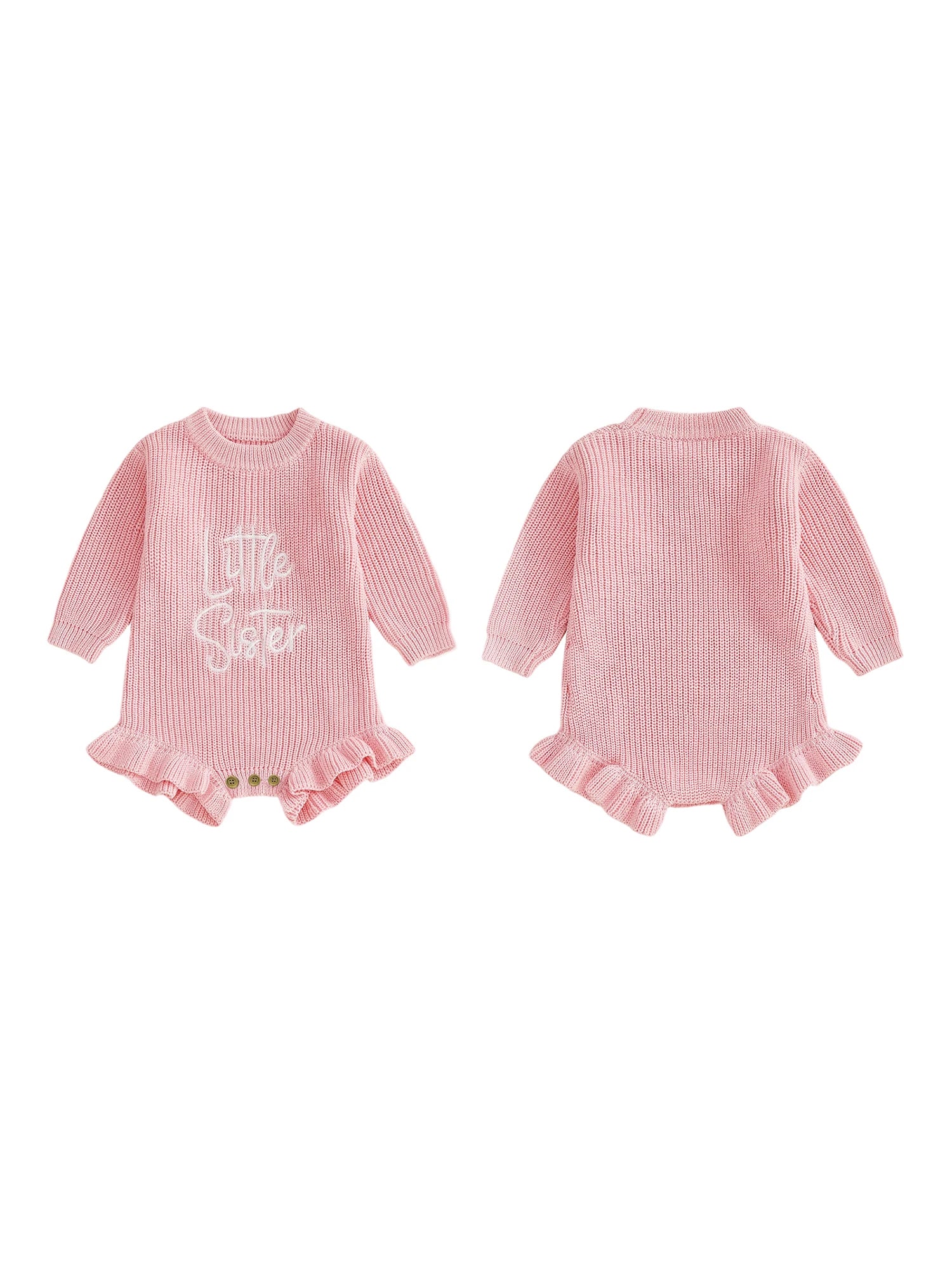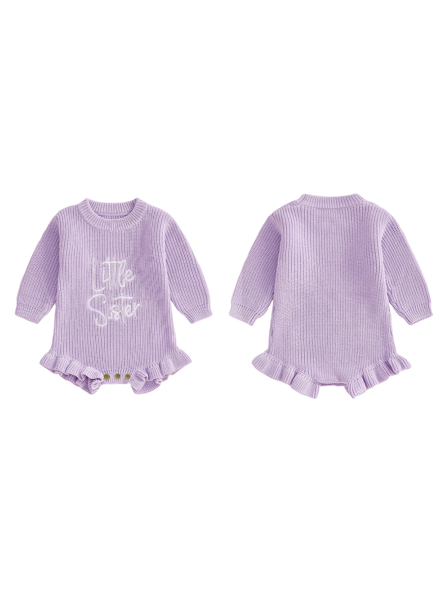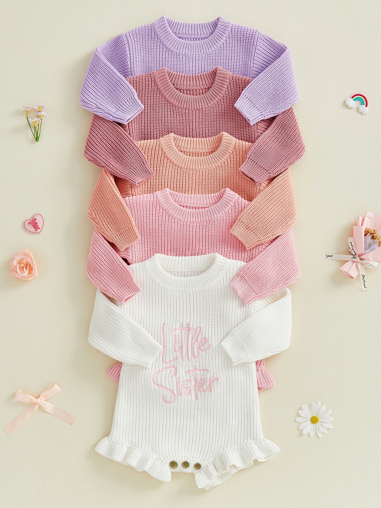 Baby Girl Sweater Romper Little Sister Long Sleeve Round Neck Letter Embroidery Knit Bodysuit