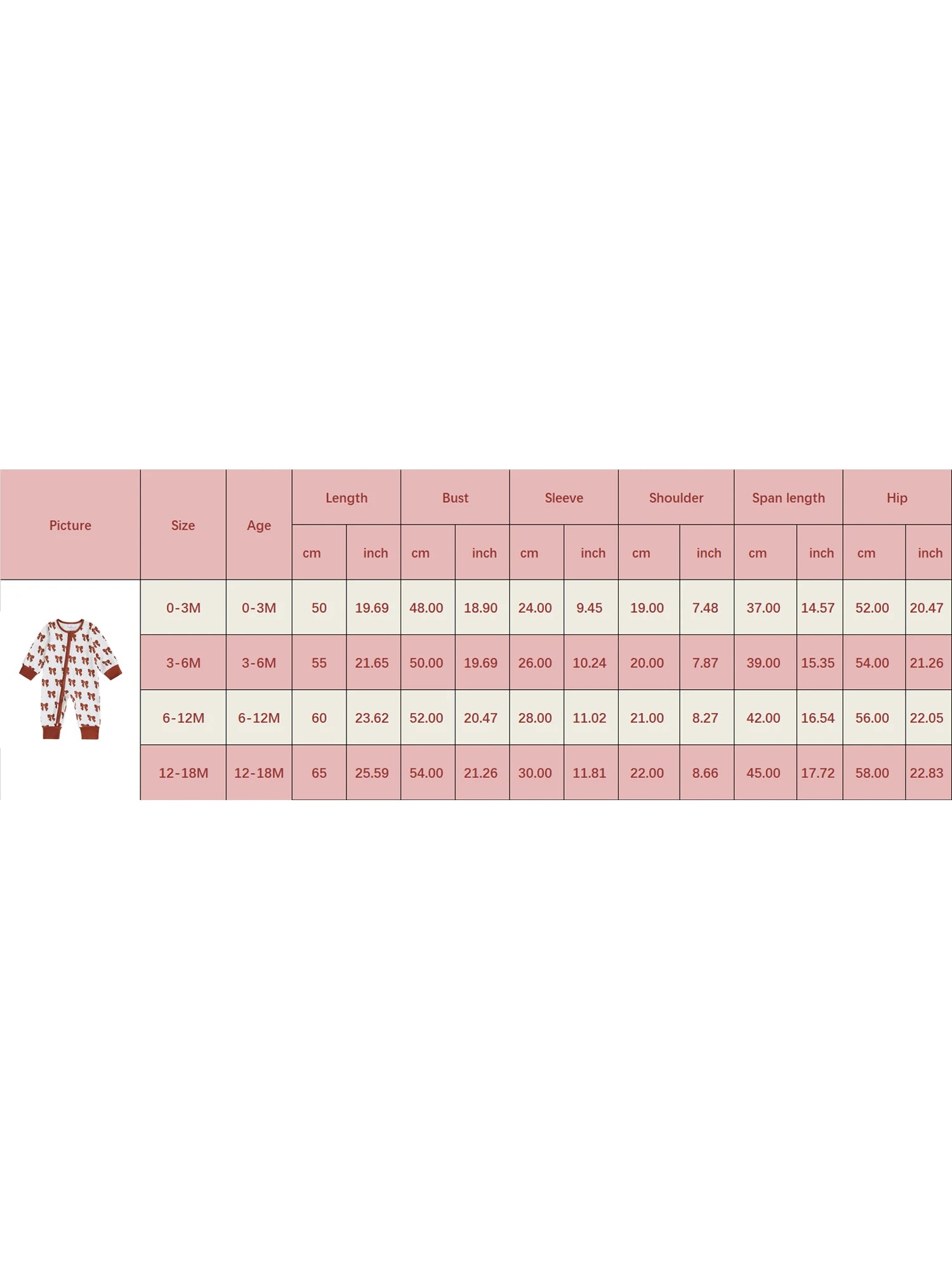 0-3M Length: 19.69 Bust: 18.90 Sleeve: 9.45 Shoulder: 7.48 Span Length: 14.57 Hip: 20.47 Advised Age: 0-3 Months