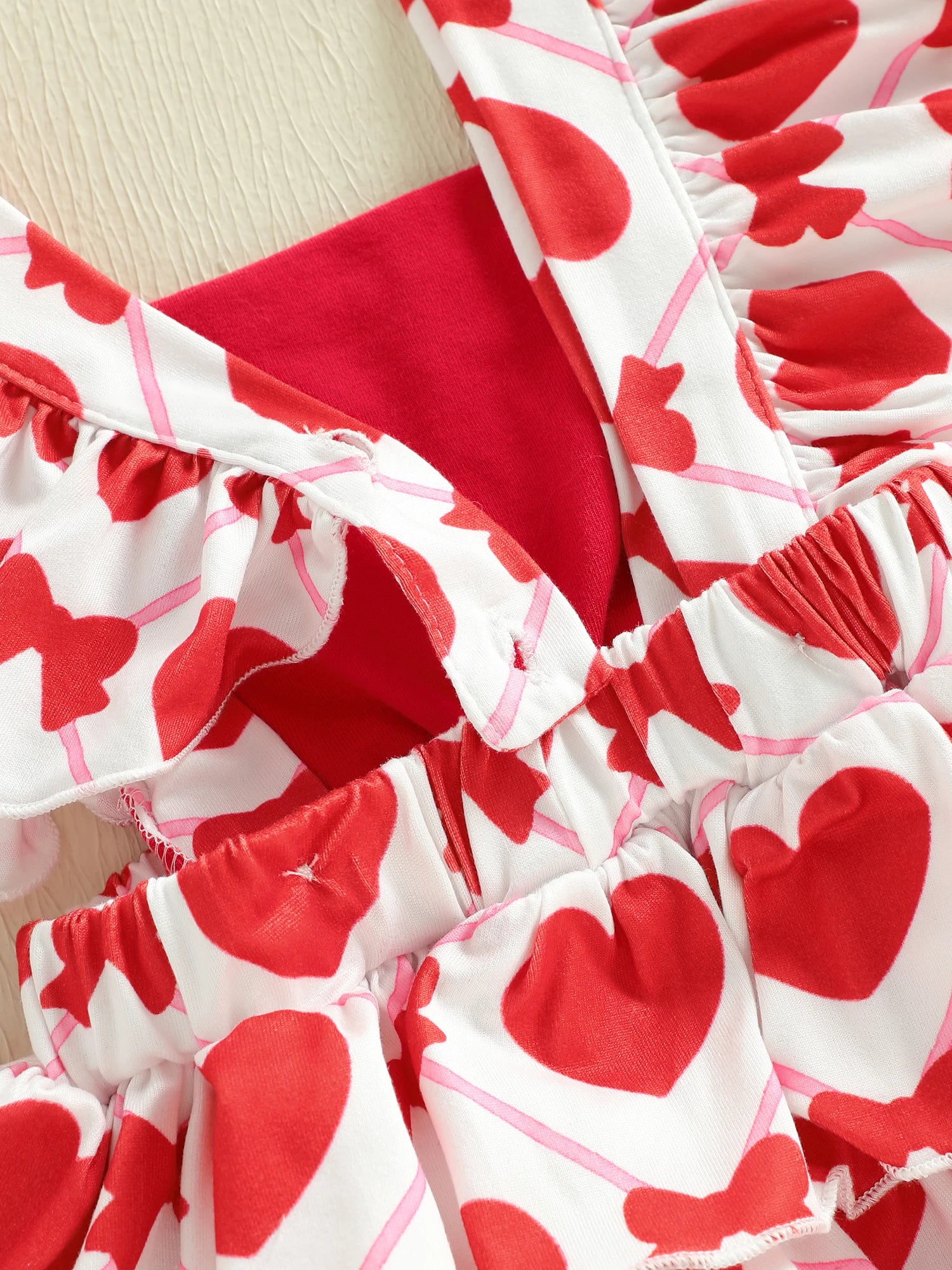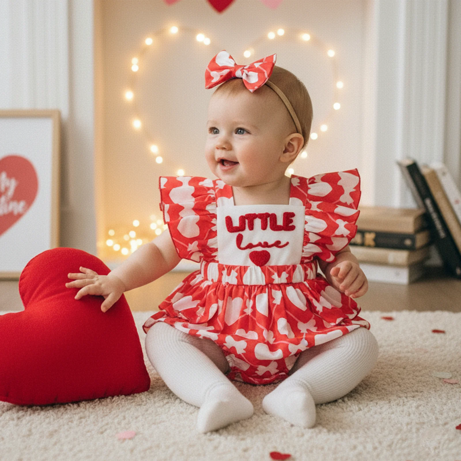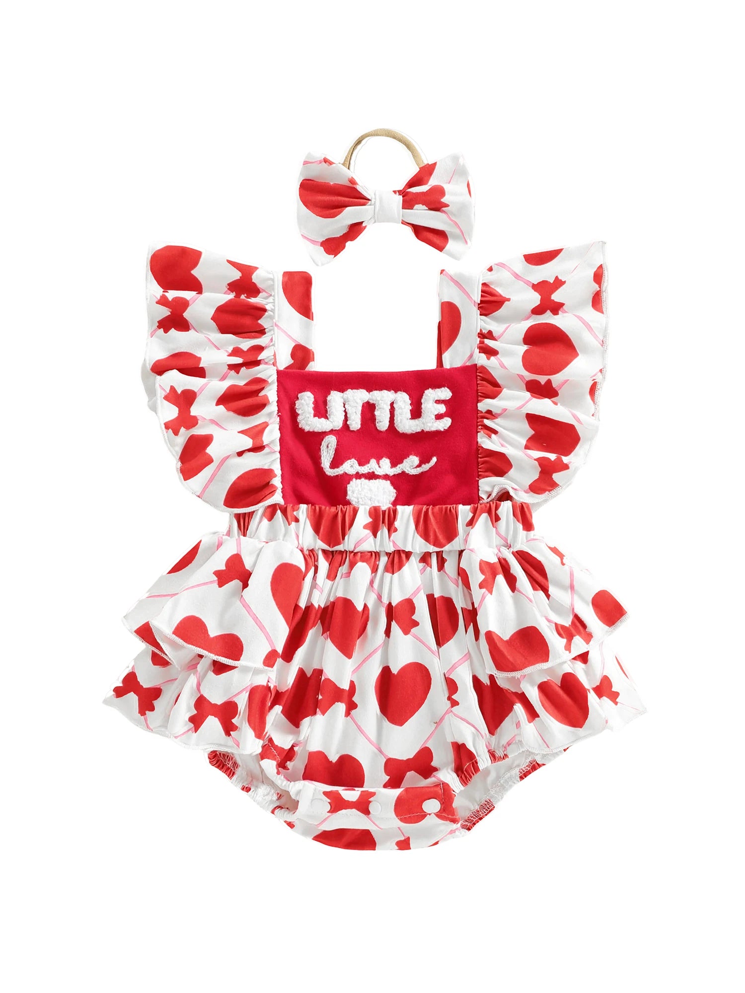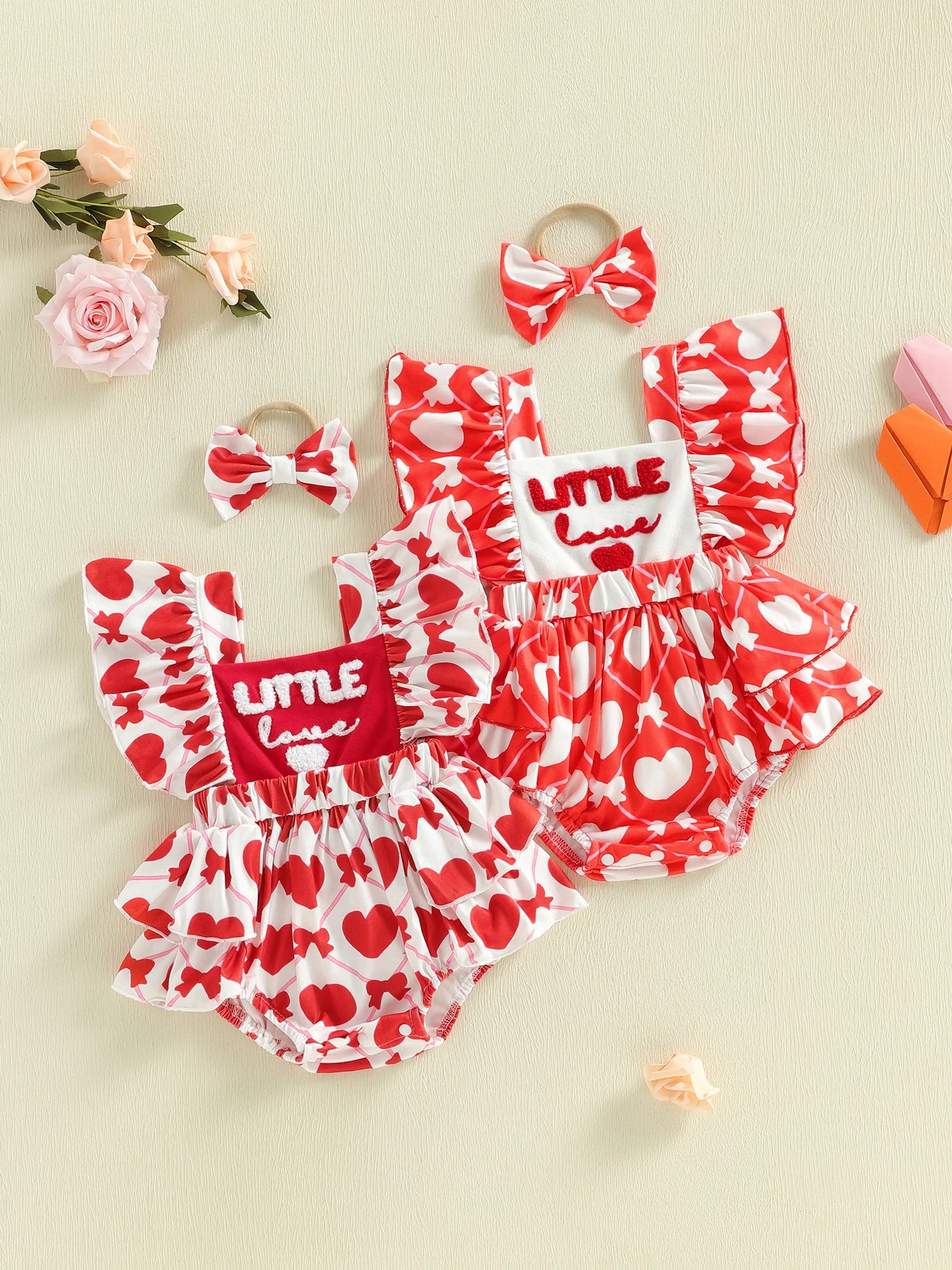 Baby Girls 2Pcs Little Love Valentine's Day Romper Flutter Sleeve Letter Embroidery Heart Print Jumpsuits with Bow Headband Set
