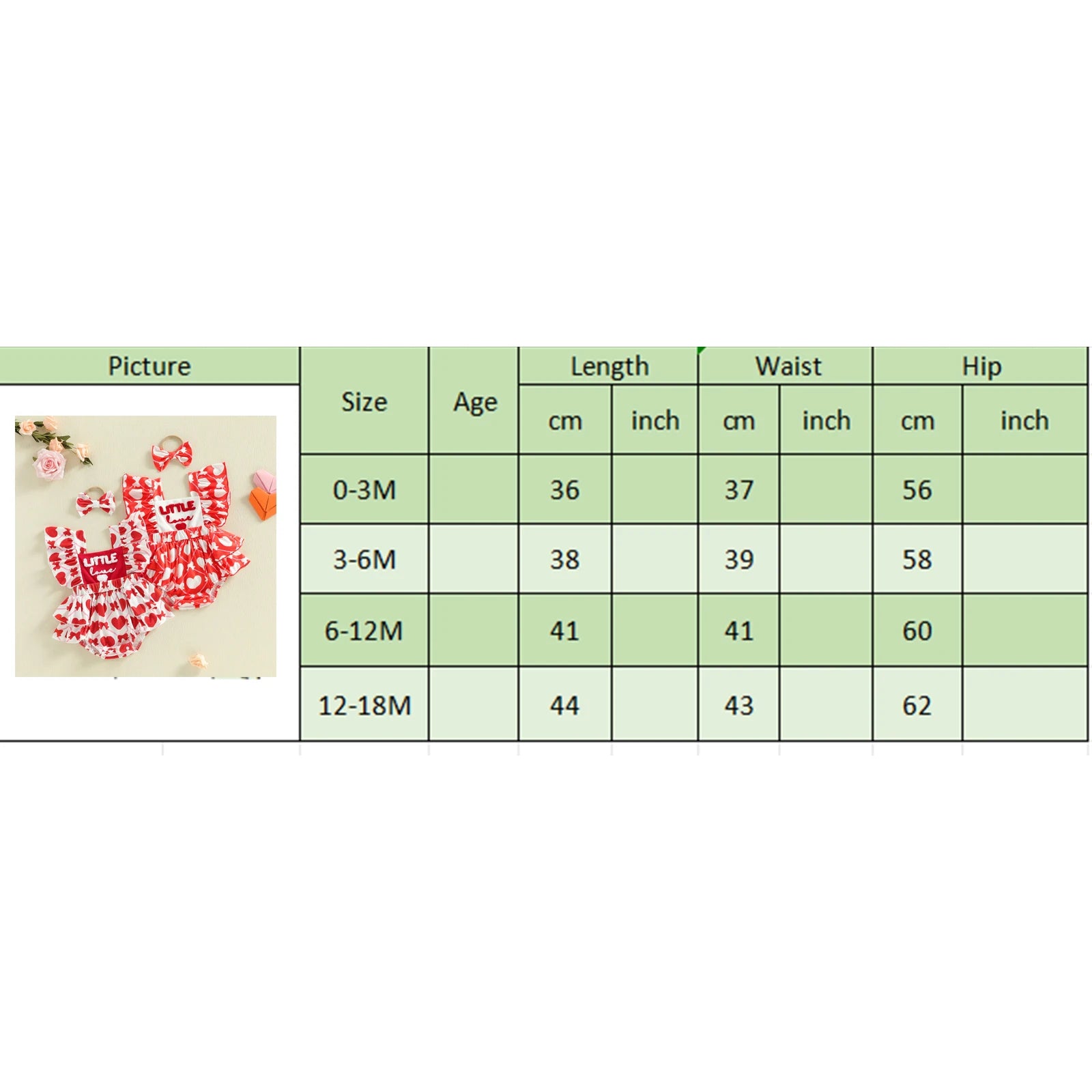3-6M Length: 14.96 Waist: 15.35 Hip: 22.83 Advised Age: 3-6 Months