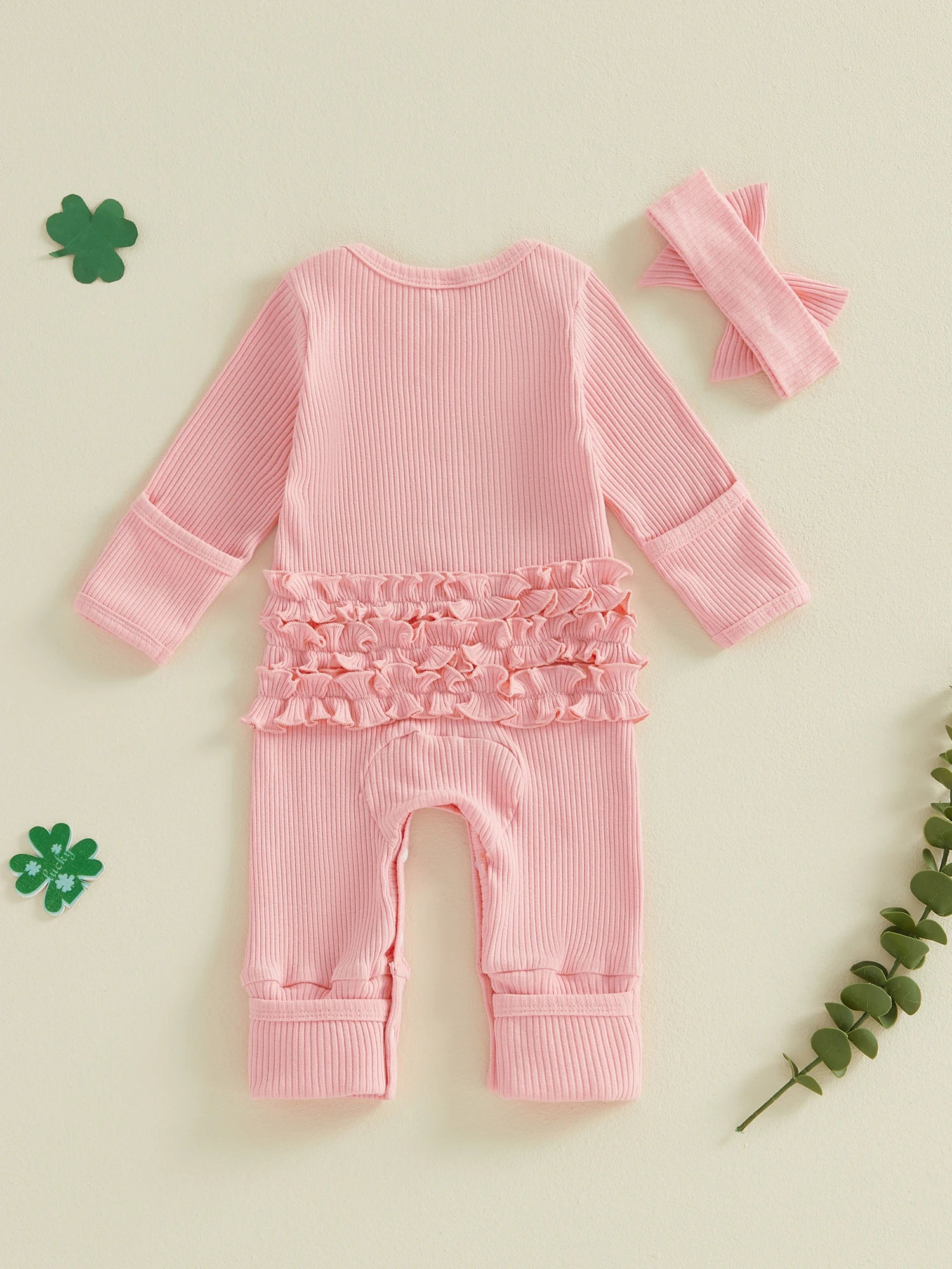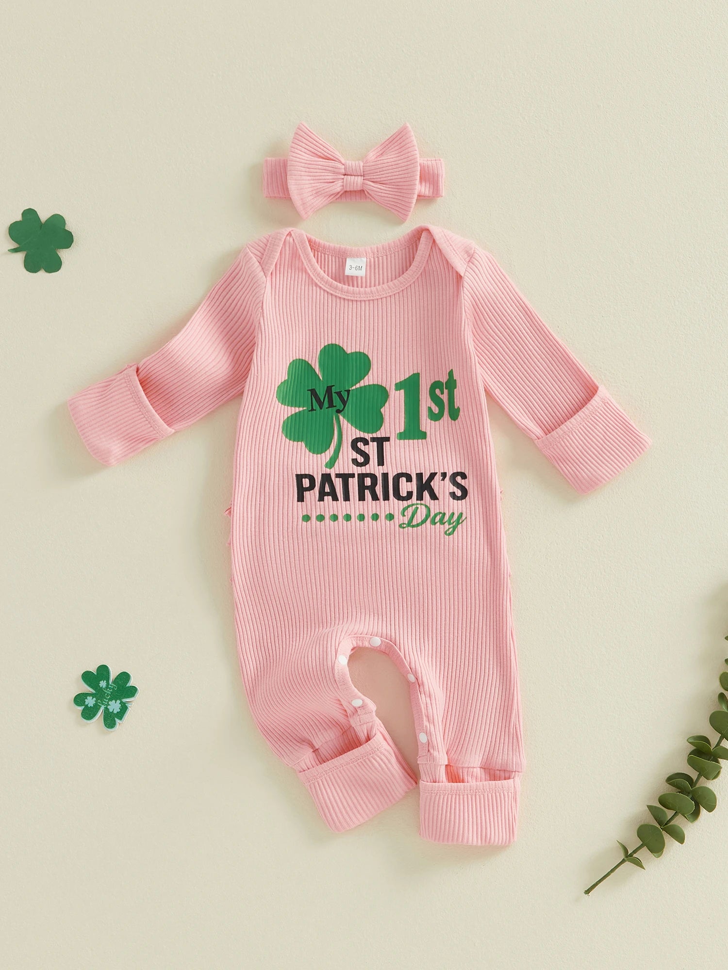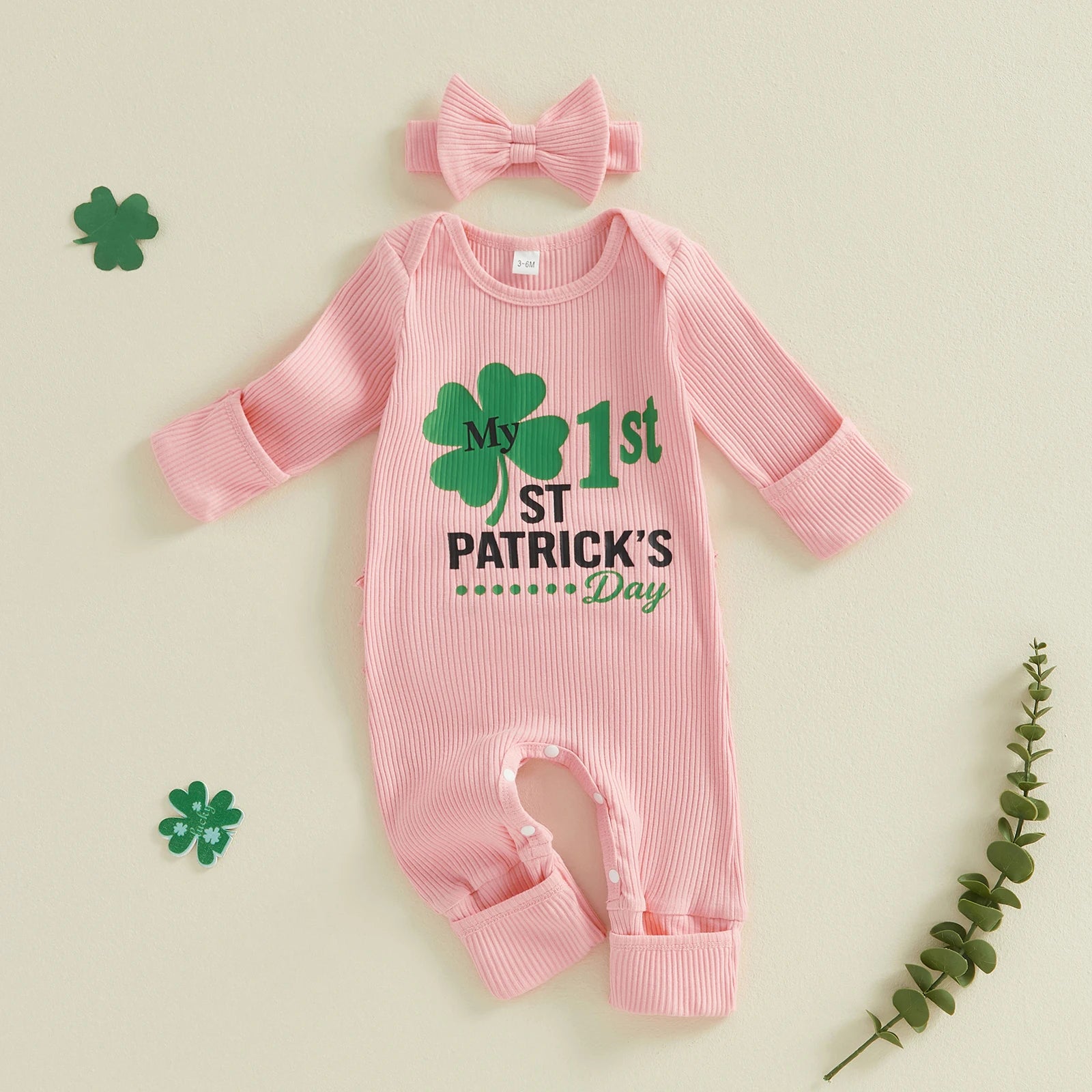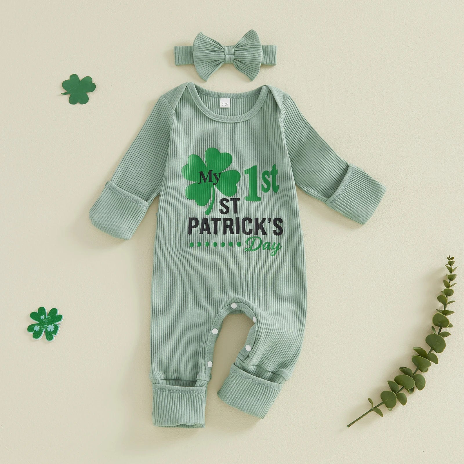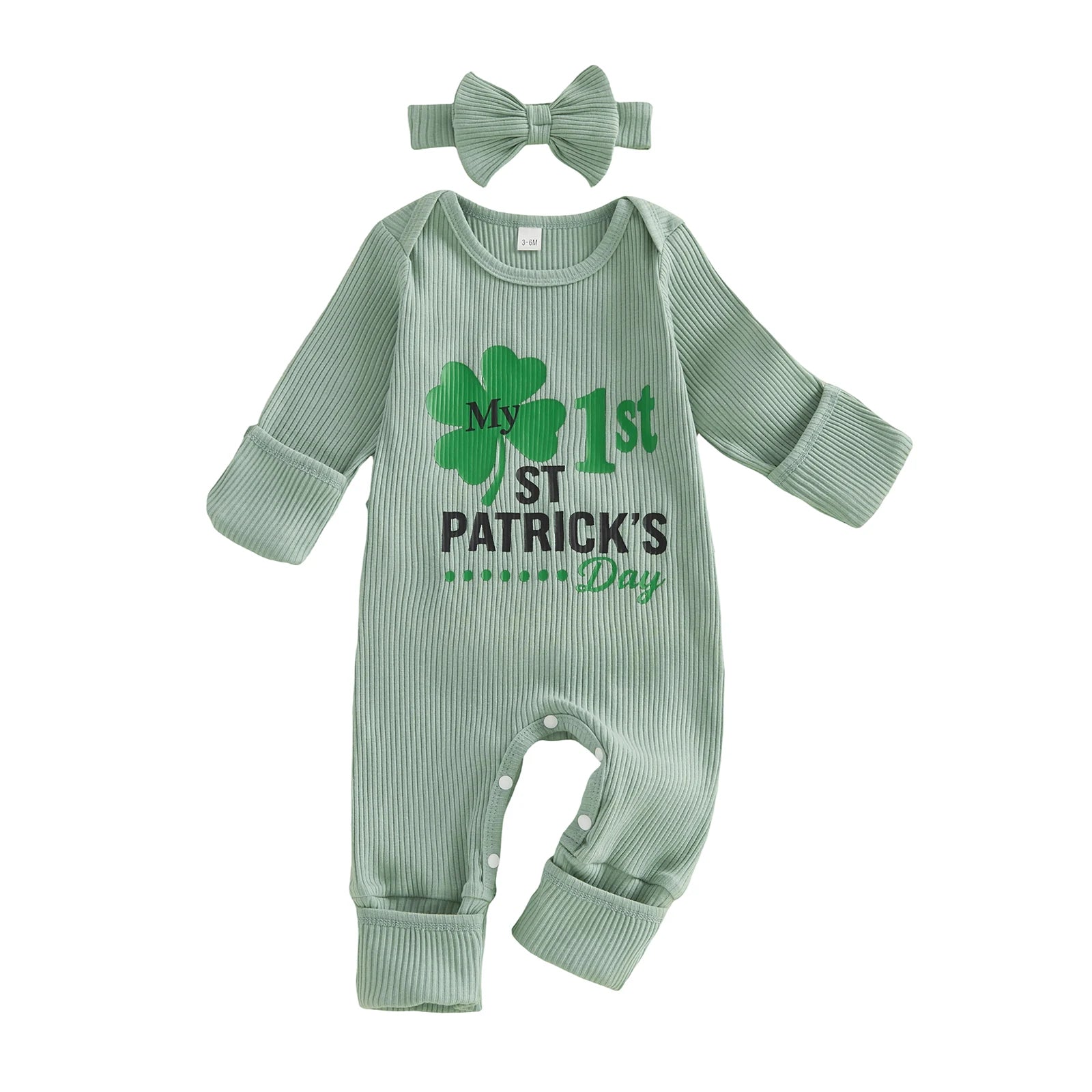 Baby Girls 2Pcs My 1st St. Patrick's Day Irish Romper Clover Letter Print Long Sleeve Round Neck Ribbed Jumpsuit with Bow Headband Set