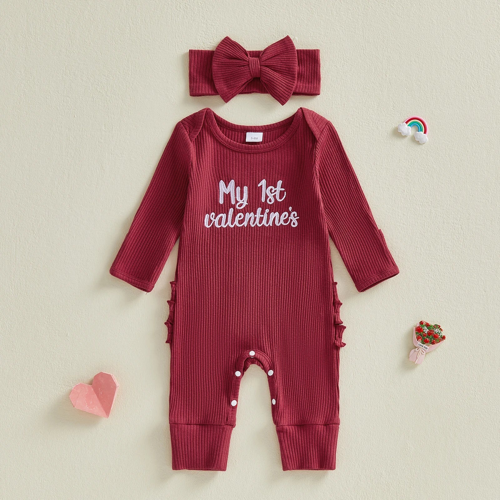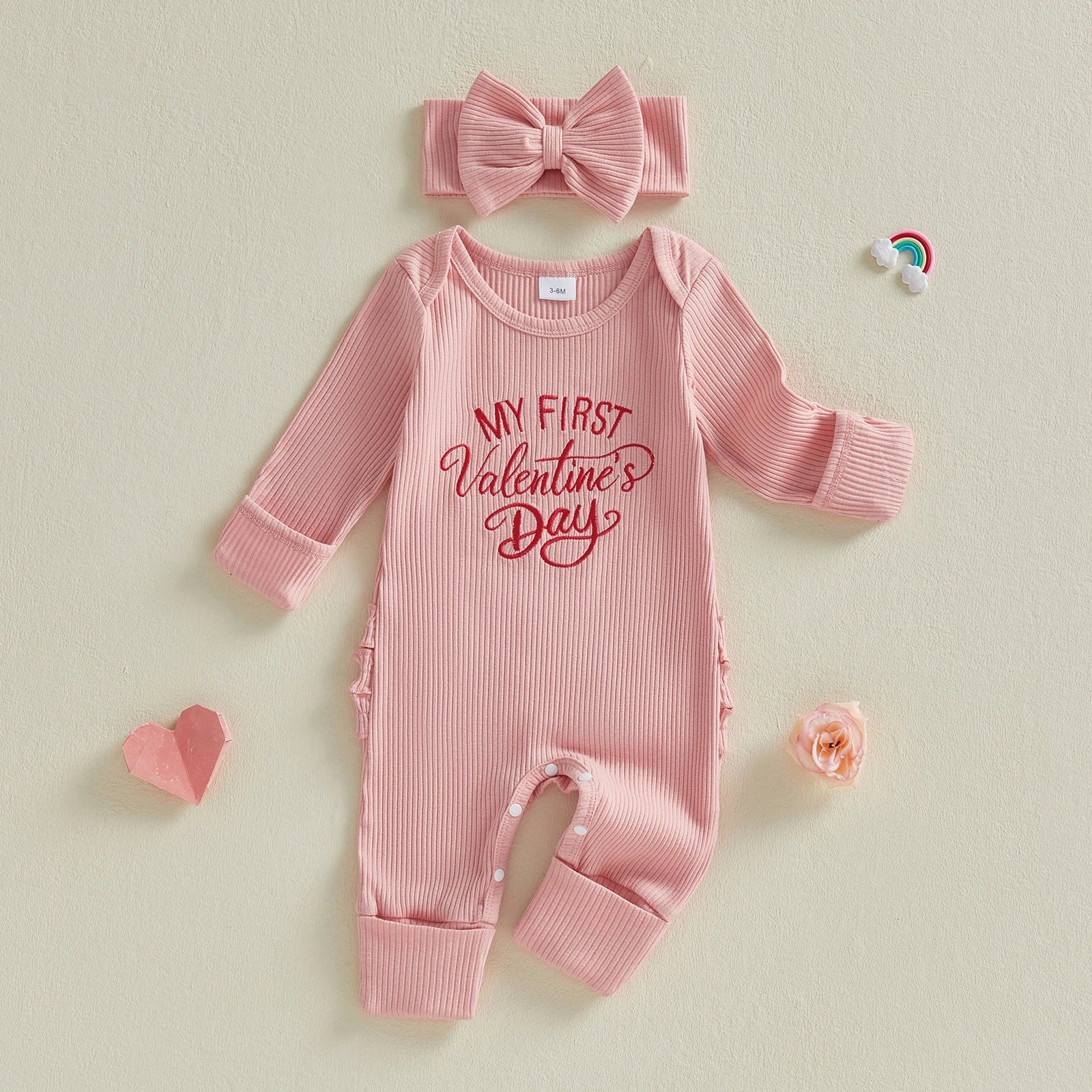 Baby Girls 2Pcs My 1st Valentine's Outfit Letter Embroidered Long Sleeve Romper and Bow Headband Set