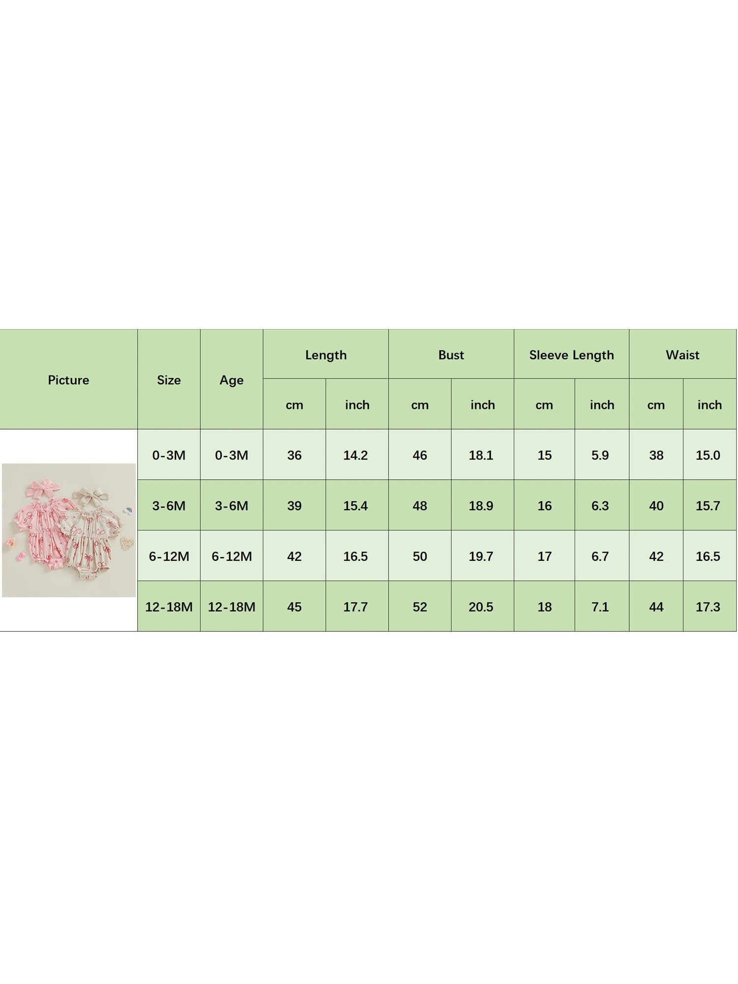 3-6M Length: 15.4 Bust: 18.9 Sleeve Length: 6.3 Waist: 15.7 Advised Age: 3-6 Months